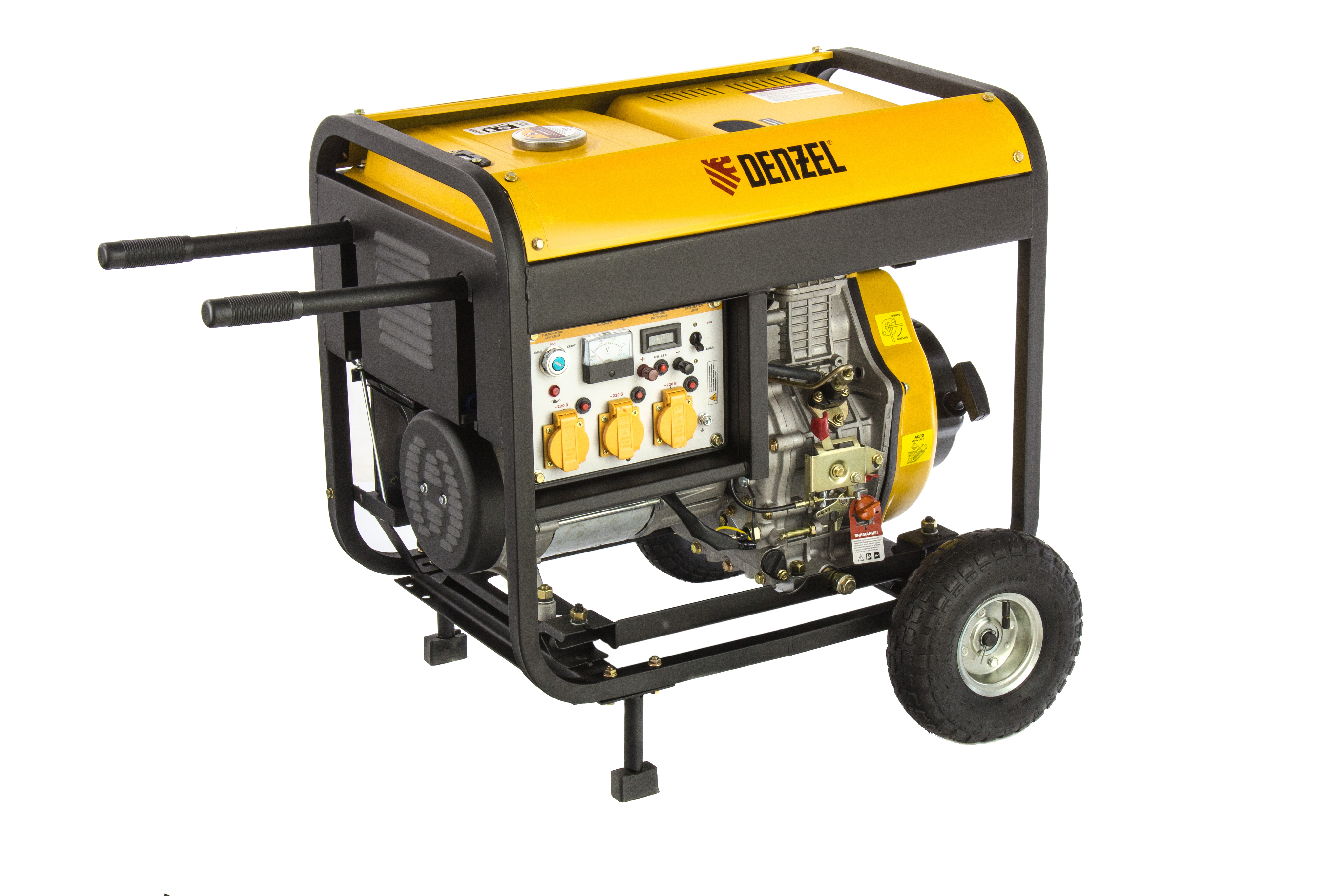 Дизельный генератор Denzel DD6300Е 94657 мощностью 5,0 кВт, 230 В / 50 Гц, с баком объемом 15 л и электростартером, предназначен для снабжения электричеством дачи, садового участка, строительной площадки, мастерской, магазина. Например, к нему можно одновременно подключить телевизор, холодильник, утюг, микроволновку, 3 лампы накаливания. Дизельный генератор потребляет меньше топлива, чем аналогичный по мощности бензиновый — бака объемом 15 л хватит на 10 часов работы.