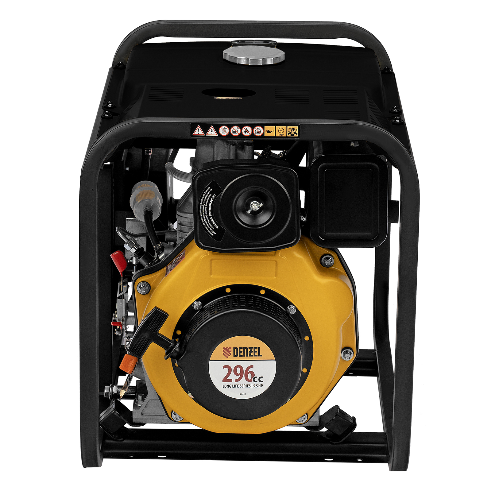 - Мобильность — к генератору можно приобрести транспортировочный комплект Denzel 94905 для перемещения по рабочей площадке.
