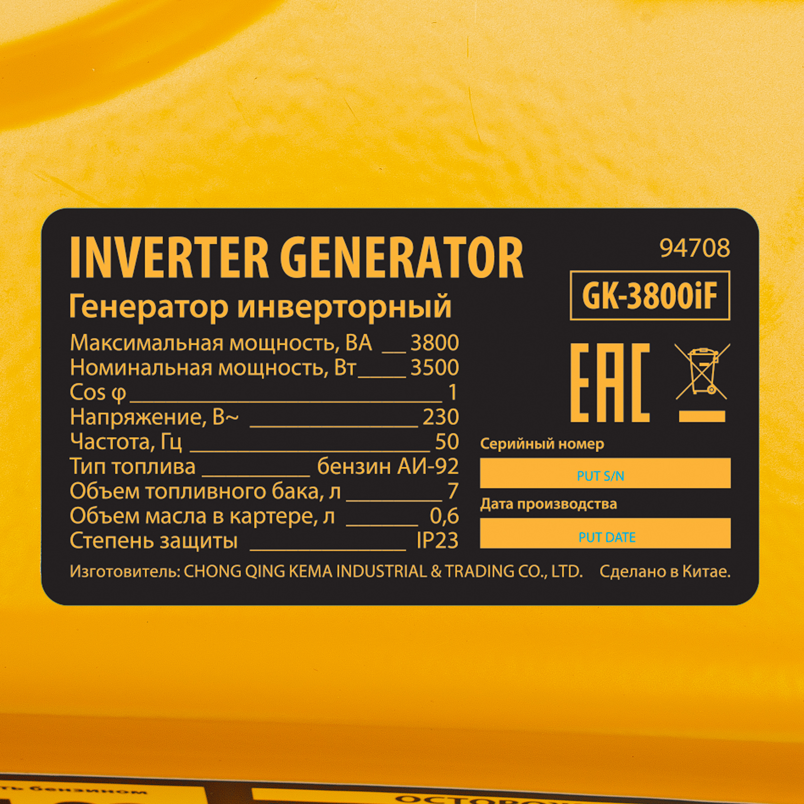 Генератор инверторный GK-3800iF, 3,8 кВт, 230 В, ручной старт DENZEL