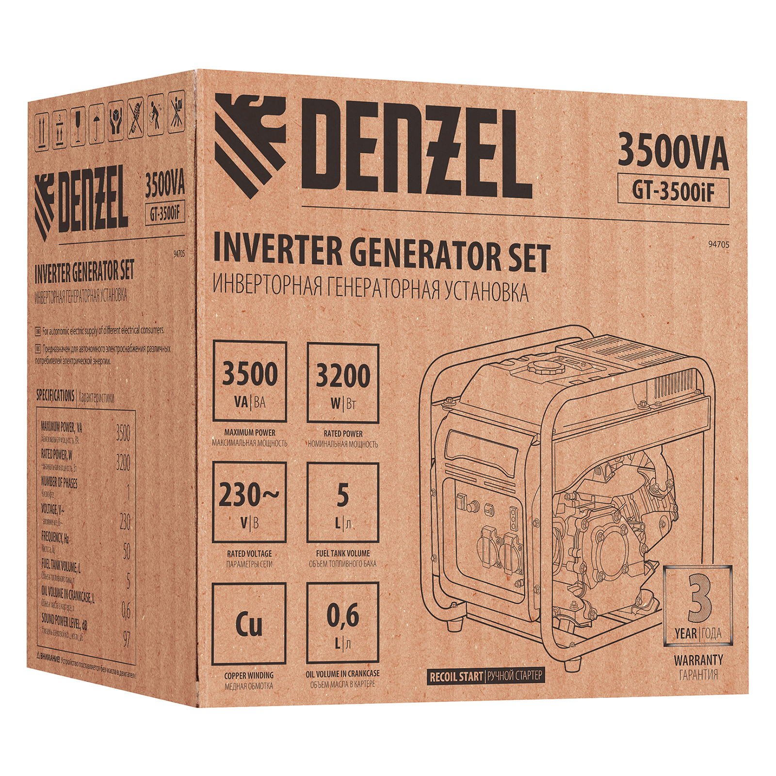 Генератор инверторный GT-3500iF, 3.5 кВт, 230 В, бак 5 л, открытый корпус, ручной старт Denzel