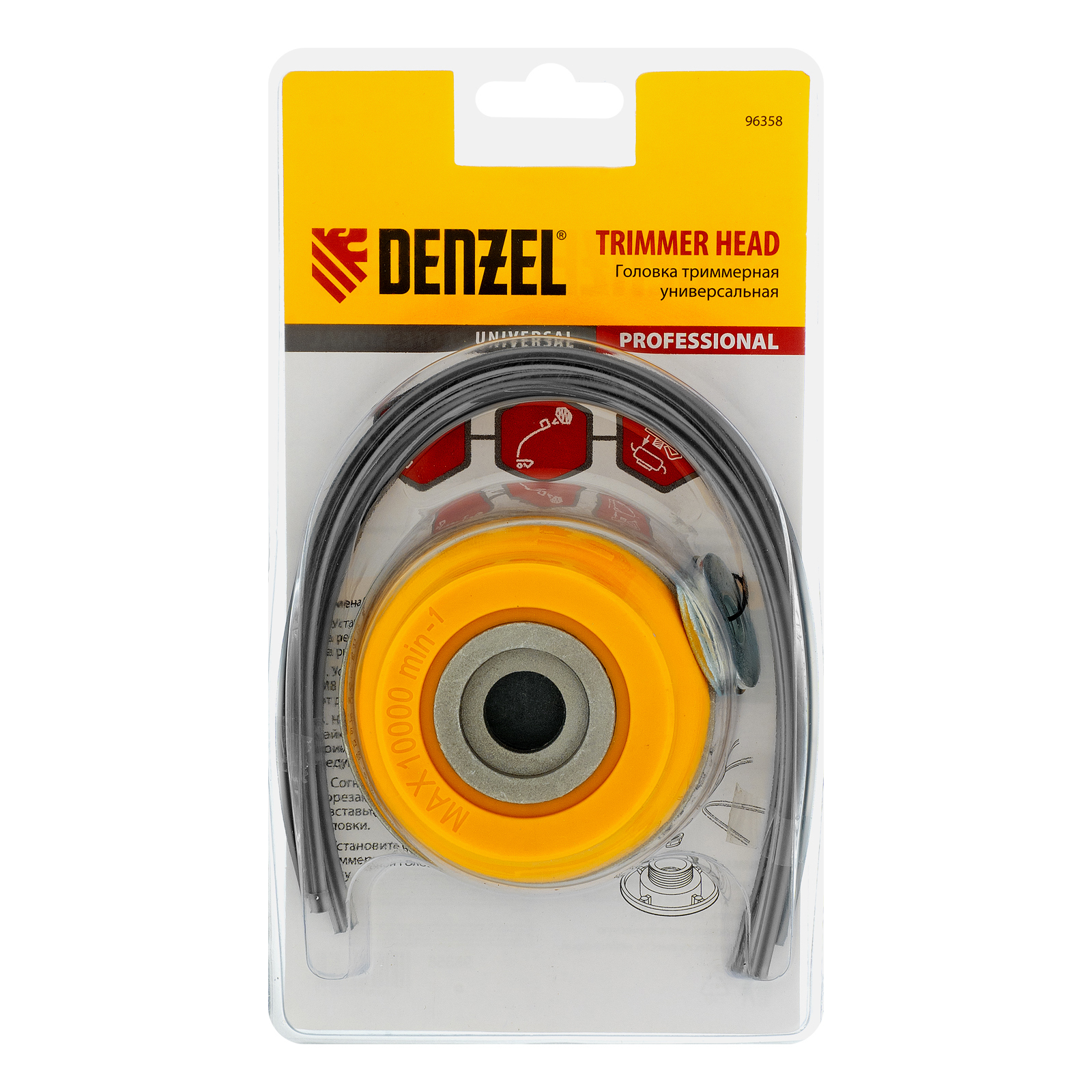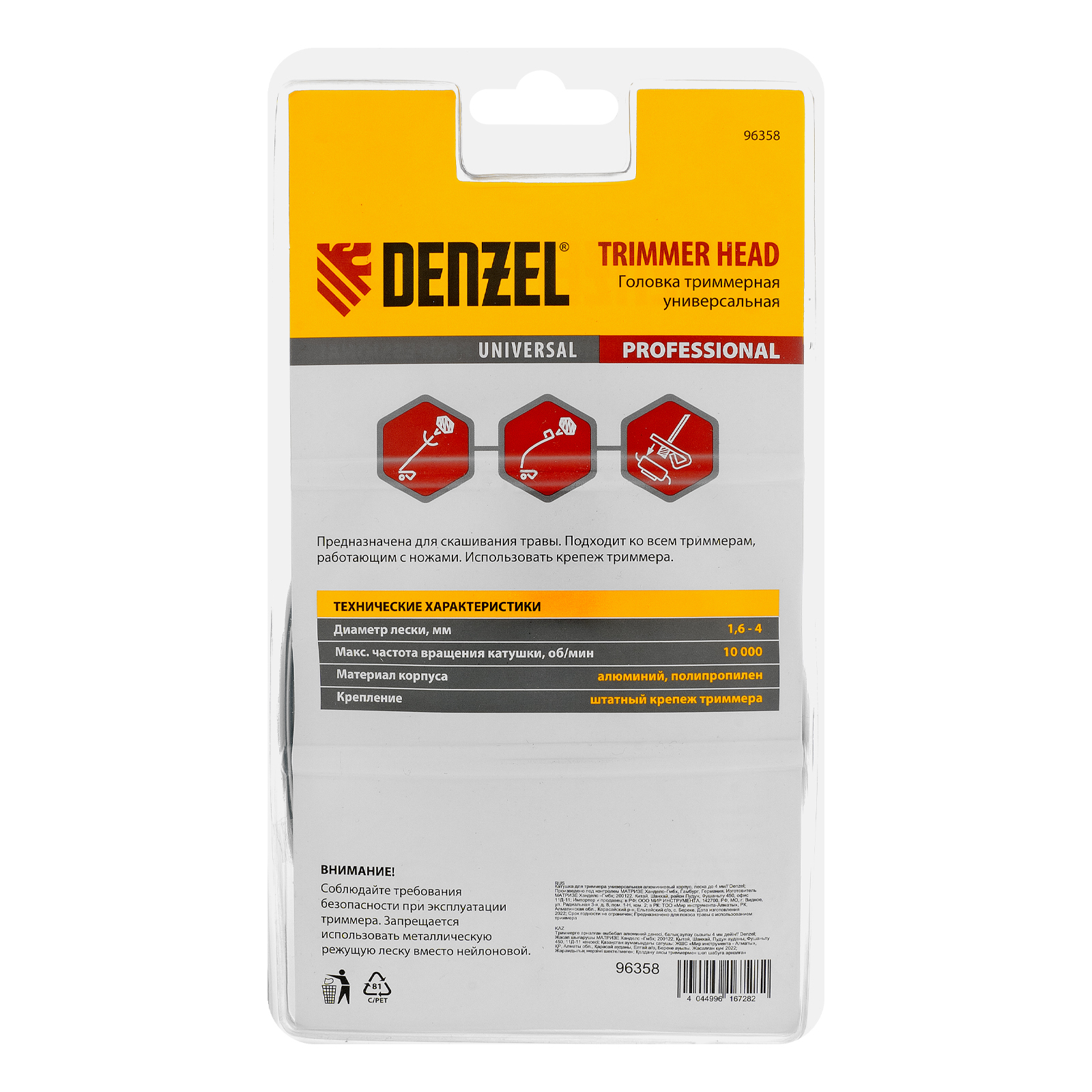 <p>Универсальная триммерная головка Denzel 96358 с алюминиевым корпусом совместима с леской толщиной до 4 мм. Подходит практически ко всем моделям бензиновых кос Denzel, Сибртех, Patriot, Husqvarna, Huter и другим с крепежом М10 х 1,25 и левой резьбой. Используется для скашивания травы на загородном участке. </p><h2>Преимущества</h2><ul><li>Эффективность — благодаря леске диаметром 3-4 мм головка позволяет справиться даже с густыми зарослями травы.</li><li>Прочность и надежность — алюминиевый корпус устойчив к износу и повреждениям в результате ударов о препятствия.</li><li>Высокая скорость работы — в головку можно заправить 4 отрезка лески.</li><li>Готовность к эксплуатации — в комплект поставки входит прочная режущая леска толщиной 4 мм.</li><li>Универсальность — триммерная головка поставляется с дополнительным крепежом: шайбами M8 и M10.</li></ul>