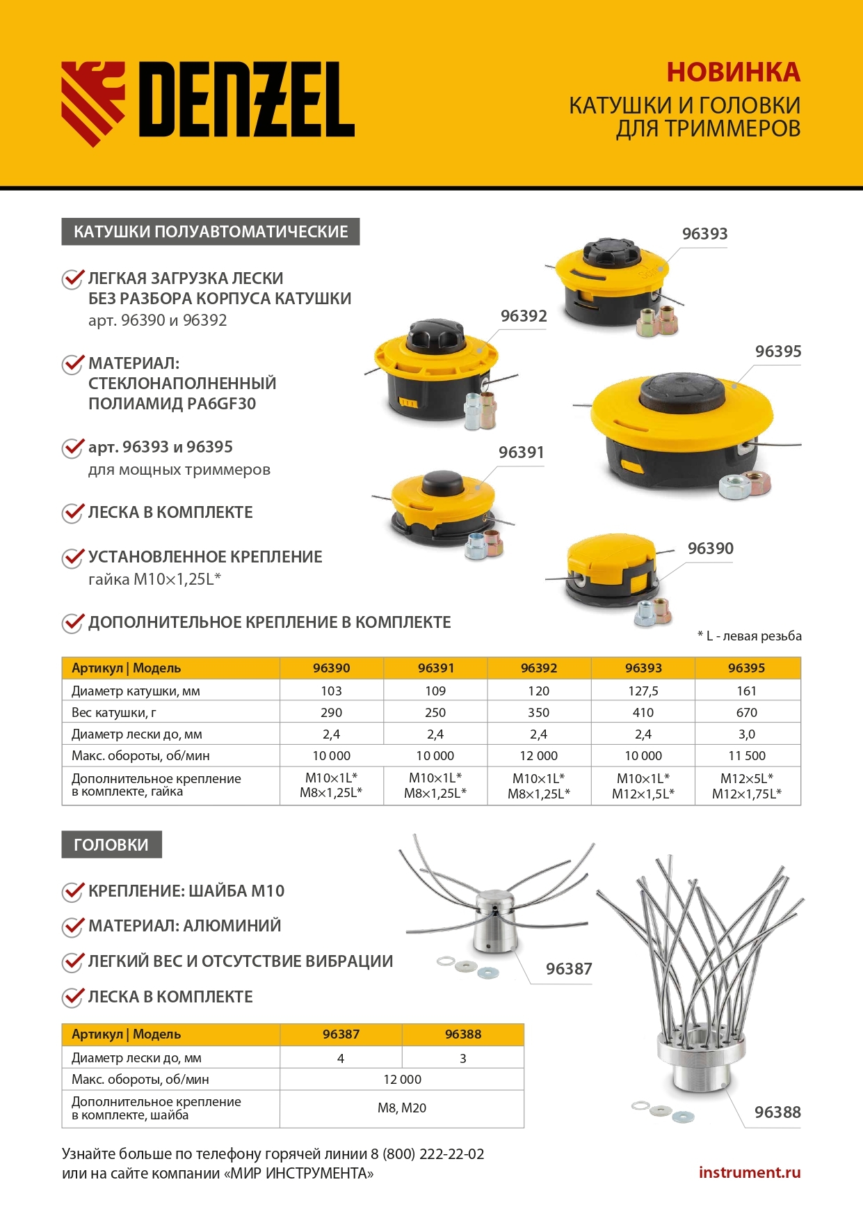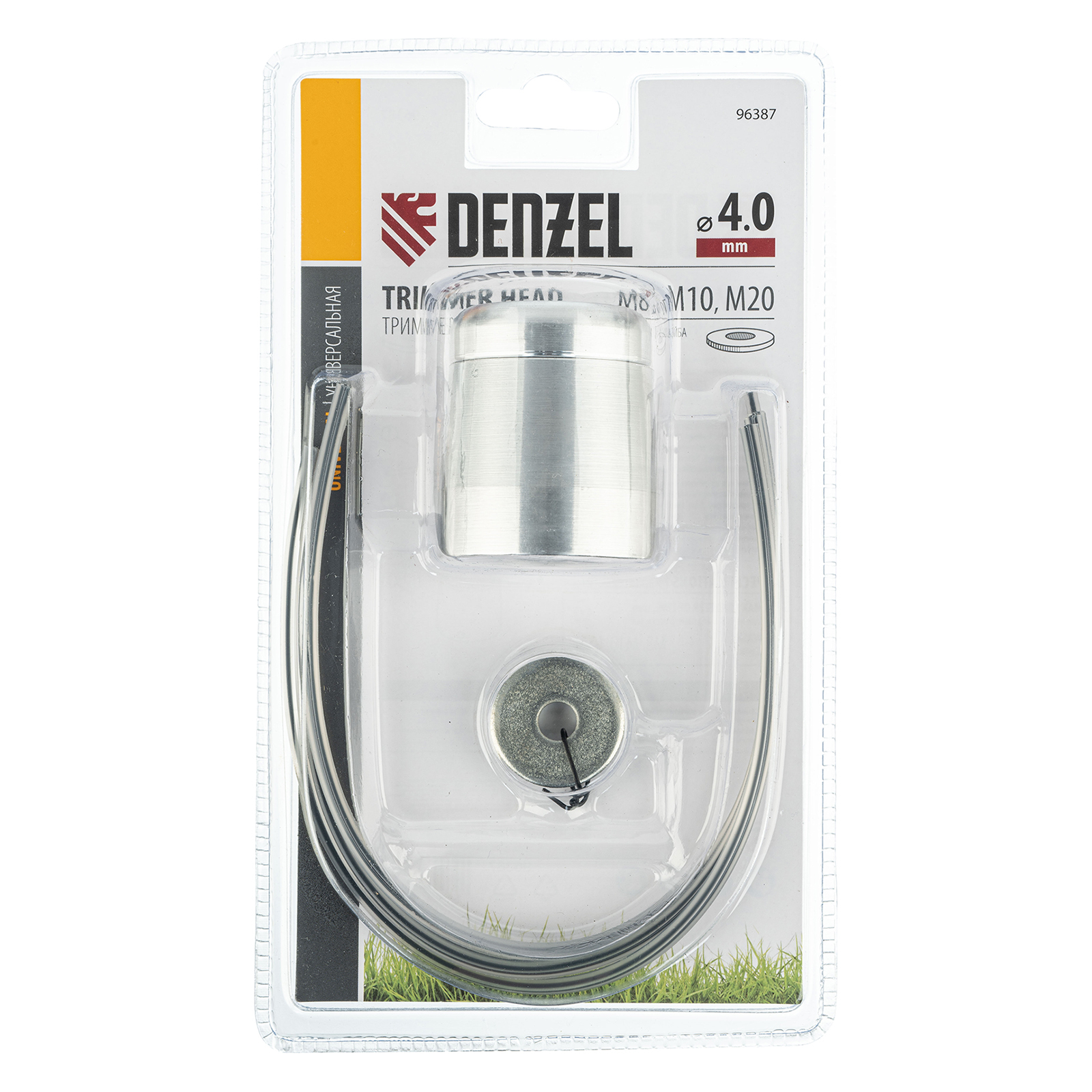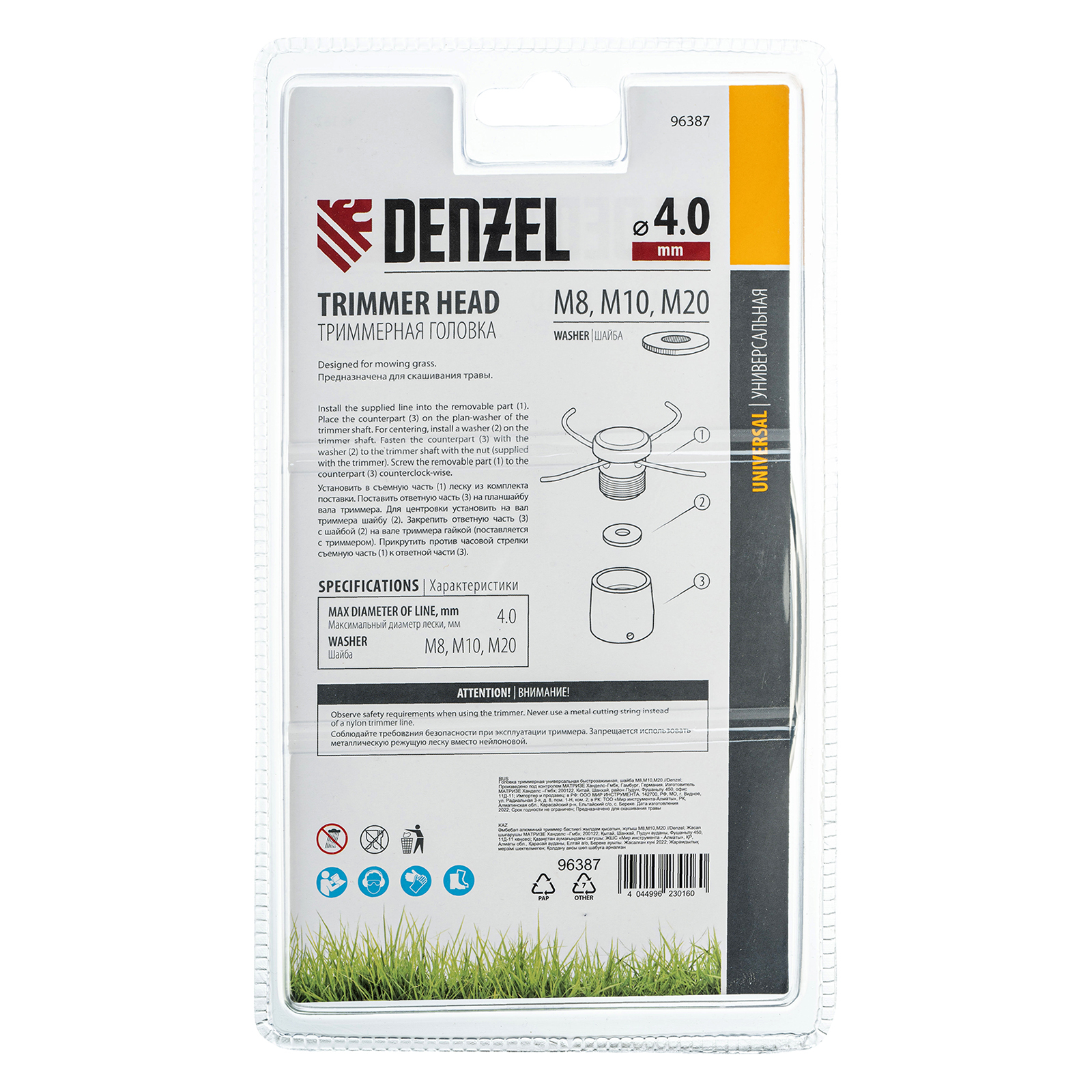 <p>Универсальная быстрозажимная триммерная головка Denzel 96387, в комплекте с шайбами M8, M10, M20, предназначена для установки на электро- и бензотриммеры. Позволяет ухаживать за газоном и эффективно бороться с сорняками. Подходит для работы на местности со сложным рельефом. Используется для ухода за растительностью на дачном участке.</p><h2>Преимущества</h2><ul><li>Универсальность — головка комплектуется шайбами различных типоразмеров, что позволяет устанавливать ее на триммеры с разными типами крепления.</li><li>Высокая производительность — можно использовать леску диаметром до 4 мм для скашивания даже жесткой и крупностеблевой растительности на участках большой площади.</li><li>Эффективность — компактная головка не утяжеляет конструкцию триммера и позволяет двигателю быстрее набирать обороты, а также значительно снижает вибрацию при работе.</li></ul>