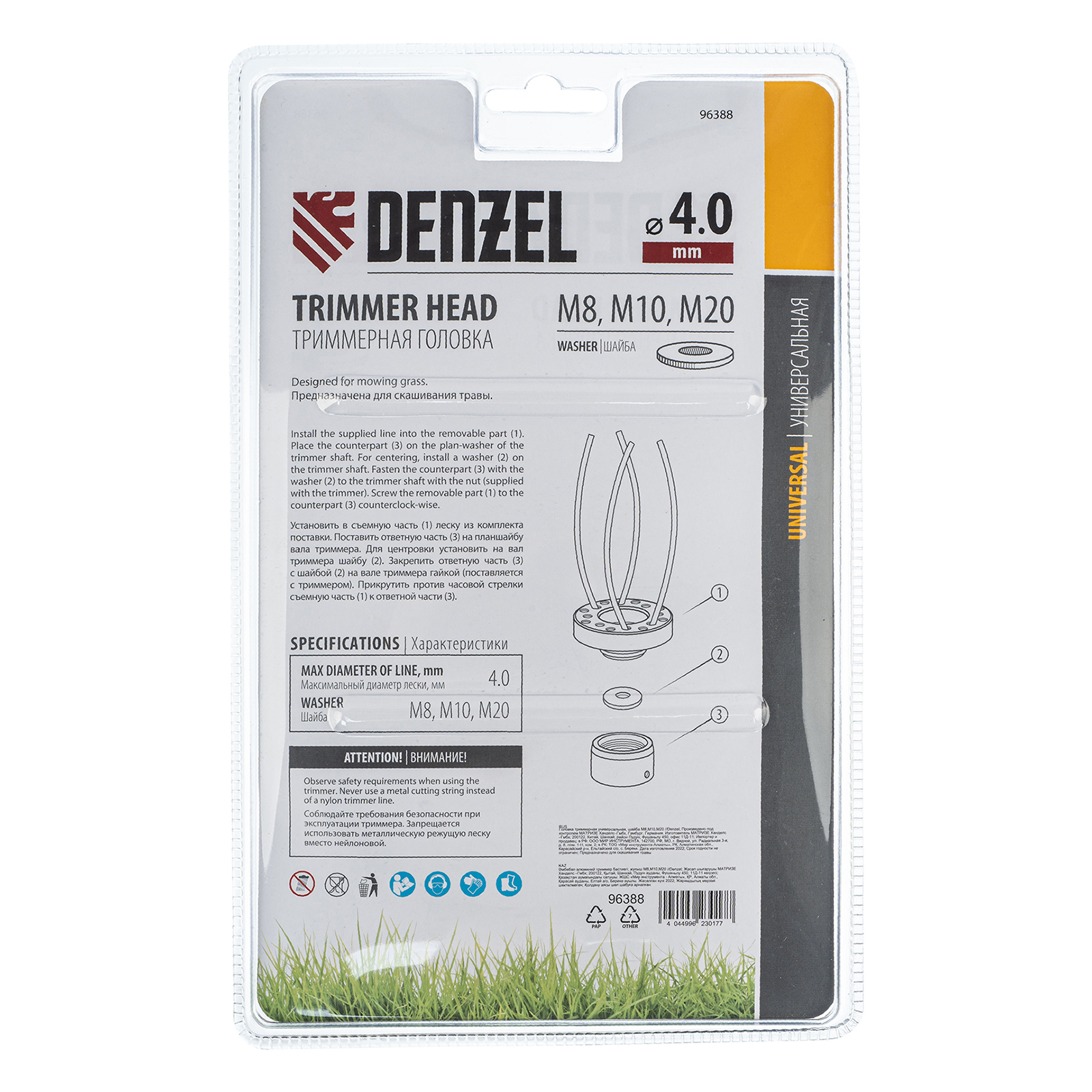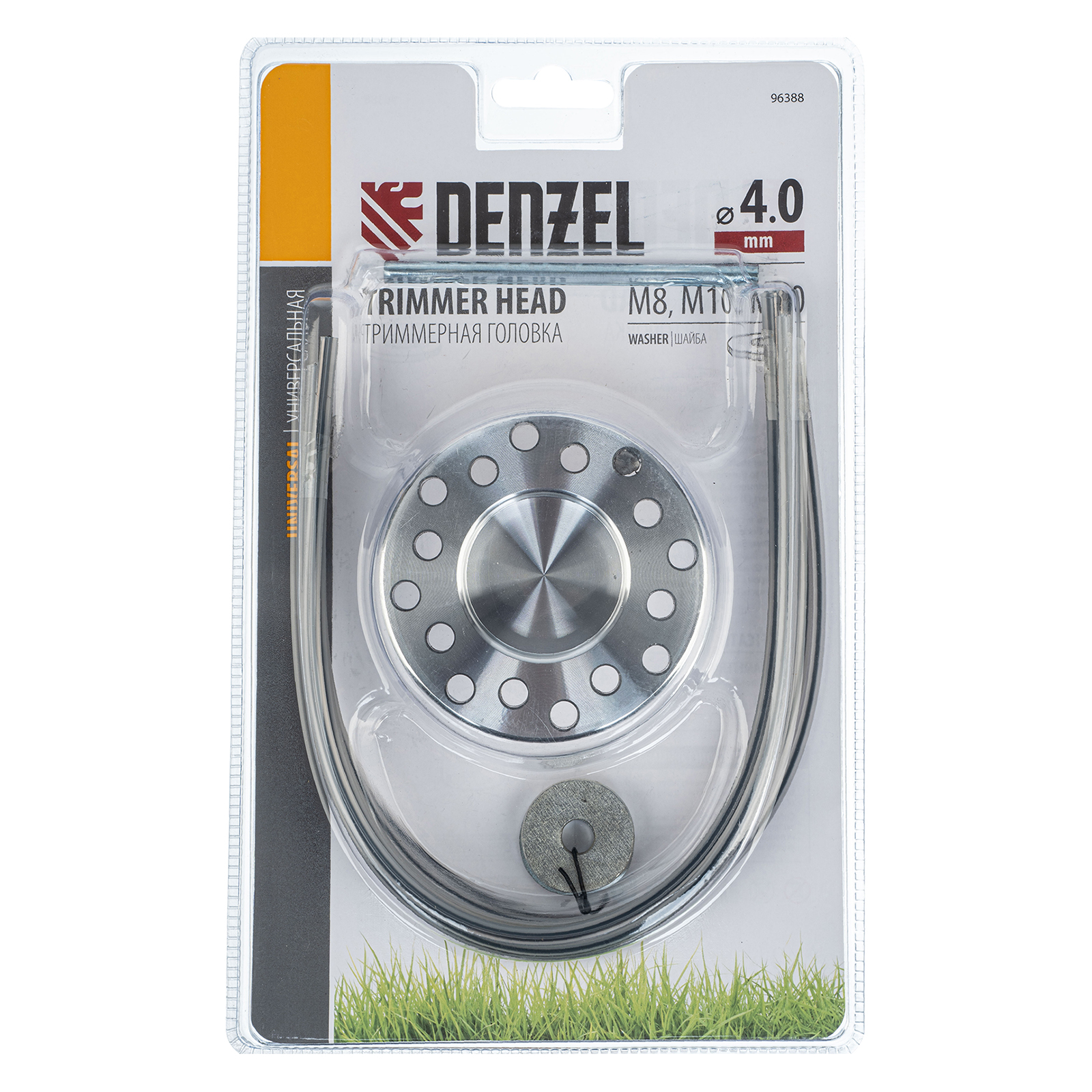 <p>Универсальная триммерная головка Denzel 96388, в комплекте с шайбами M8, M10, M20, предназначена для установки на электро- и бензотриммеры. Позволяет ухаживать за газоном и эффективно бороться с сорняками. Подходит для работы на местности со сложным рельефом. Используется для ухода за растительностью на дачном участке.</p><h2>Преимущества</h2><ul><li>Универсальность — головка комплектуется шайбами различных типоразмеров, что позволяет устанавливать ее на триммеры с разными типами крепления.</li><li>Высокая производительность — можно использовать леску диаметром до 4 мм для скашивания даже жесткой и крупностеблевой растительности на участках большой площади.</li><li>Эффективность — компактная головка не утяжеляет конструкцию триммера и позволяет двигателю быстрее набирать обороты, а также значительно снижает вибрацию при работе.</li></ul>
