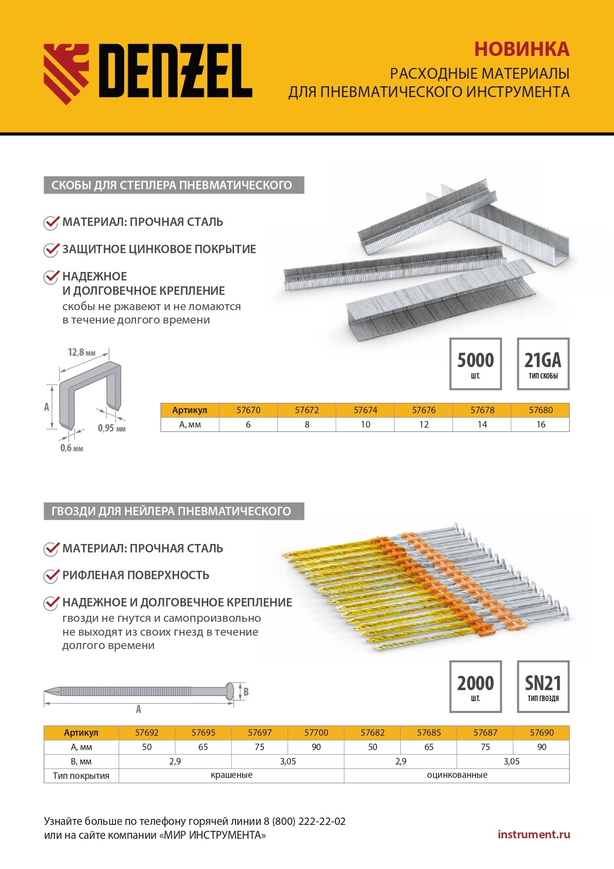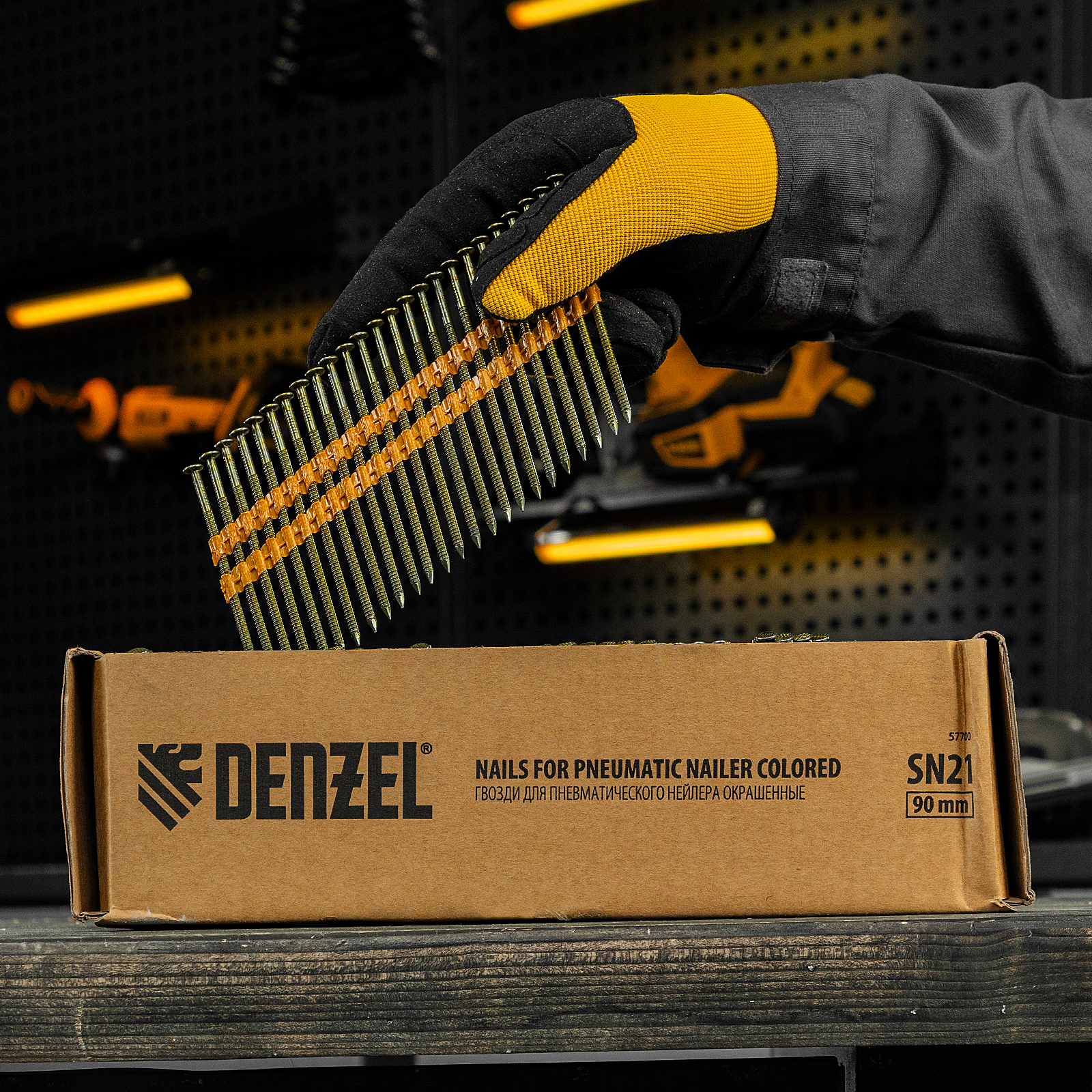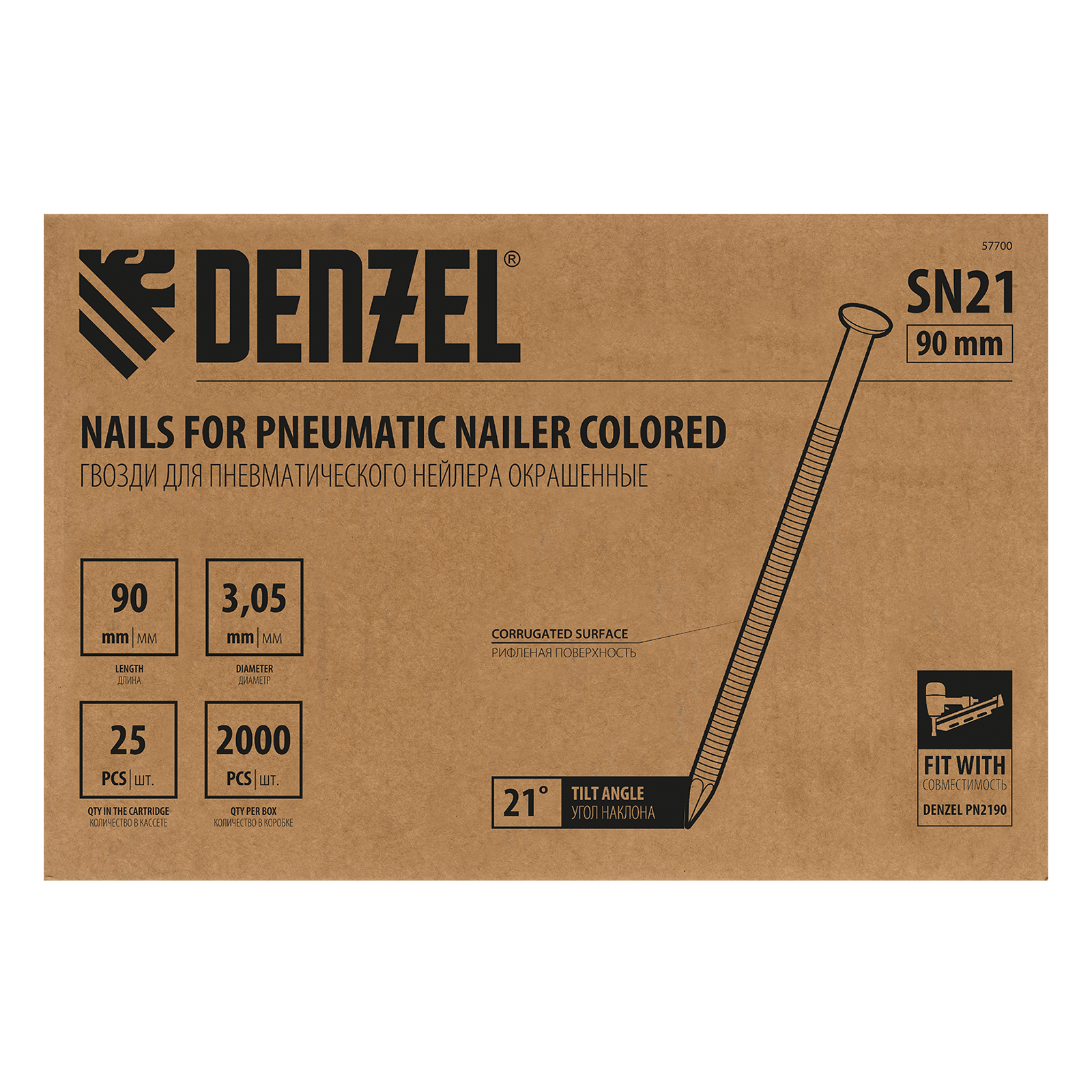 <p>Гвозди Denzel 57700 типа SN21, длиной 90 мм и диаметром 3,05 мм, с крашеной поверхностью, 2000 шт. в упаковке, — расходники для пневматического нейлера. Используются для скрепления различных материалов, будут полезны во время сборочных и отделочных работ.</p><h2>Преимущества</h2><ul><li>Прочность — крепежные элементы изготовлены из стали.</li><li>Надежное и долговечное соединение — гвозди не гнутся, рифленая рабочая часть исключает их самопроизвольный выход из своих гнезд.</li><li>Удобная комплектация — запаса из 2000 шт. хватит для выполнения большого объема работ.</li></ul>