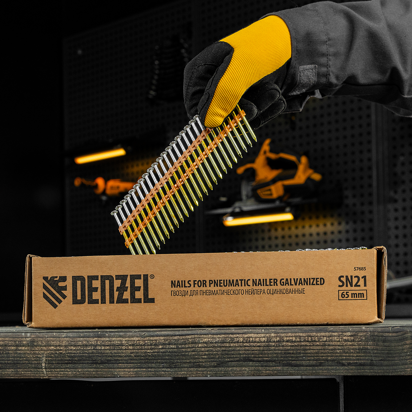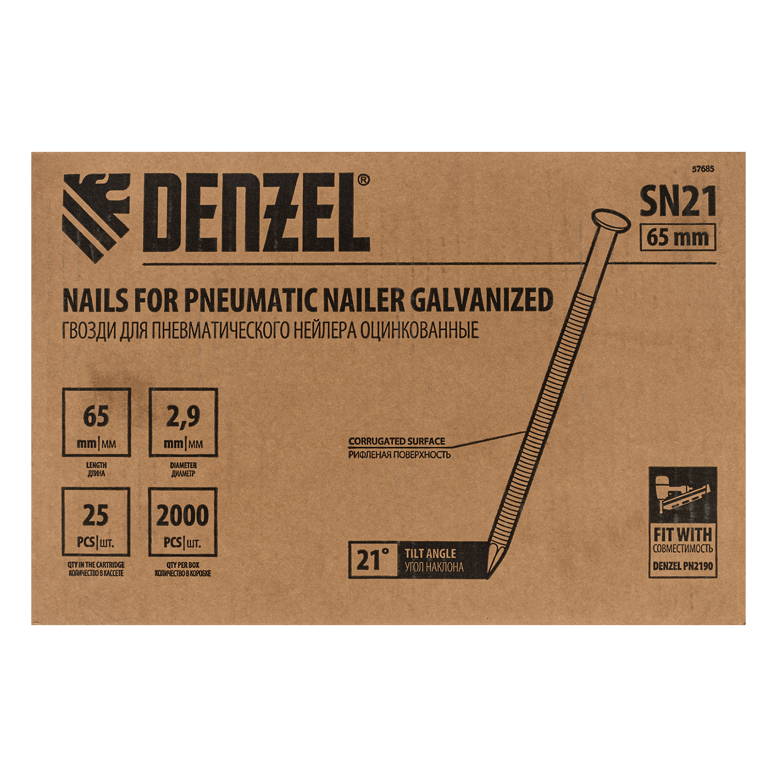 <p>Оцинкованные гвозди Denzel 57685 типа SN21, длиной 65 мм и диаметром 2,9 мм, 2000 шт. в упаковке, — расходники для пневматического нейлера. Используются для скрепления различных материалов, будут полезны во время сборочных и отделочных работ.</p><h2>Преимущества</h2><ul><li>Прочность и коррозионная стойкость — крепежные элементы изготовлены из стали и оцинкованы.</li><li>Надежное и долговечное соединение — гвозди не гнутся, рифленая рабочая часть исключает их самопроизвольный выход из своих гнезд.</li><li>Удобная комплектация — запаса из 2000 шт. хватит для выполнения большого объема работ.</li></ul>