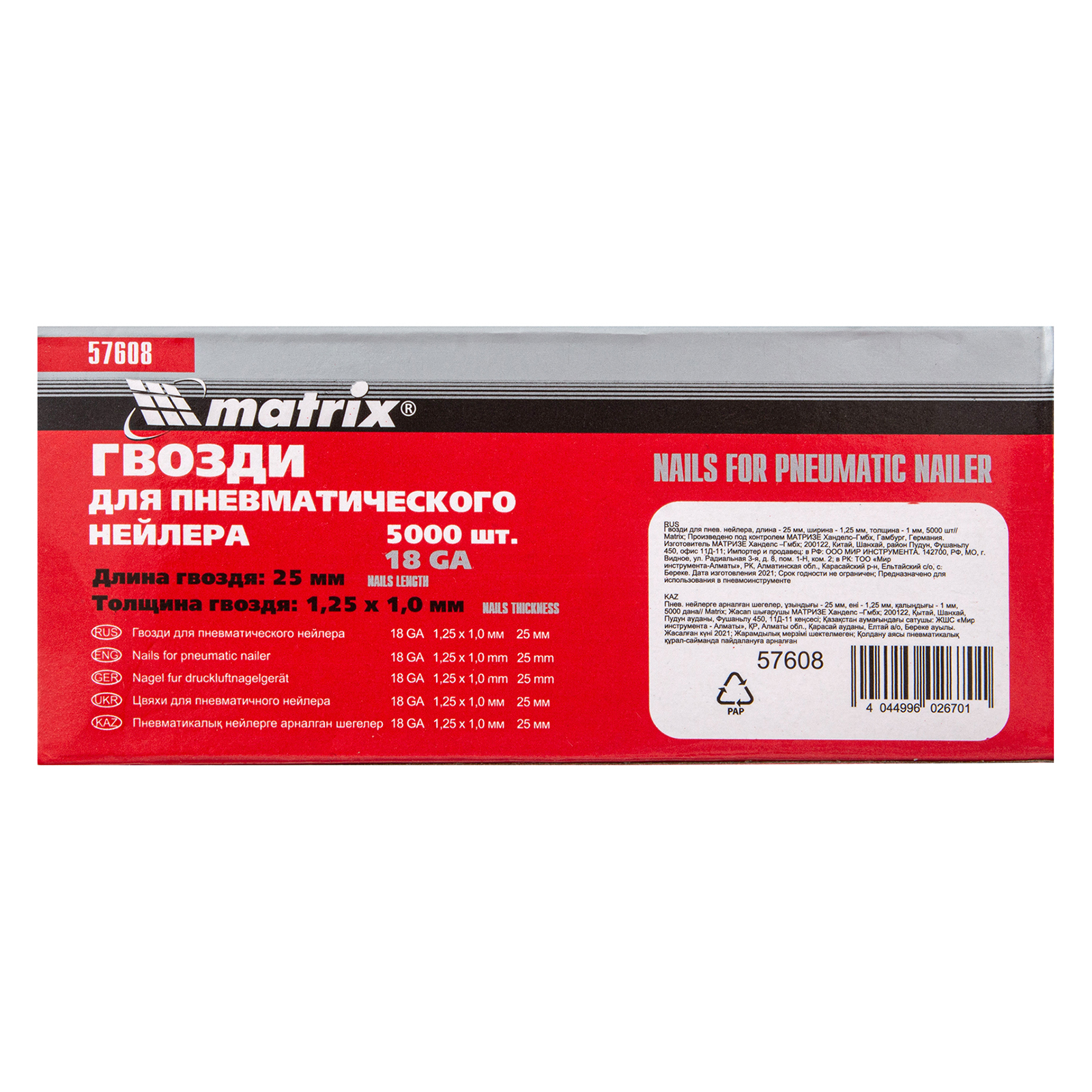 Гвозди для пневматического нейлера, длина 25 мм, ширина 1.25 мм, толщина 1 мм, 5000 шт Matrix
