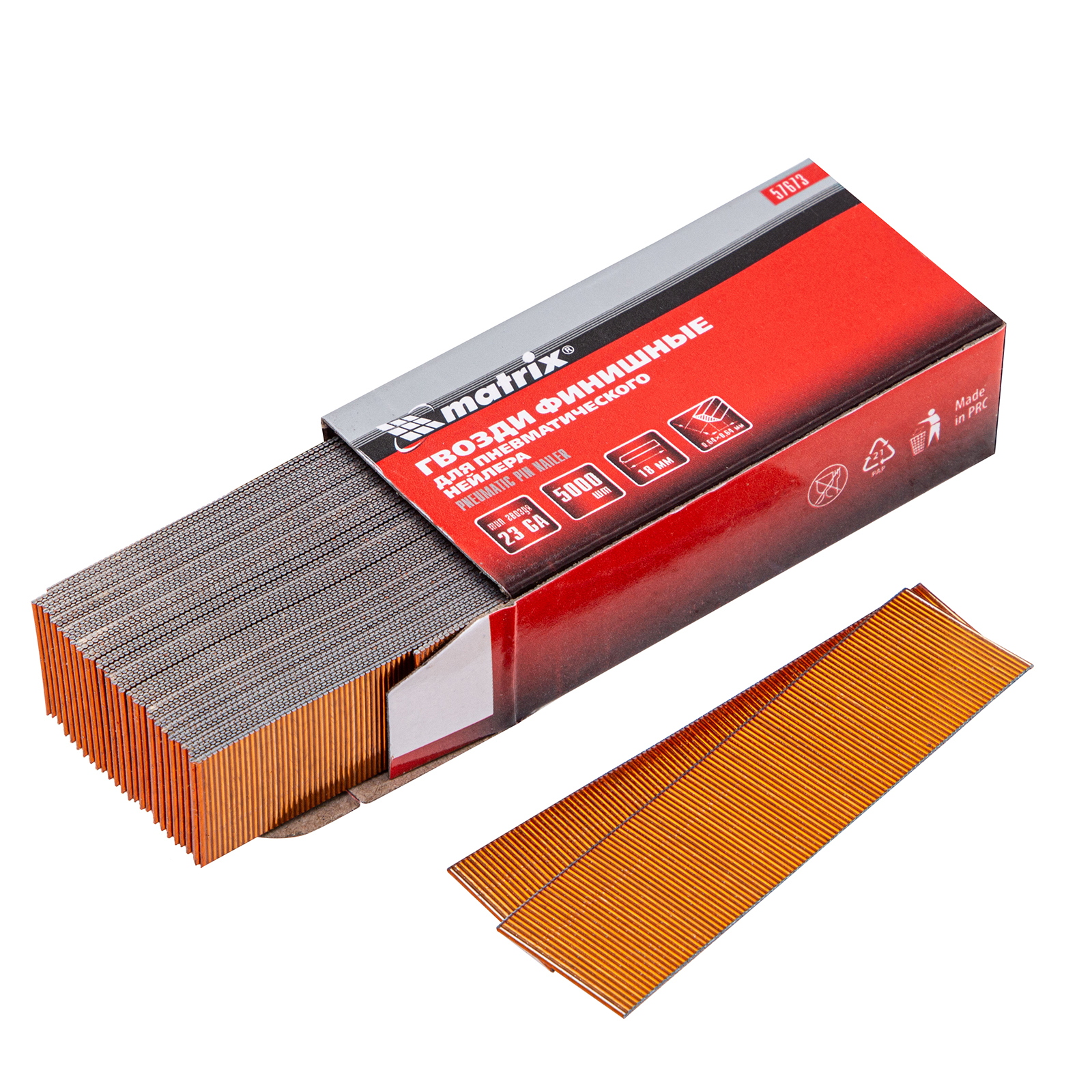 <p>Гвозди финишные (шпильки) Matrix 23 GA 57673 диаметром 0,64 мм и длиной 18 мм, 5000 шт., подойдут для работы с пневматическим нейлером любой торговой марки. Используются для быстрого и точного скрепления тонких деревянных материалов и конструирования декоративных элементов.</p><h2>Преимущества</h2><ul><li>Незаметная фиксация — гвозди прекрасно справляются с декоративной обработкой материалов, когда важно, чтобы крепление оставалось невидимым, но надежным.</li><li>Аккуратный результат — да со шпильками нет риска повредить лицевую сторону материала, что особенно важно для декоративных предметов интерьера.</li><li>Надежность — гвозди выполнены из прочной инструментальной стали и закалены до необходимой твердости, что минимизирует риск их искривления.</li><li>Большой запас — 5000 гвоздей хватит на долгое время даже при частом использовании.</li></ul>