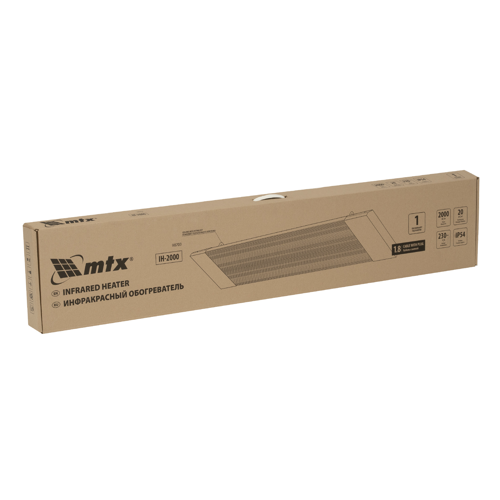 Инфракрасный обогреватель MTX IH-2000 98703 подключается к сети 230 В, потребляет мощность до 2000 Вт, защищен по стандарту IP54 и оснащен кабелем длиной 1,8 м с вилкой. Предназначен для обогрева помещений, благодаря высокой степени защиты IP54 не боится влаги, поэтому может быть установлен на улице под открытым небом, на открытых верандах, в беседках, курятниках, теплицах и подвальных помещениях, часто используется для сушки деревянных поверхностей. Служит основным источником тепла на площади до 20 м² и дополнительным — в помещениях до 40 м². Произведен в России.