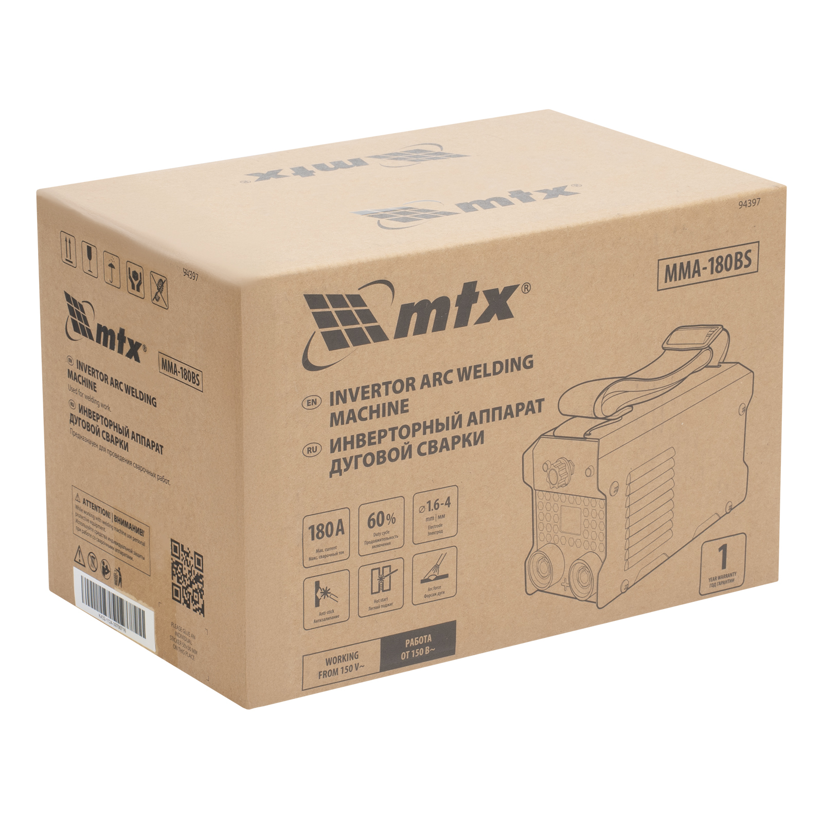 Сварочный аппарат MTX MMA-180BS 94397 предназначен для ручной дуговой сварки и наплавки покрытым электродом заготовок из низкоуглеродистой стали при постоянном токе до 180 A. Работает с электродами диаметром 1,6-4 мм. Продолжительность включения при максимальном токе составляет 60%. Аппарат изготовлен с использованием современных электронных компонентов и стабильно работает даже при пониженном напряжении величиной от 150 В. Пригодится сотрудникам коммунальных служб, также будет полезен в быту.