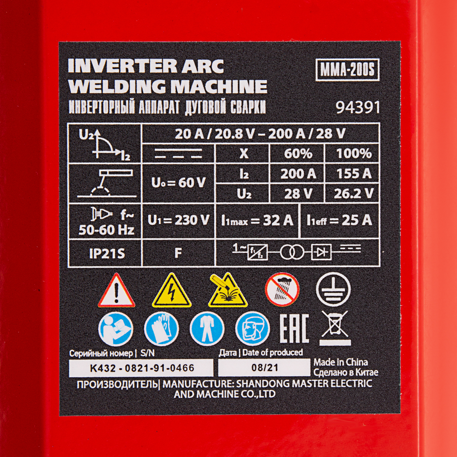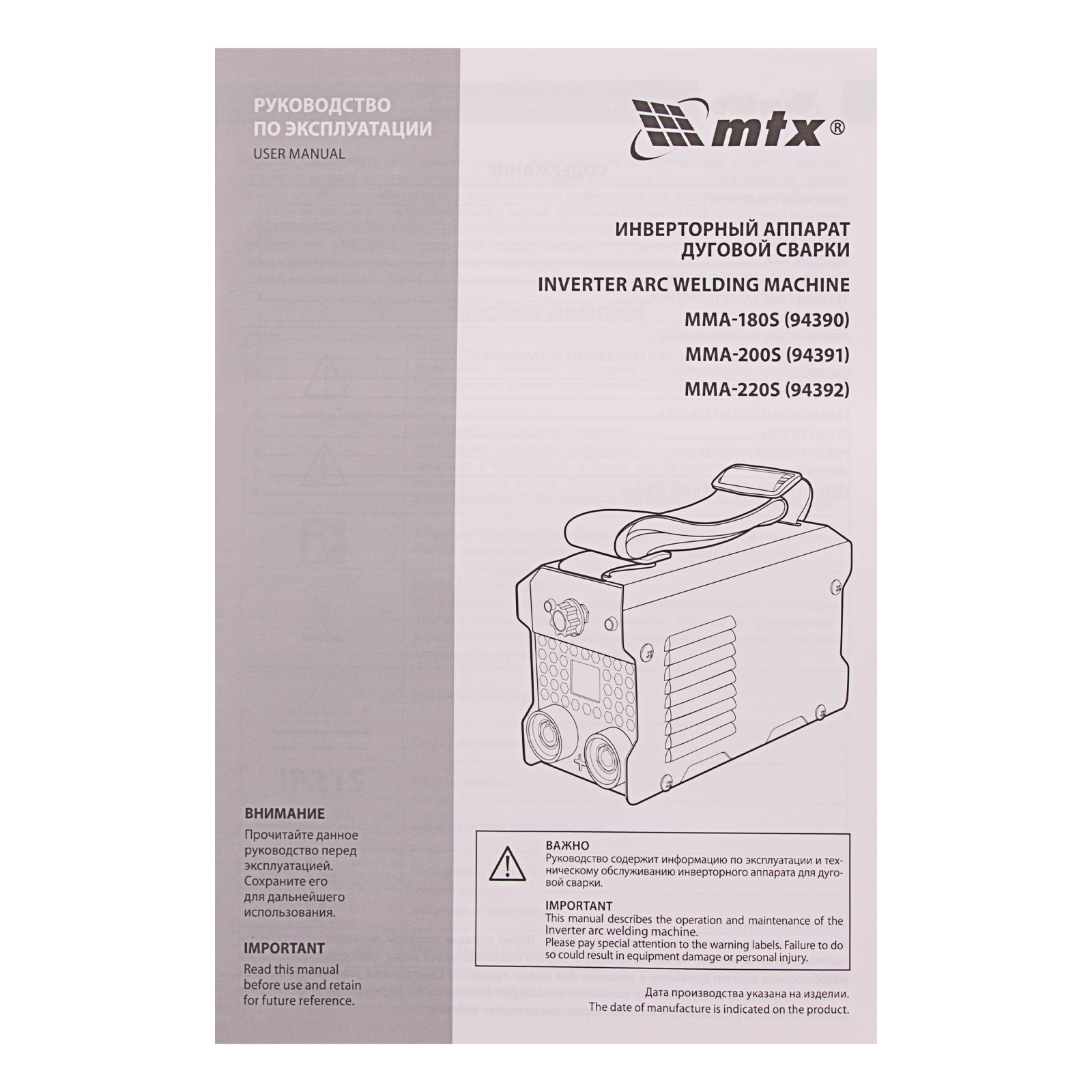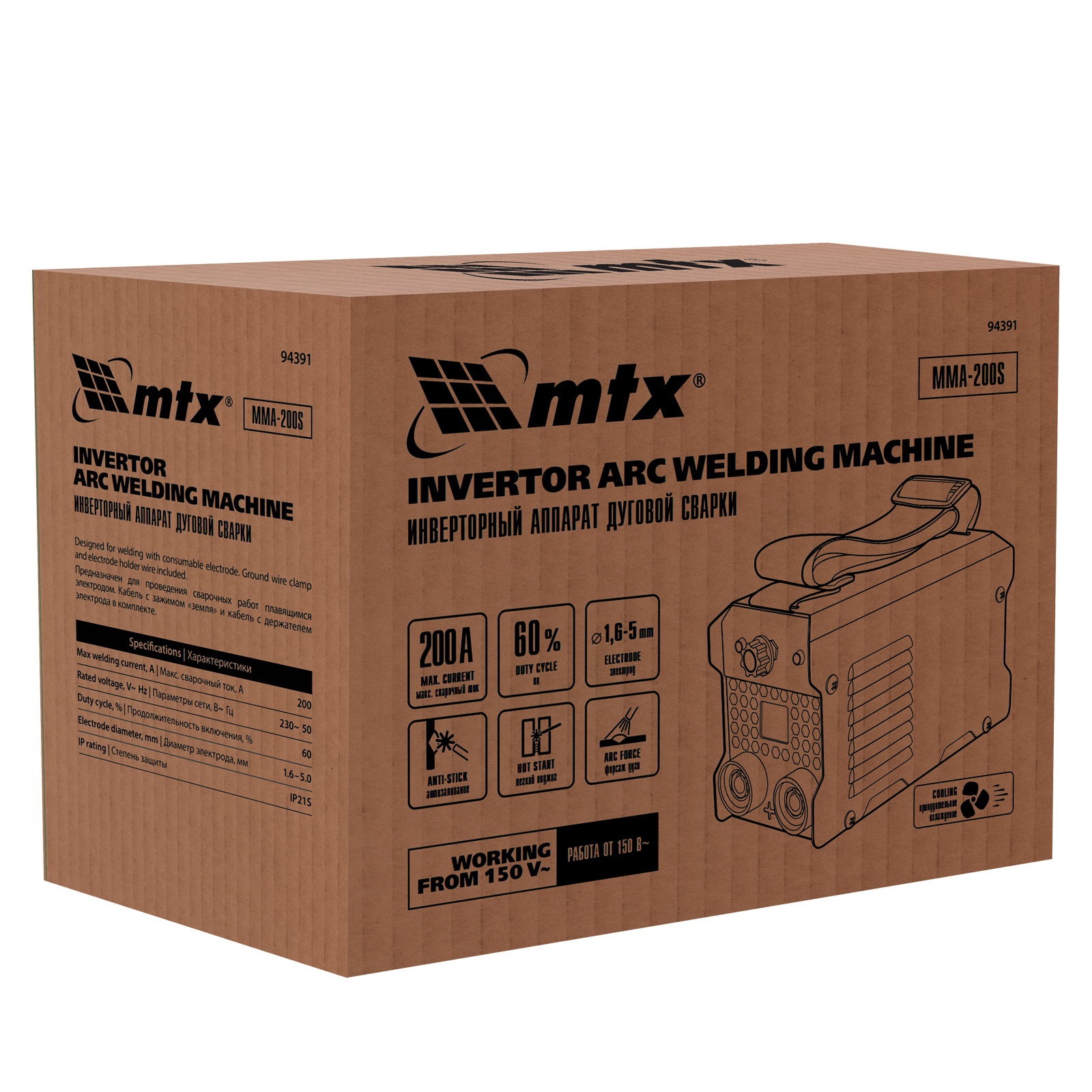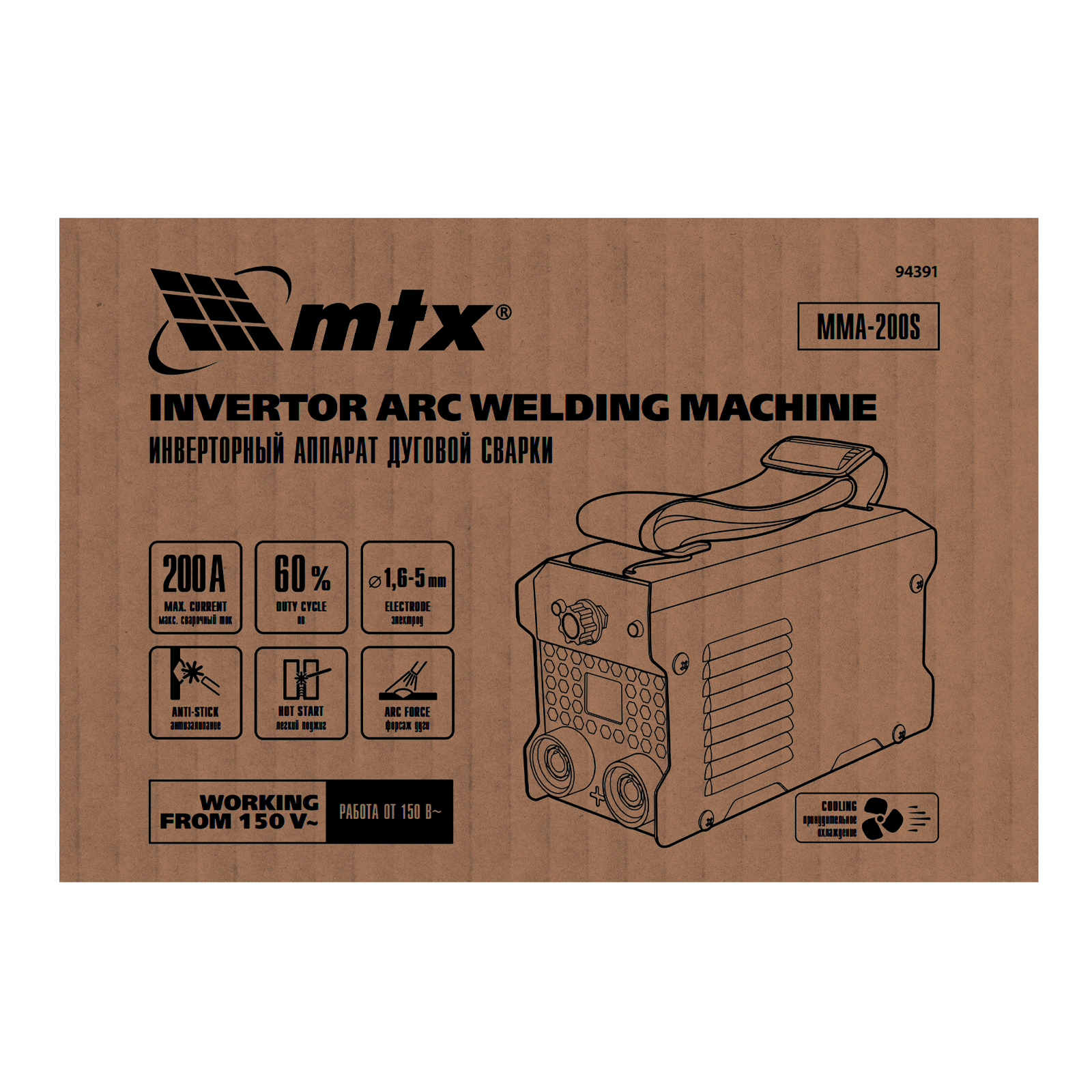 Инверторный аппарат дуговой сварки MMA-200S, 200 А, ПВ60%, диаметр электрода 1,6-5 мм MTX