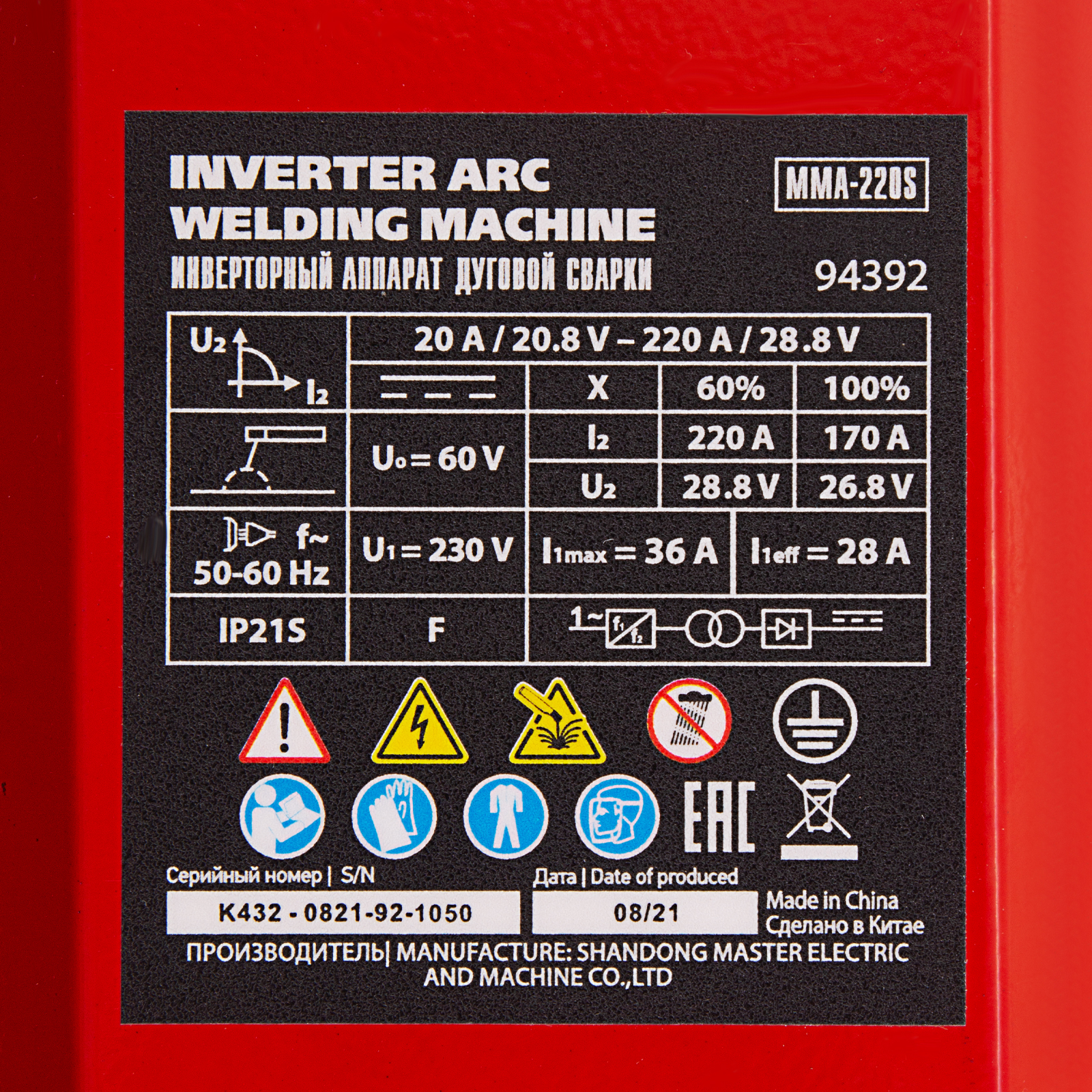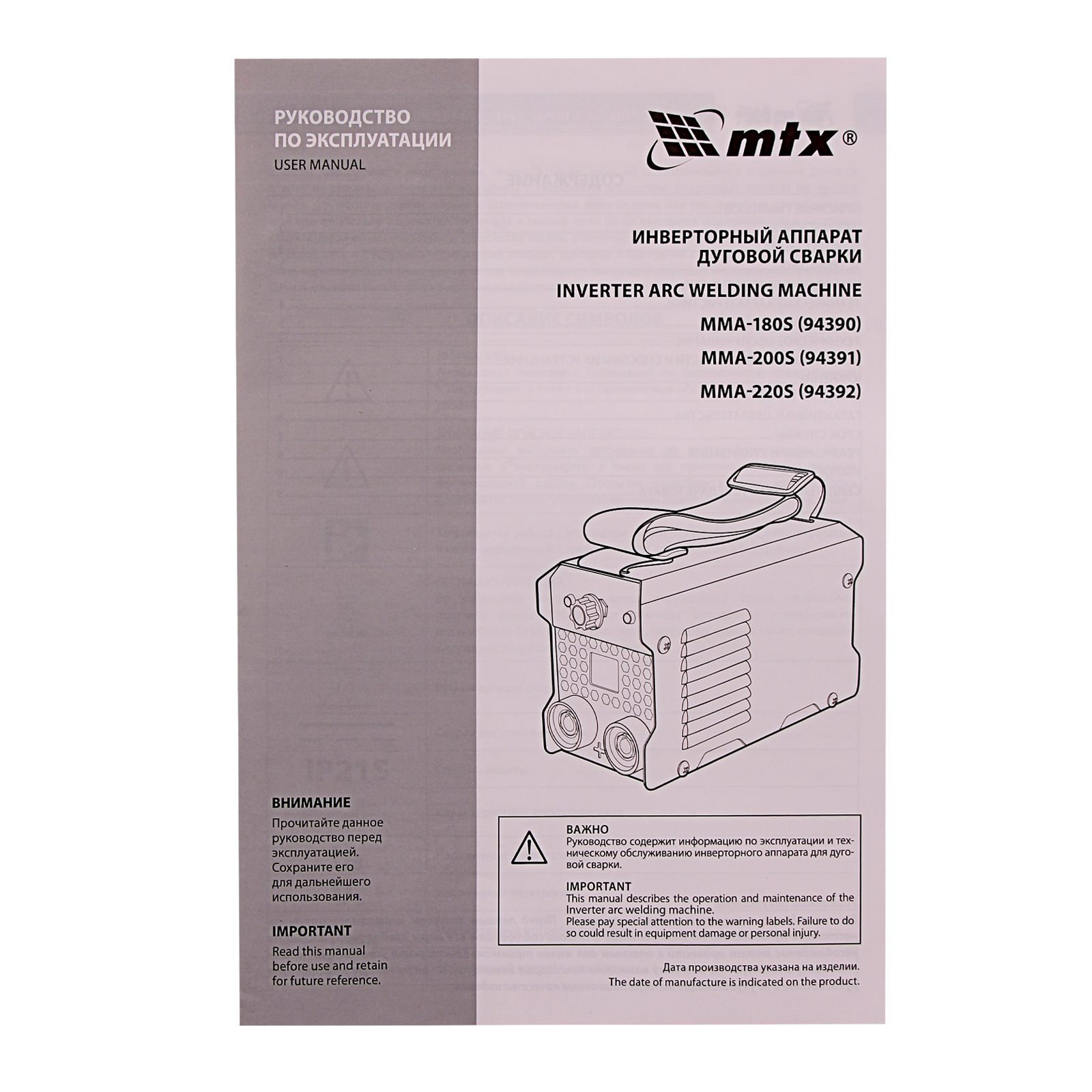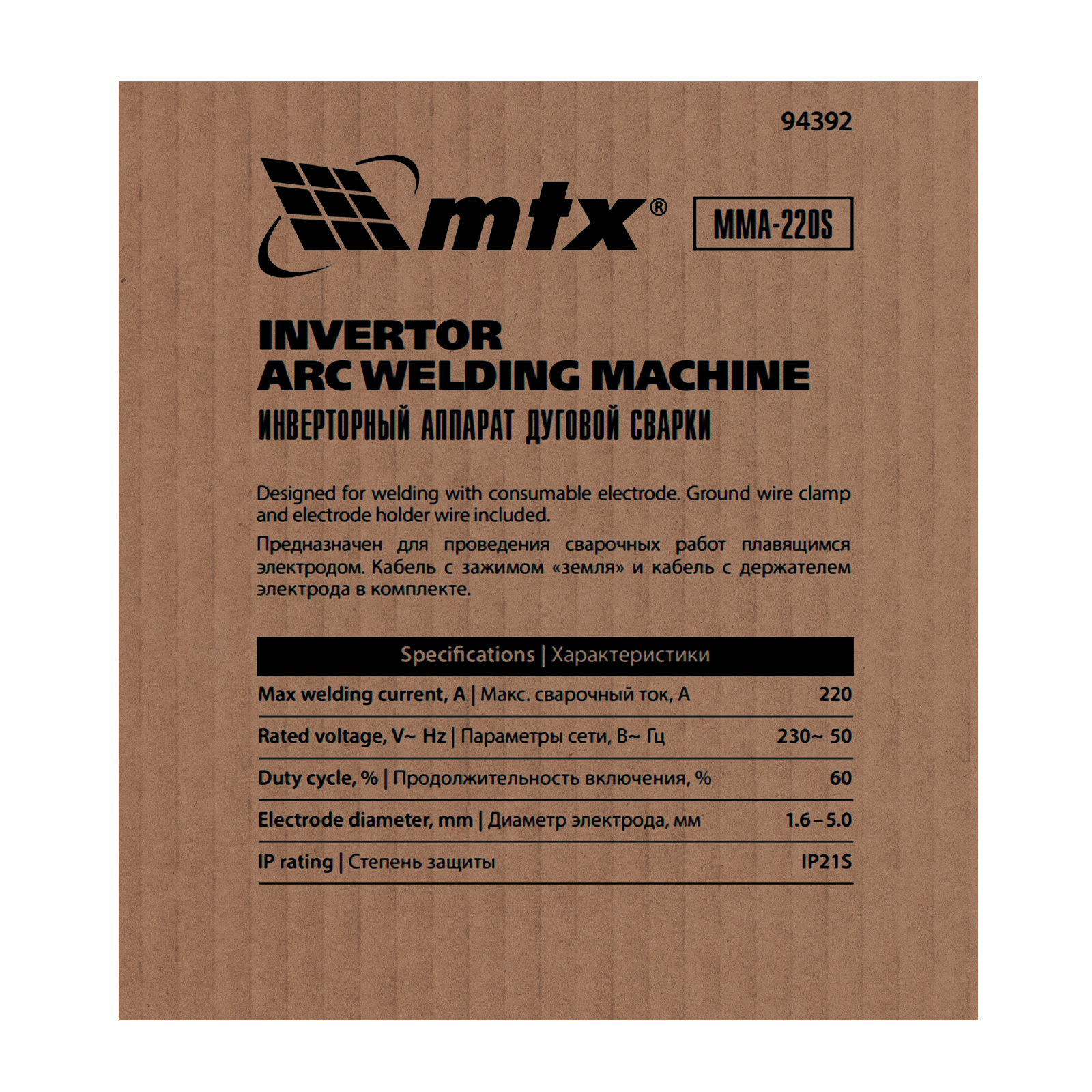Инверторный аппарат дуговой сварки MMA-220S, 220 А, ПВ60%, диаметр электрода 1,6-5 мм MTX