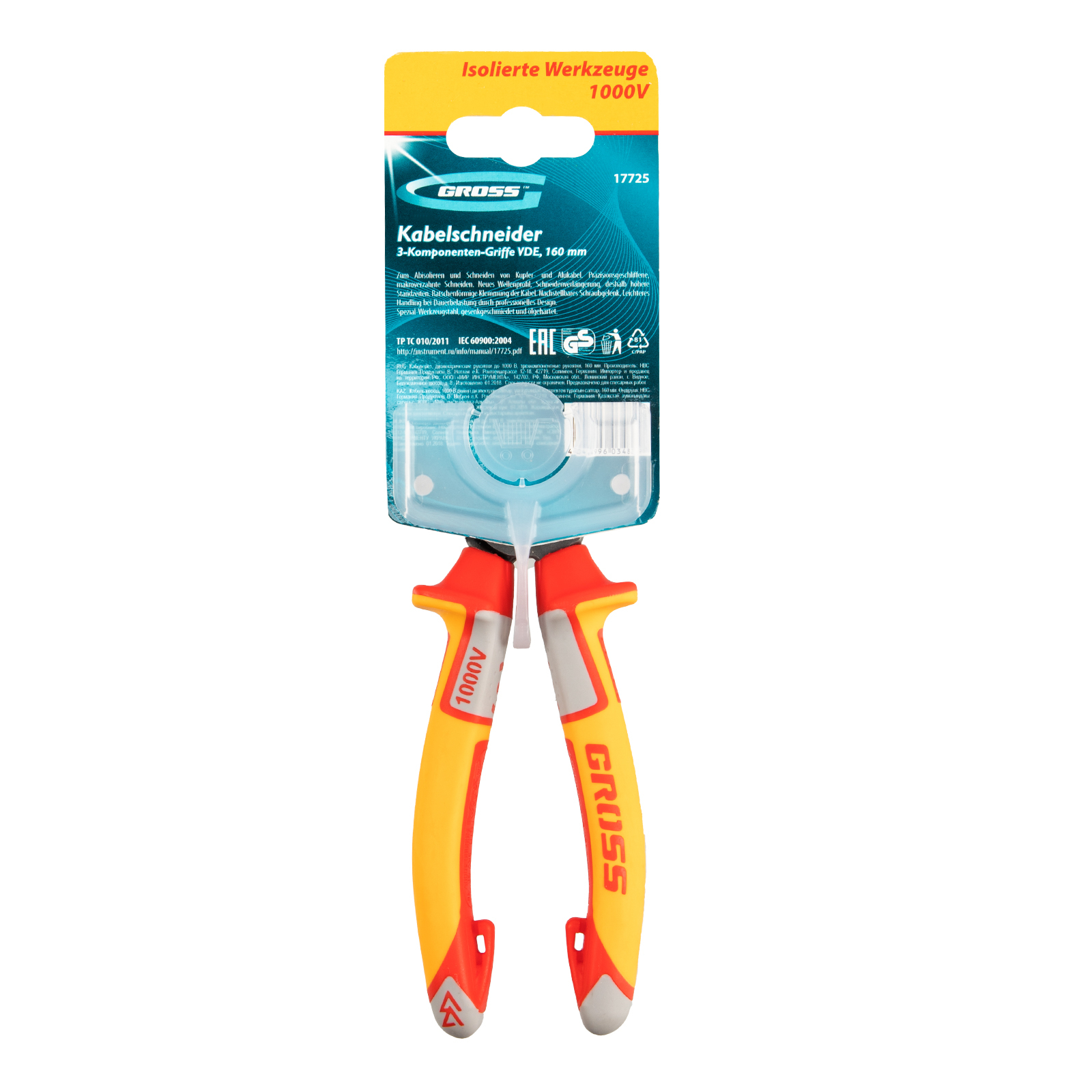 Кабелерез Gross 17725 длиной 160 мм, с трехкомпонентными диэлектрическими рукоятками до 1000 В, широко используется при проведении слесарных и электромонтажных работ. С его помощью можно перерезать многопроволочную жилу из меди и алюминия, снять изоляцию с электропроводов. Инструмент не подходит для работы с алюминиевыми сплавами, стальной проволокой и холоднотянутыми медными проводами, может использоваться только для многопроволочных жил (общий диаметр кабеля не более 16 мм, сечение до 50 кв. мм). Важно — техника безопасности не допускает выполнения работ под напряжением.