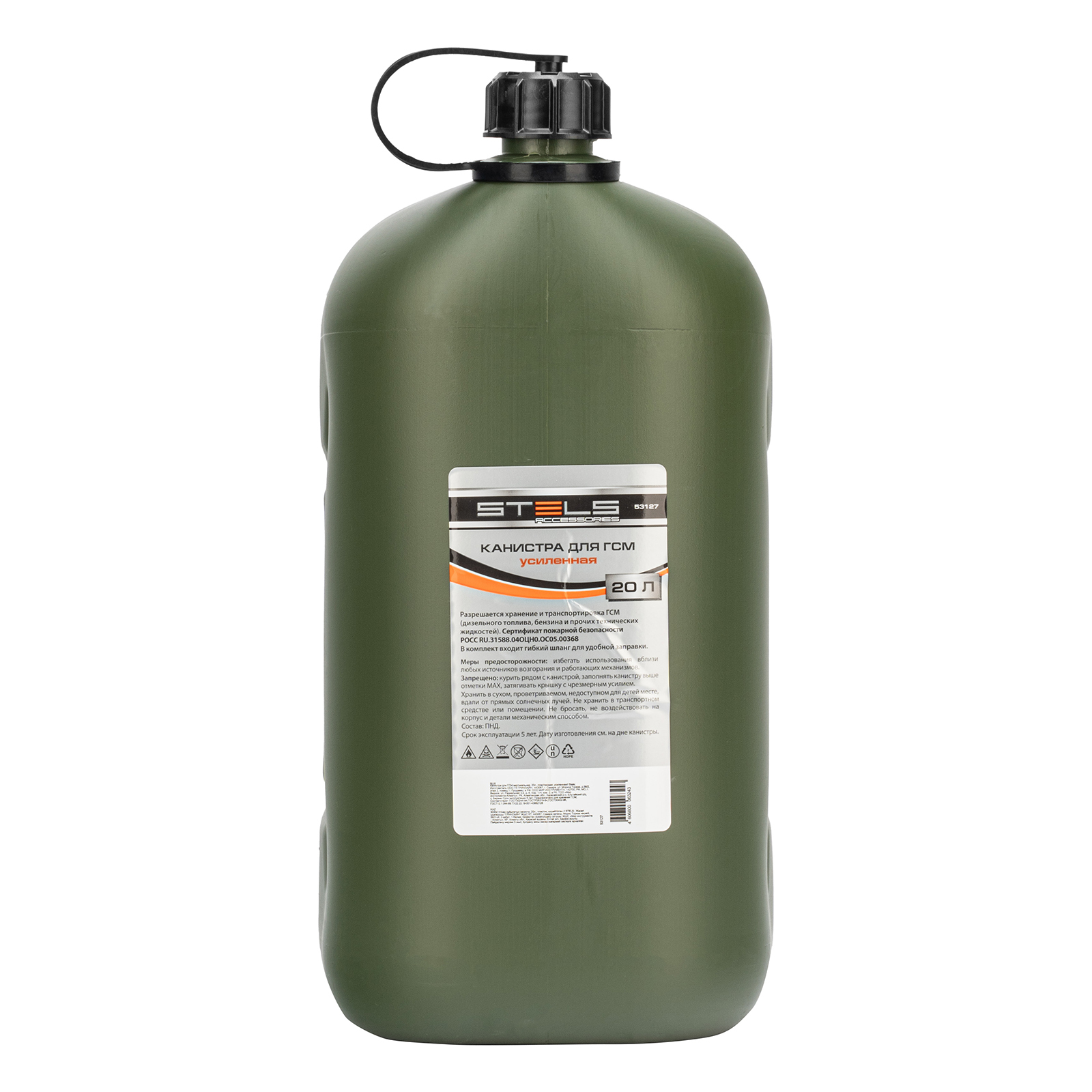 Усиленная пластиковая канистра Stels 53127 объемом 20 л, вертикальная, используется для транспортировки топлива и других ГСМ, а также их хранения в гараже или на даче. Будет полезна для дозаправки автомобиля в дороге. Также пригодится для обслуживания бензотехники: пил, триммеров, газонокосилок и другого оборудования.