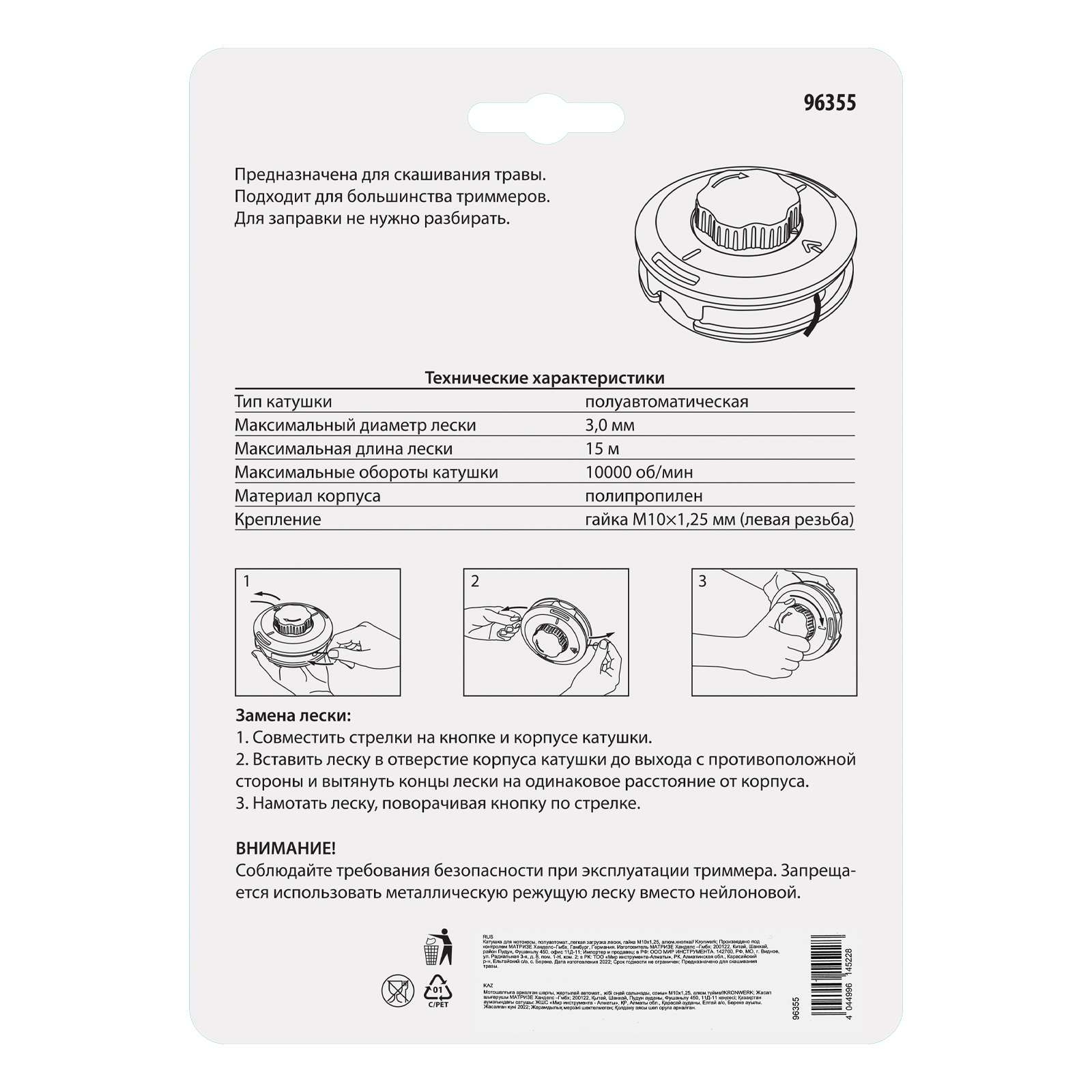 <p>Полуавтоматическая катушка для мотокосы Kronwerk 96355, с системой легкой загрузки лески, используется в качестве сменного элемента для электрических и бензиновых триммеров любых моделей с креплением оси М10 х 1,25 L и левым направлением резьбы. Заправляется леской с сечением круг, квадрат, треугольник, пятиугольник, клевер и др.</p><h2>Преимущества</h2><ul><li>Высокая эффективность — катушка заправляется леской толщиной до 3 мм, поэтому легко справится не только с газонной, но и с многолетней высокой травой.</li><li>Прочность и долговечность — корпус выполнен из прочного полипропилена, кнопка — из алюминия.</li><li>Полуавтоматический тип — для обновления лески не нужно прерывать работу, достаточно слегка стукнуть шпулей по земле.</li><li>Легкая загрузка лески — катушку не надо разбирать для заправки.</li></ul>