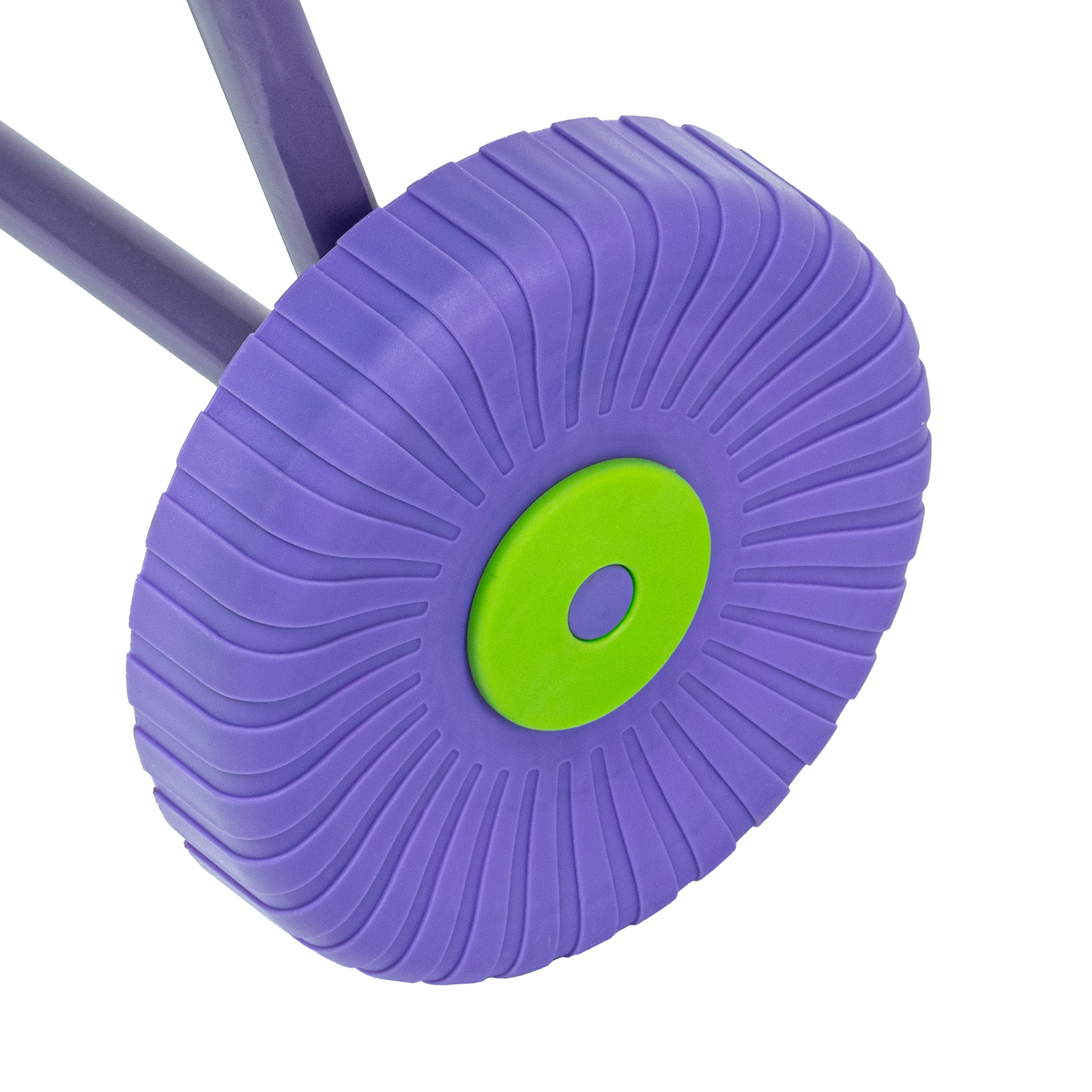 - Удобное хранение и транспортировка — приспособление имеет складную ручку, а крупные колеса упрощают его перемещение по участку.