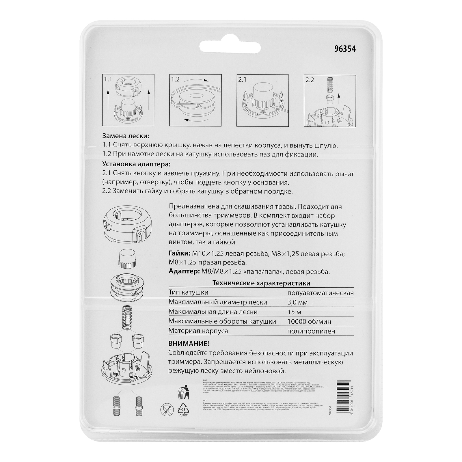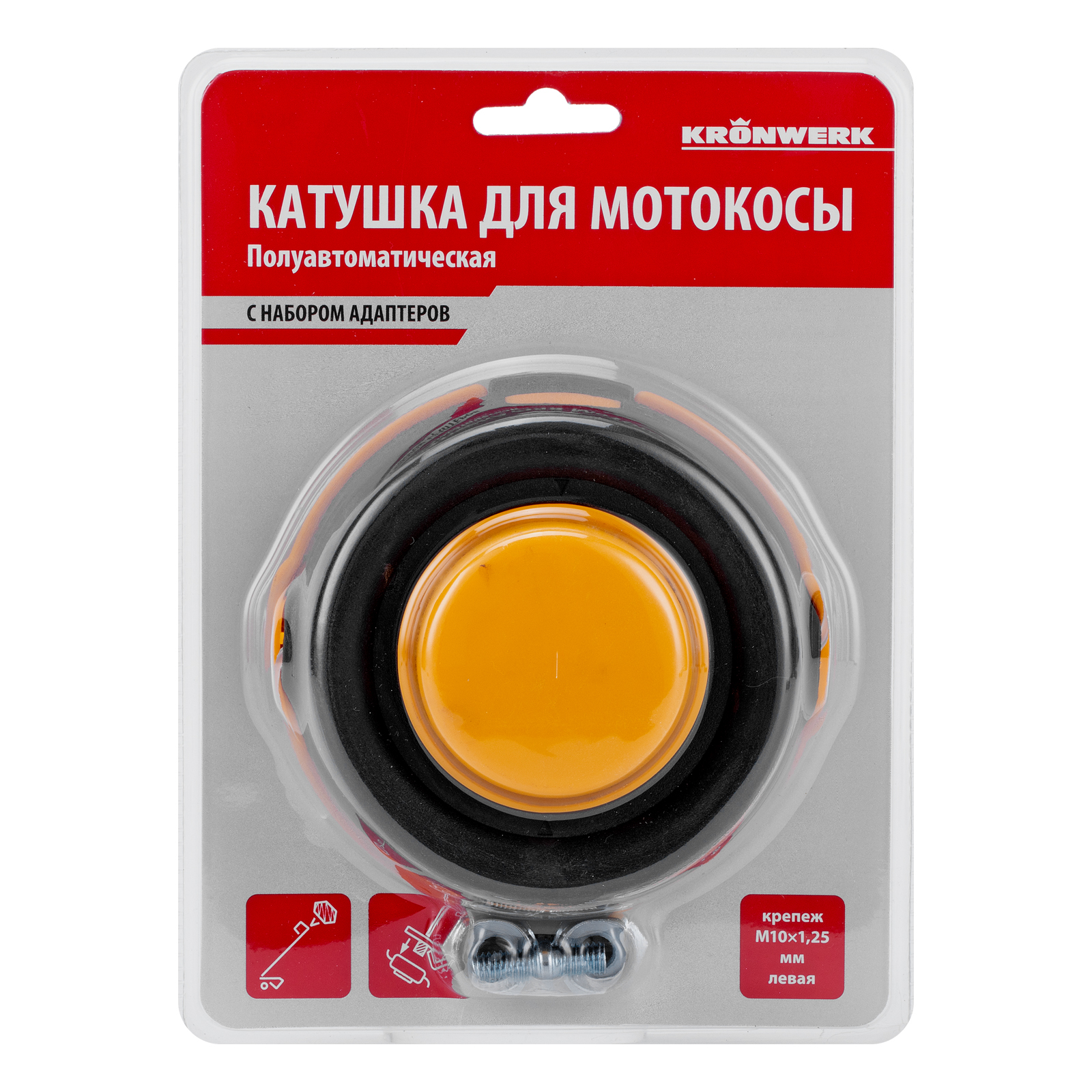 Катушка для триммера Kronwerk 96354 с креплением M10 с шагом 1,25 мм и левой резьбой — сменный элемент для бензиновых и электрических моделей. В качестве режущего элемента используется прочная нейлоновая леска диаметром до 3 мм. Подходящее сечение лески: круг, звезда, треугольник, квадрат, клевер или другое. Катушка поставляется с гайками M8 с правой и левой резьбой, а также адаптером M8.