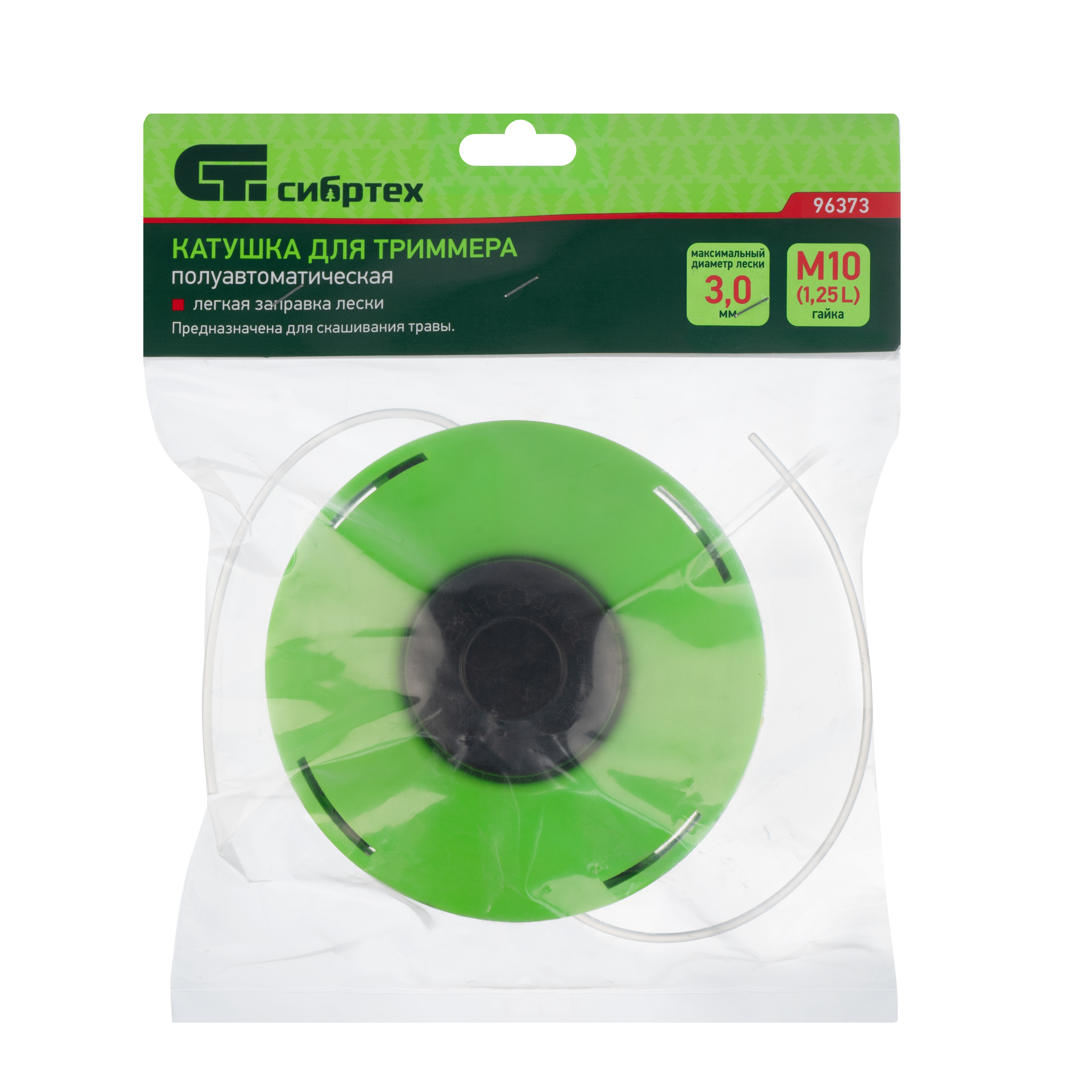 <p>Полуавтоматическая катушка Сибртех 96373 с легкой заправкой лески крепится на вал бензинового или электрического триммера при помощи гайки М10 х 1,25 мм с левой резьбой. Заправляется леской диаметром до 3 мм, что позволяет использовать ее для подравнивания газона и скашивания сорняков. Катушка пригодится владельцам загородных участков.</p><h2>Преимущества</h2><ul><li>Легкая заправка — благодаря продуманной конструкции катушки не нужно разбирать корпус при подготовке к работе.</li><li>Быстрое обновление лески — не нужно выключать триммер, достаточно слегка ударить катушкой о землю.</li><li>Резьбовое крепление — установка катушки на вал триммера осуществляется без дополнительного инструмента.</li></ul>