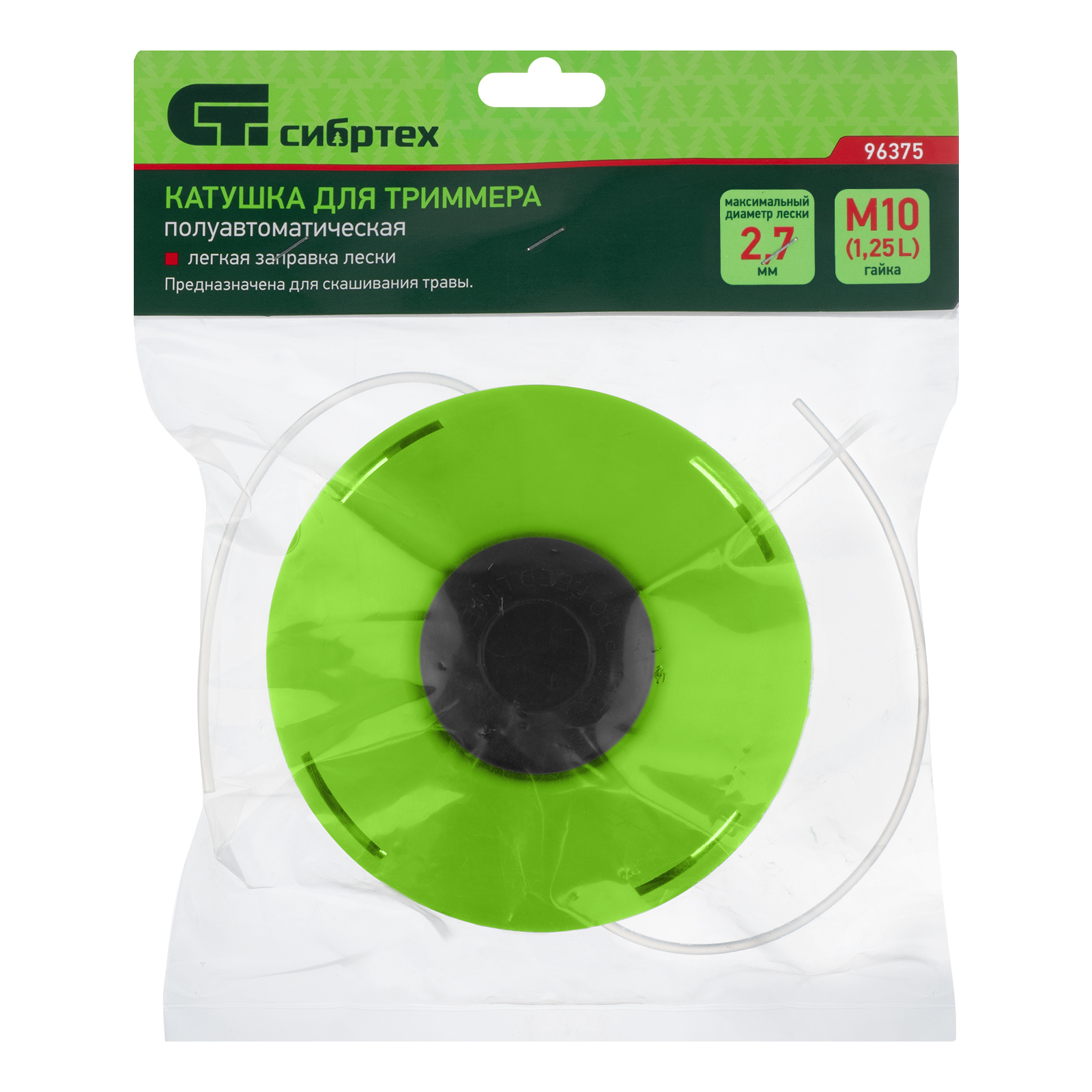 <p>Полуавтоматическая катушка Сибртех 96375 с легкой заправкой лески крепится на вал бензинового или электрического триммера при помощи гайки М10 х 1,25 мм с левой резьбой. Заправляется леской диаметром до 2,7 мм, что позволяет использовать ее для подравнивания газона и скашивания сорняков. Катушка пригодится владельцам загородных участков.</p><h2>Преимущества</h2><ul><li>Легкая заправка — благодаря продуманной конструкции катушки не нужно разбирать корпус при подготовке к работе.</li><li>Быстрое обновление лески — не нужно выключать триммер, достаточно слегка ударить катушкой о землю.</li><li>Резьбовое крепление — установка катушки на вал триммера осуществляется без дополнительного инструмента.</li></ul>