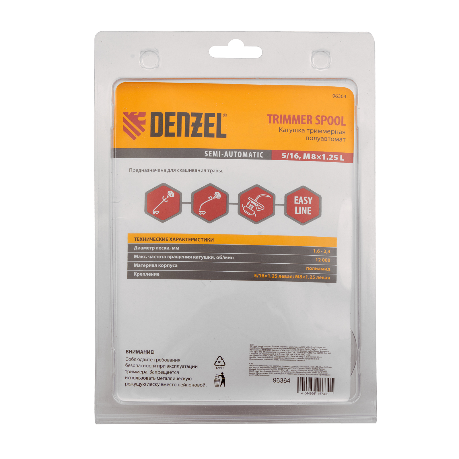 <p>Полуавтоматическая триммерная катушка Denzel 96364 с возможностью быстрой заправки, с посадкой под шестигранник HEX x 15/6, с болтом 5/16 и М8 с левой резьбой, предназначена для установки на бензиновую или электрическую косу. Совместима с режущей леской диаметром до 2 мм и успешно справляется с молодой травой на садовом участке.</p><h2>Преимущества</h2><ul><li>Надежность — корпус из полиамида PA6-GF30 устойчив к механическим повреждениям.</li><li>Быстрая подготовка к работе — благодаря системе Easy Line не нужно снимать крышку для заправки лески.</li><li>Готовность к работе — катушка поставляется в комплекте с леской диаметром 2 мм.</li><li>Совместимость с большинством триммеров — в комплект поставки входят болты 5/16 и М8 с левой резьбой.</li></ul>