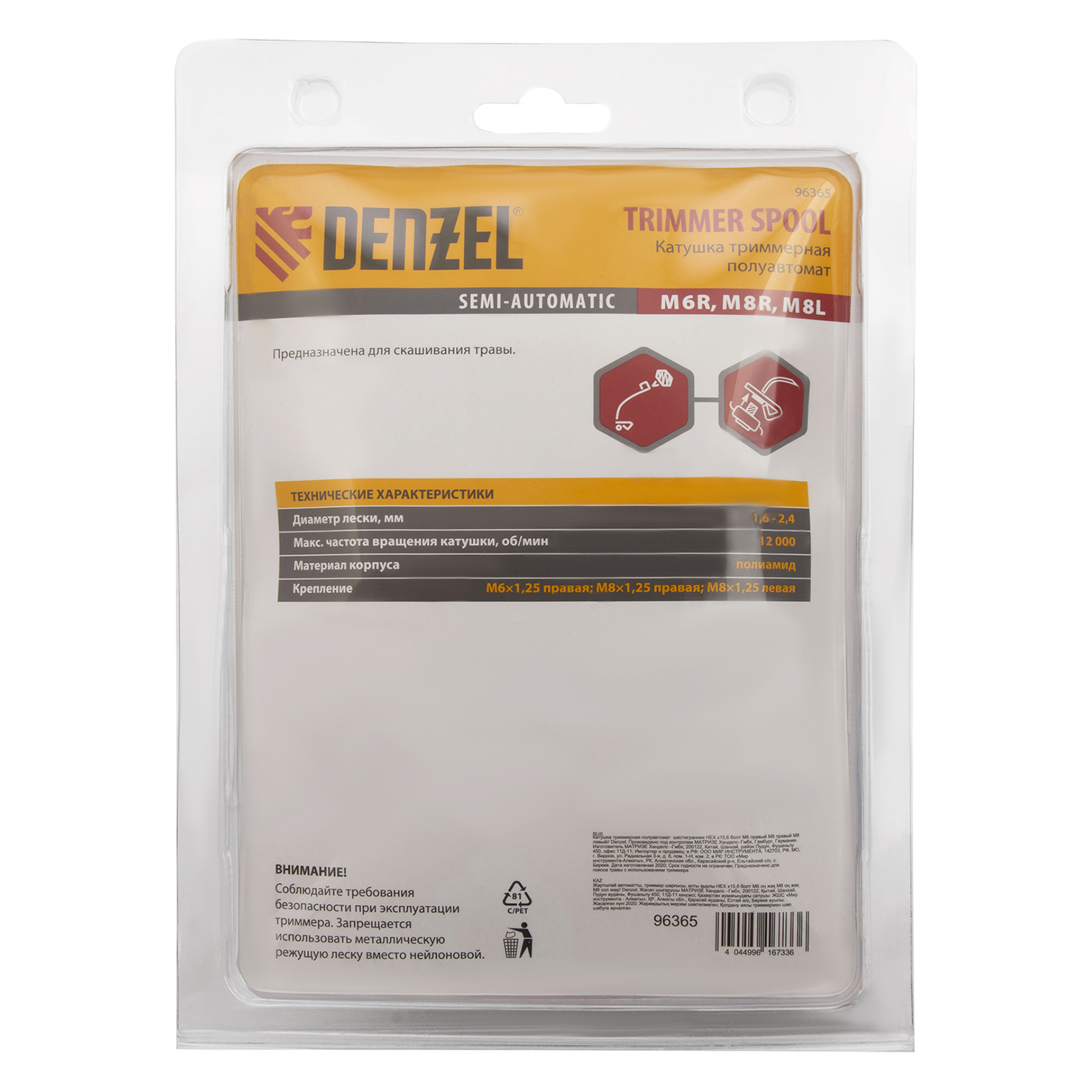 <p>Полуавтоматическая катушка для триммера Denzel 96365 устанавливается на любые марки электрических и бензиновых кос с креплением на оси НЕХ х 15/6. Режущая леска сечением до 2 мм обеспечивает комфортное скашивание молодой травы на приусадебном участке.</p><h2>Преимущества</h2><ul><li>Комплект поставки включает в себя сразу 3 дополнительных болта для крепежа — М6 х 1,25 и М8 х 1,25 с правой резьбой и М8 х 1,25 с левой.</li><li>Ударопрочный корпус сделан из полиамида PA6-GF30, поэтому не подвержен разрушениям, а после утилизации может быть отправлен на повторную переработку.</li><li>Обновление лески происходит автоматически при легком ударе шпулей о землю, поэтому отключать триммер не придется.</li></ul>