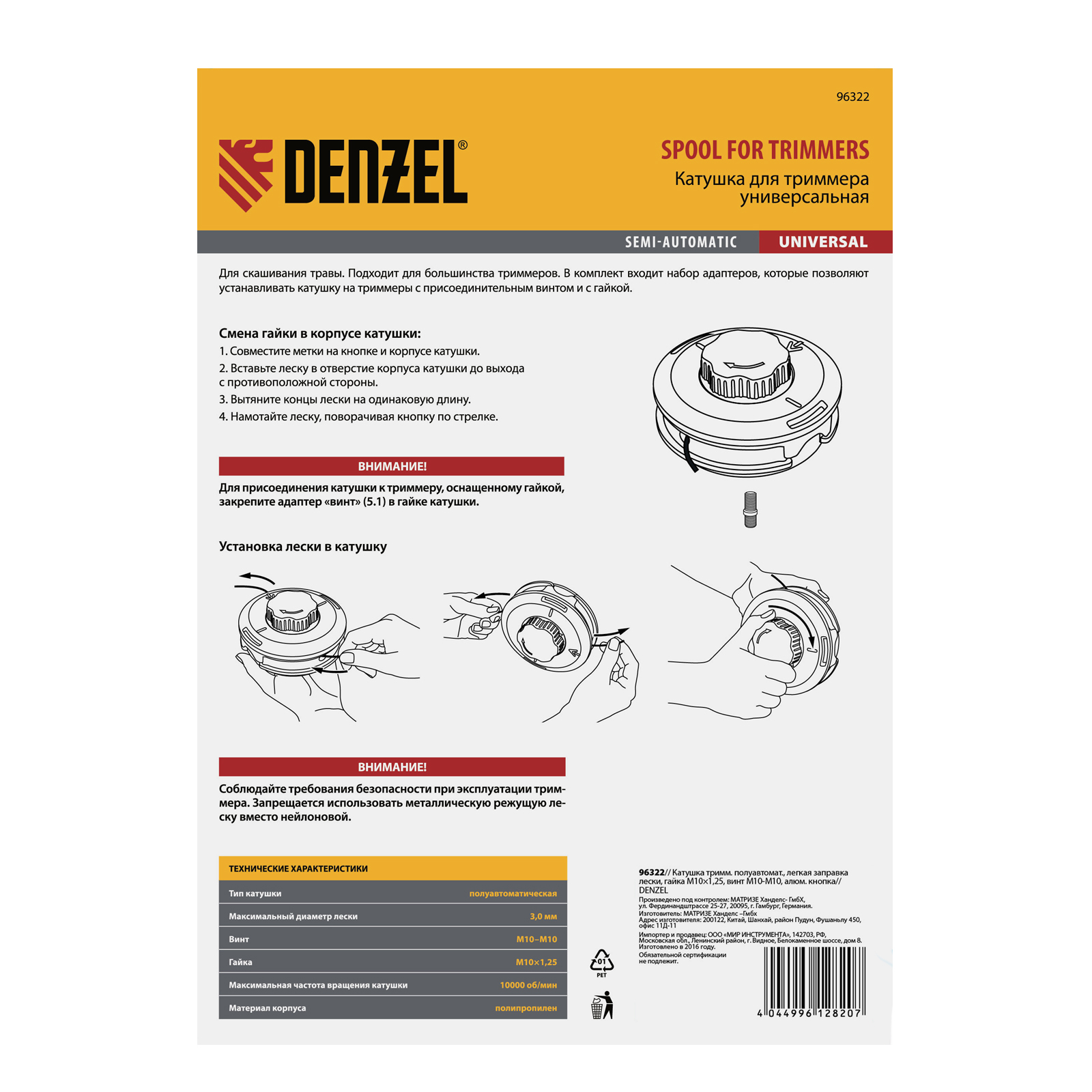 Катушка триммерная полуавтоматическая, легкая заправка лески, гайка M10x1.25, винт M10-M10, алюминиевая кнопка Denzel