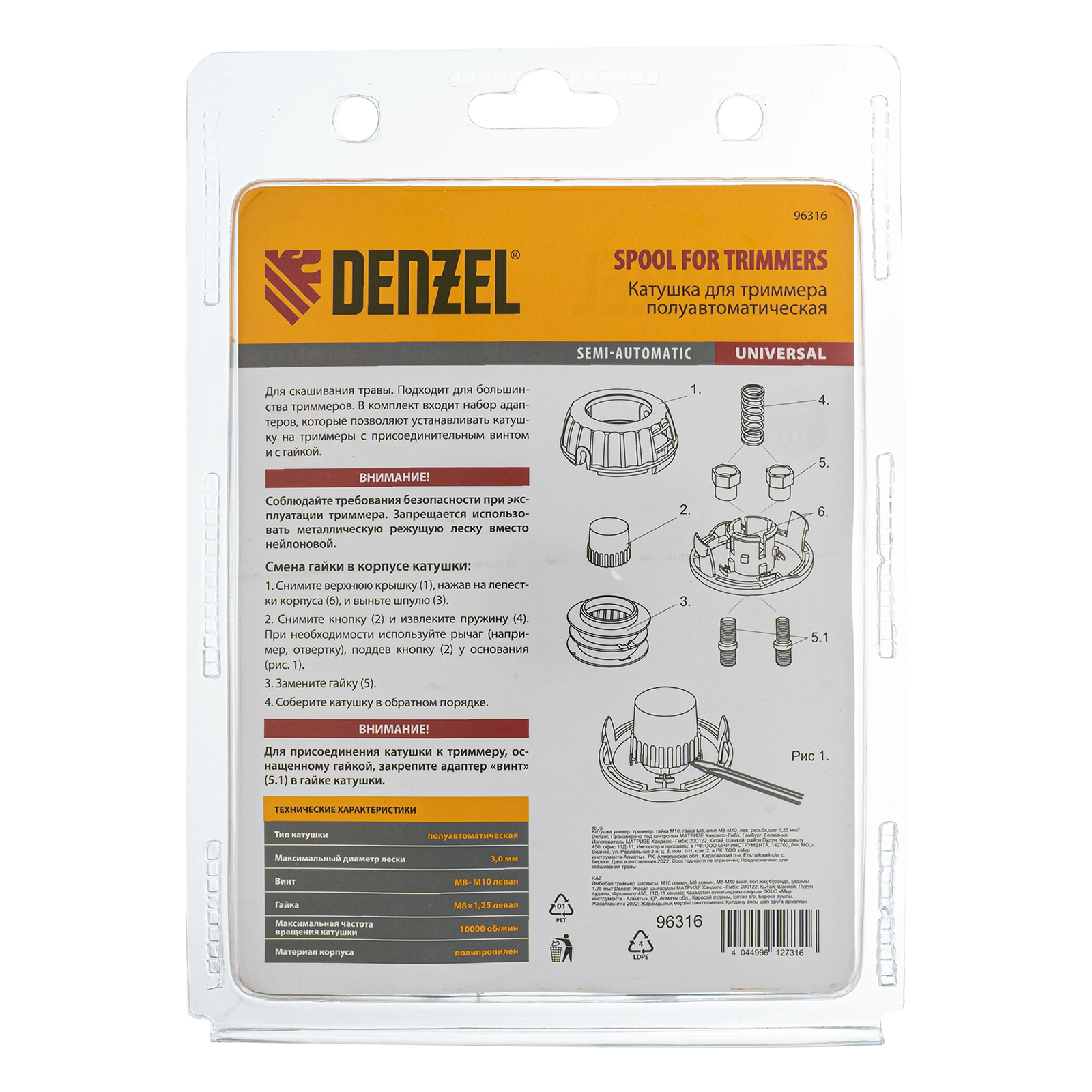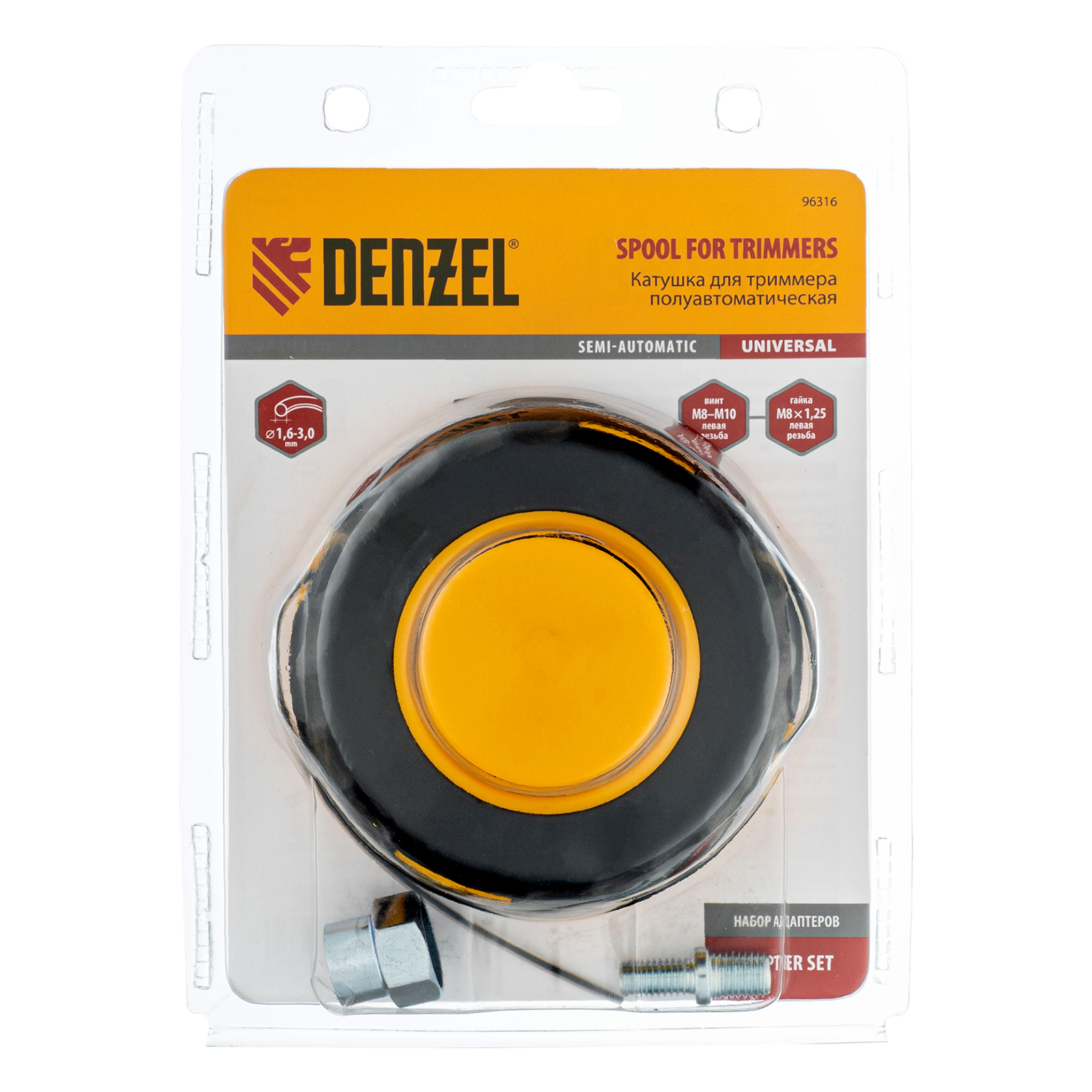 Универсальная триммерная катушка Denzel 96316 комплектуется адаптерами (гайка М10 х 1,25, гайка М8, винт М8-М10, левая резьба), поэтому совместима практически с любым электрическим и бензиновым триммером Denzel, оснащенным присоединительным винтом или гайкой. Также подходит к электро- и бензокосам от других производителей. Заправляется леской диаметром до 3 мм и позволяет решать большое количество задач: уход за газоном, скашивание сорняков, молодой поросли малины, старой и слежавшейся травы.