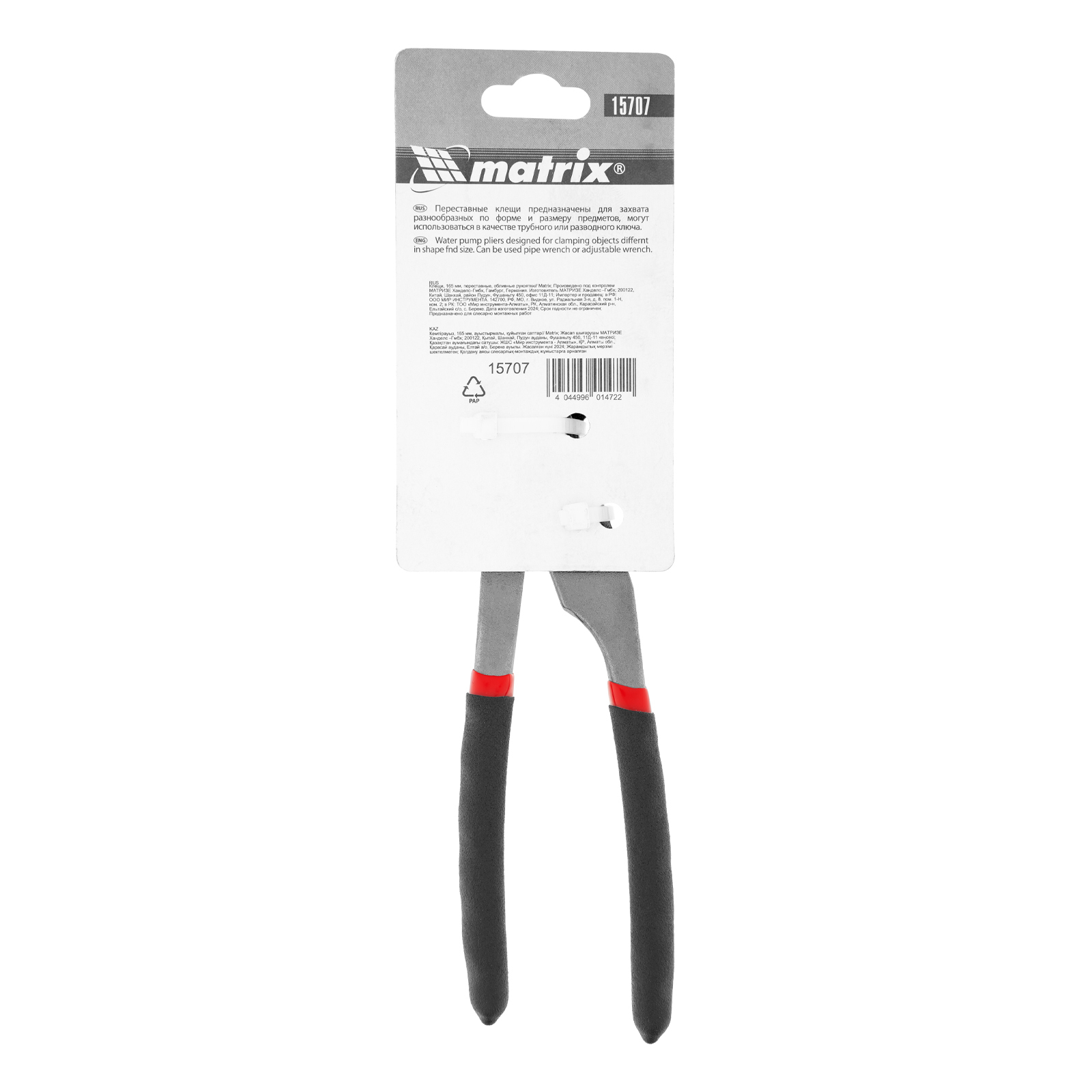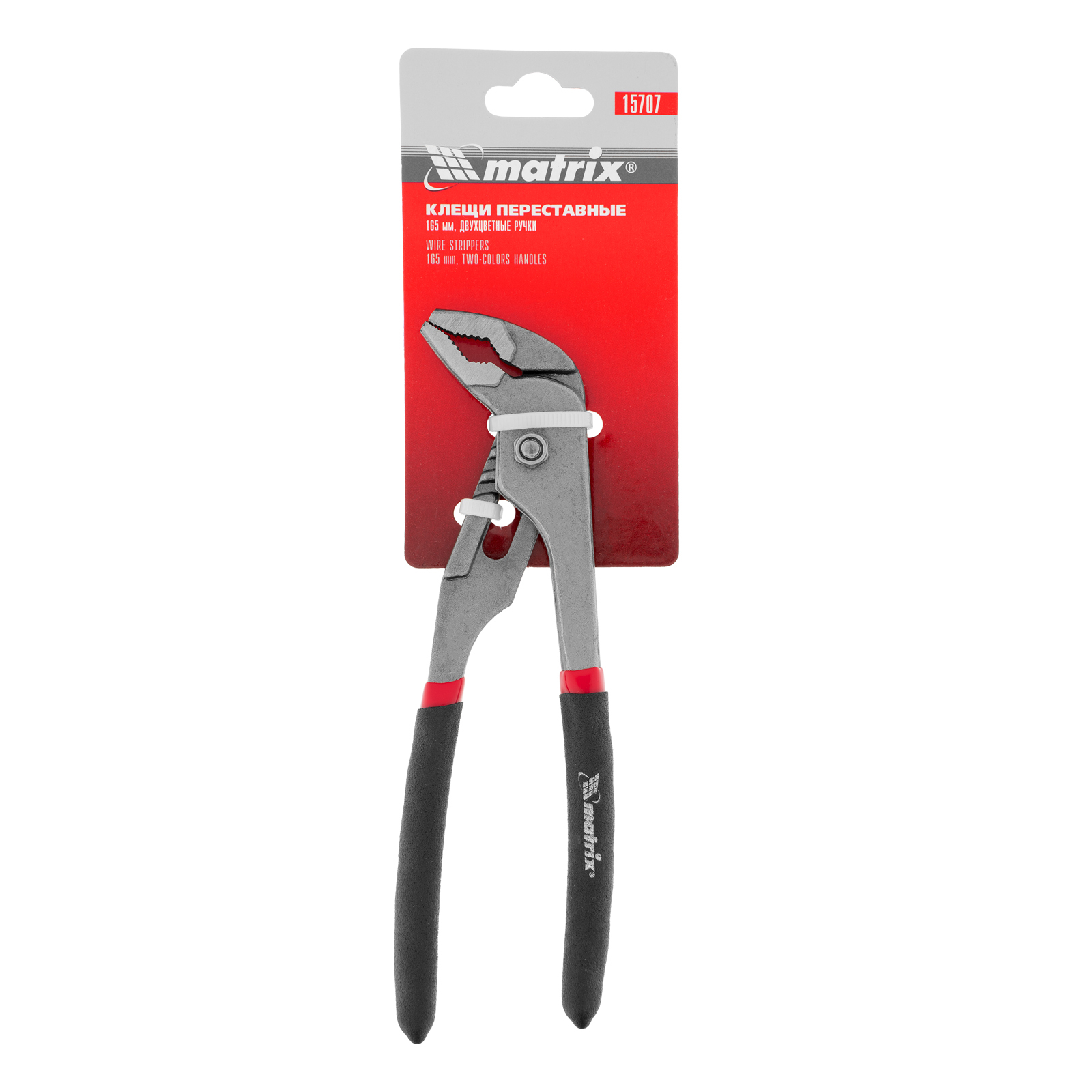 <p>Переставные клещи Matrix 15707 длиной 165 мм, с обливными рукоятками, сочетают возможности трубного и разводного ключа. Будут полезны частным мастерам и профессионалам для захвата и удержания деталей во время слесарных и монтажных работ.</p><h2>Преимущества</h2><ul><li>Высокий ресурс — клещи из прочной углеродистой стали рассчитаны на долгий срок службы.</li><li>Эффективная работа — острая насечка на губках облегчает захват предметов без специального рабочего профиля.</li><li>Регулировка открытия зева — клещи способны захватывать разные по форме и размеру предметы.</li><li>Эргономичность — обливные рукоятки надежно лежат в руке и не выскальзывают из ладони.</li></ul>