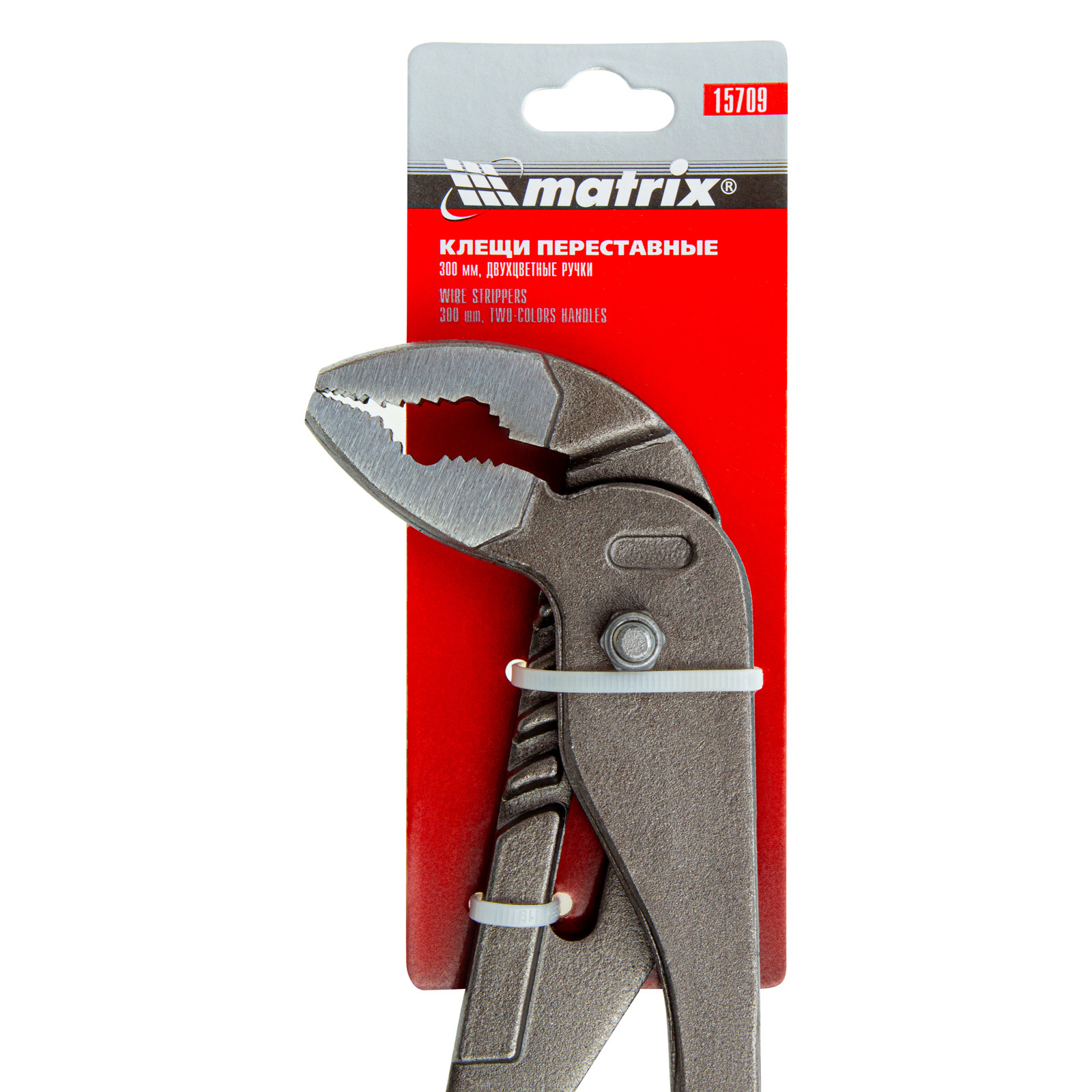 <p>Переставные клещи Matrix 15709 длиной 300 мм, с обливными рукоятками, сочетают возможности трубного и разводного ключей. Будут полезны частным мастерам и профессионалам для захвата и удержания деталей во время слесарных и монтажных работ.</p><h2>Преимущества</h2><ul><li>Высокий ресурс — клещи из прочной углеродистой стали рассчитаны на долгий срок службы.</li><li>Эффективная работа — острая насечка на губках облегчает захват предметов без специального рабочего профиля.</li><li>Регулировка открытия зева — клещи способны захватывать разные по форме и размеру предметы.</li><li>Эргономичность — обливные рукоятки надежно лежат в руке и не выскальзывают из ладони.</li></ul>