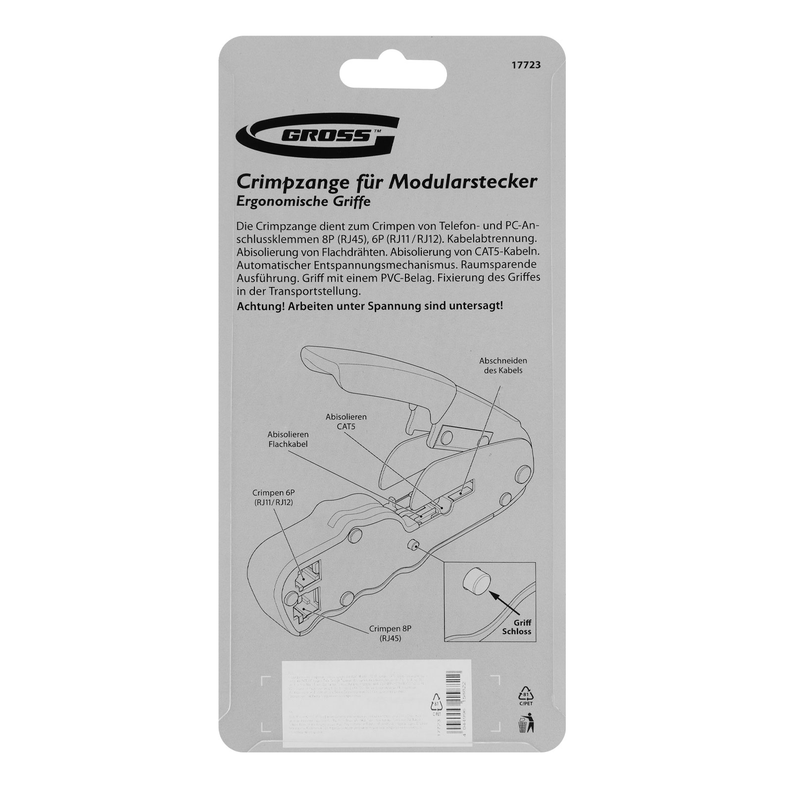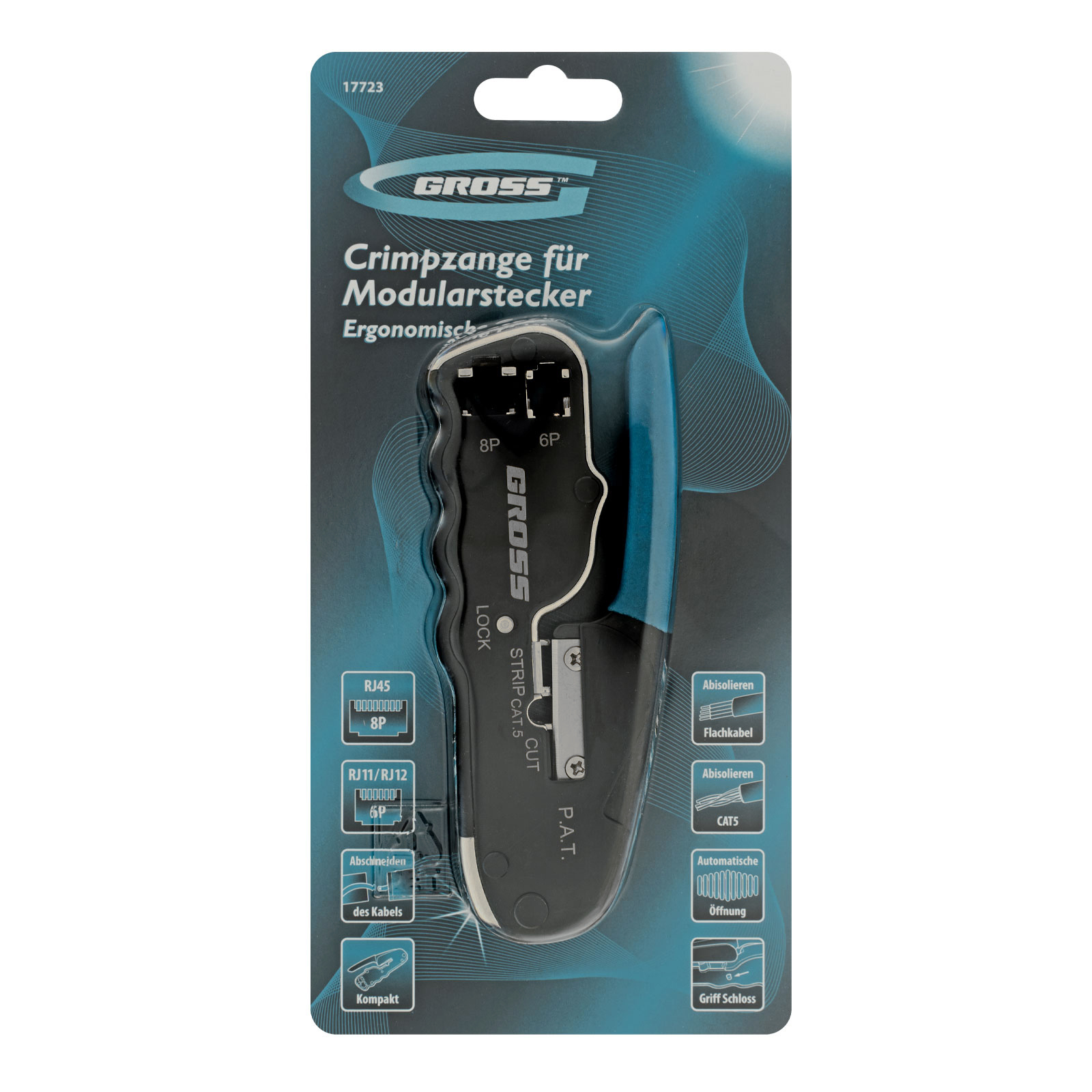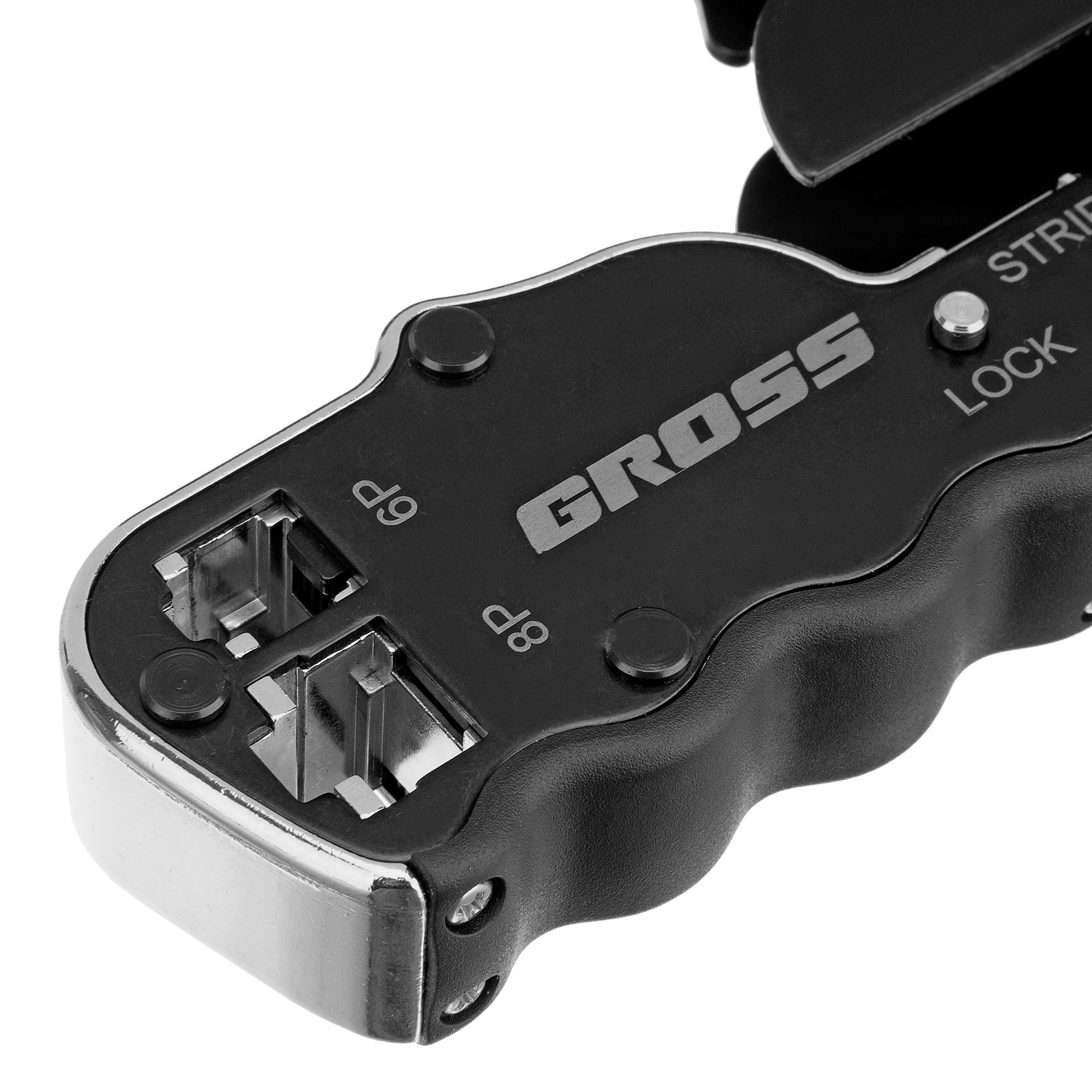 <p>Компактные клещи Gross 17723 предназначены для обжима телефонных и компьютерных клемм наиболее популярных типоразмеров RJ45, 8P и RJ11/12, 6P, а также для зачистки кабеля CAT5. Пригодятся частным мастерам и профессионалам для подключения компьютеров и телефонов к сети.</p><h2>Преимущества</h2><ul><li>Надежность и долговечность — рабочие лезвия изготовлены из высококачественной японской стали SK5.</li><li>Дополнительные возможности — инструмент подходит для обрезки проводов.</li><li>Комфортное использование — благодаря обрезиненной рукоятке клещи не выскальзывают из ладони, что снижает усталость во время длительной работы.</li><li>Безопасное хранение и транспортировка — фиксатор надежно удерживает рукоятку в нерабочем положении.</li></ul>