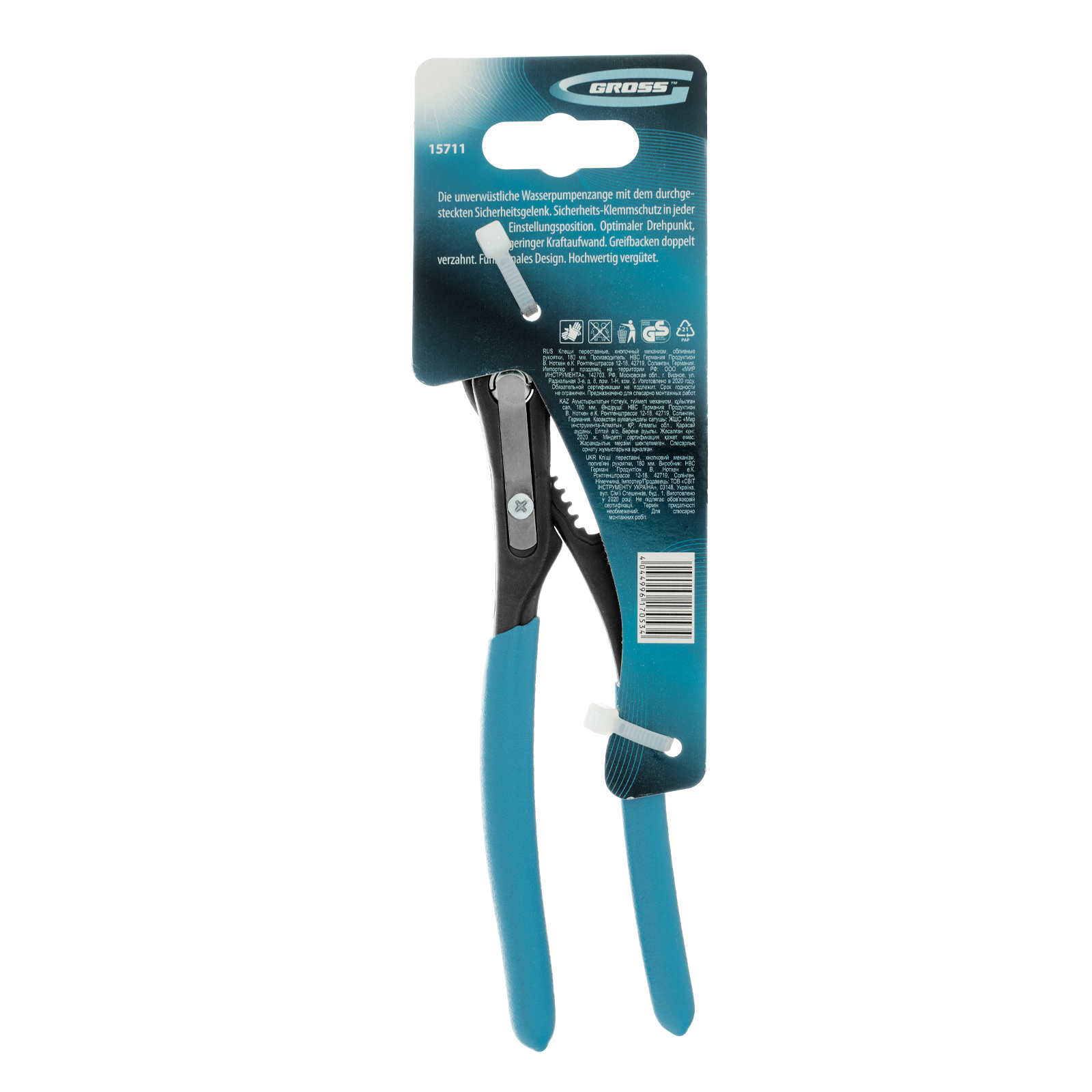 Клещи переставные, кнопочный механизм, обливные рукоятки, 180 мм Gross