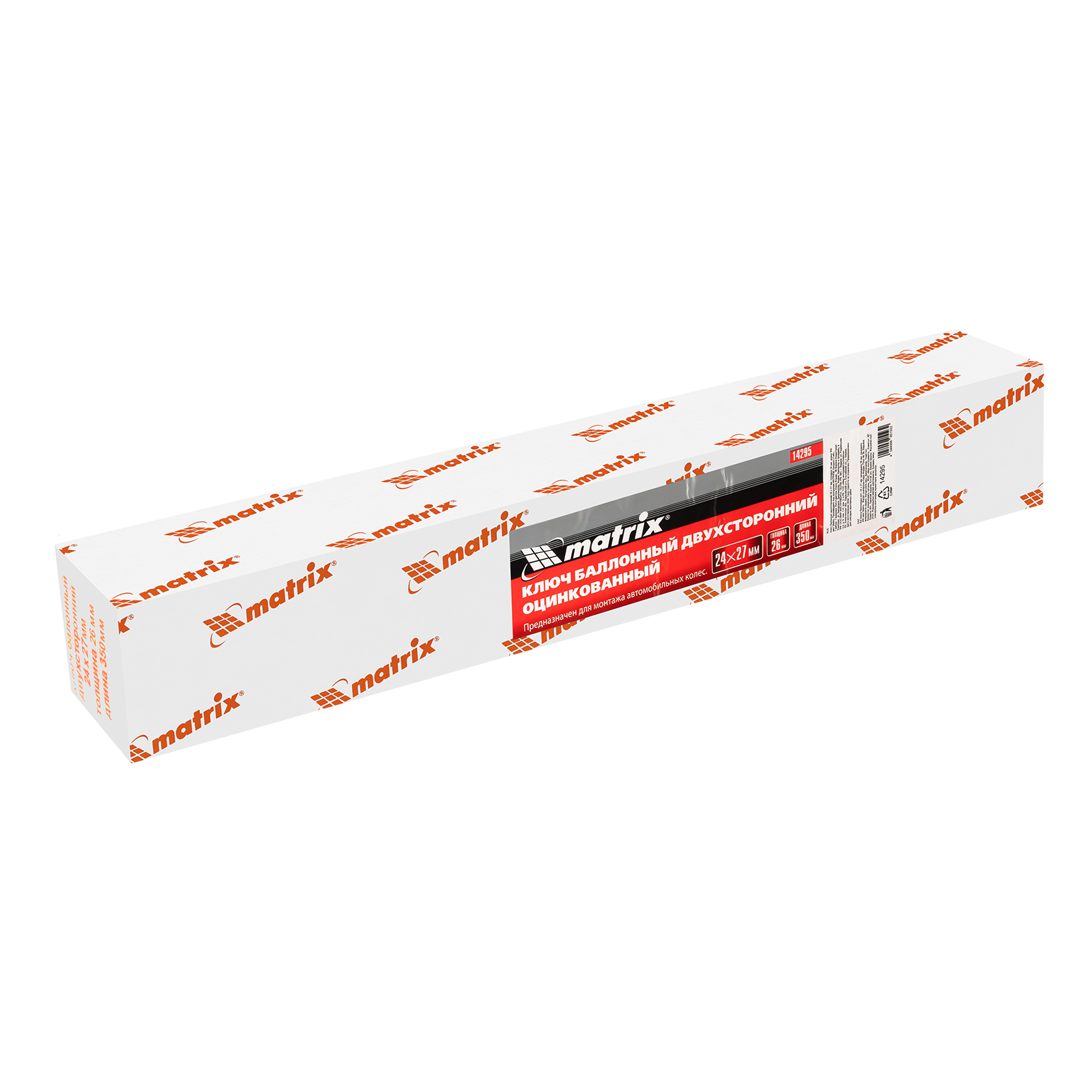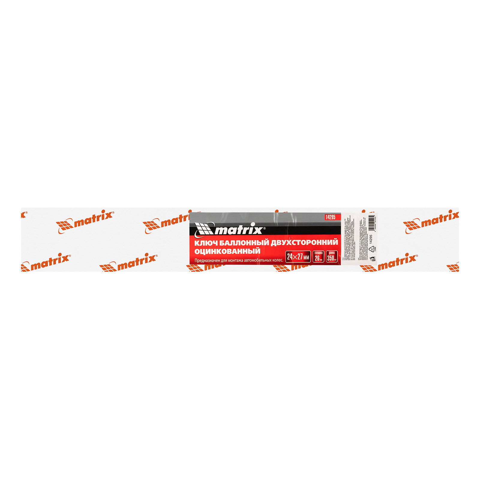 <p>Двухсторонний баллонный ключ Matrix 14295, 24 х 27 мм, толщиной 26 мм и длиной 350 мм, используется для шиномонтажных работ на грузовом транспорте и автобусах. Две несъемные торцевые шестигранные головки подходят под крепеж 24 и 27 мм. Инструмент применяется на станциях техобслуживания.</p><h2>Преимущества</h2><ul><li>Устойчивость к значительным нагрузкам — ключ изготовлен из углеродистой стали 45, рабочие части закалены до твердости 41 HRC (полное соответствие ГОСТу).</li><li>Высокий показатель прочности — толщина инструмента составляет 26 мм.</li><li>Эксплуатация в любых условиях — цинковое покрытие защищает ключ от коррозии.</li></ul>