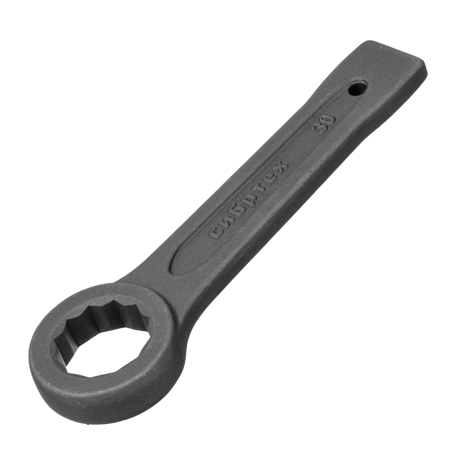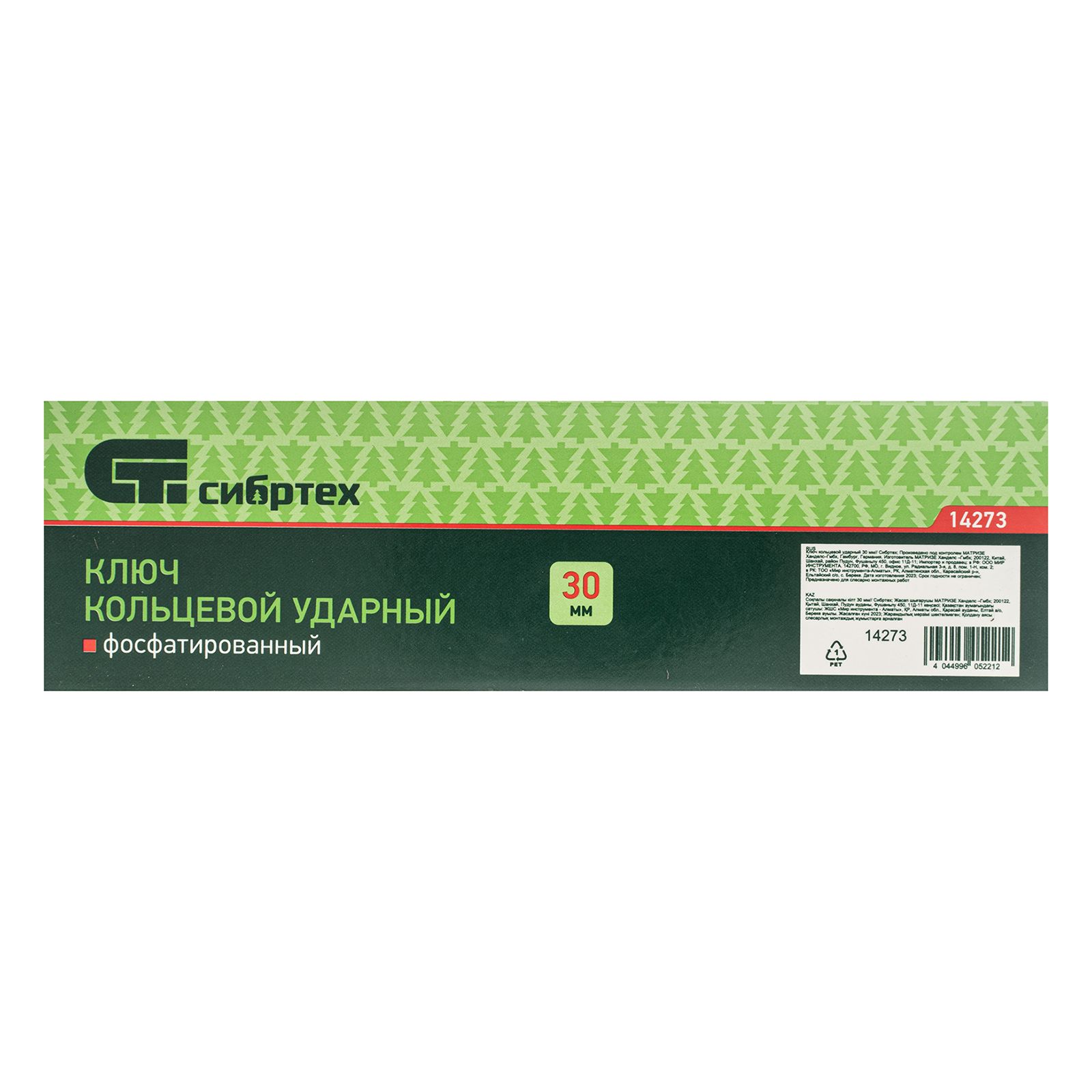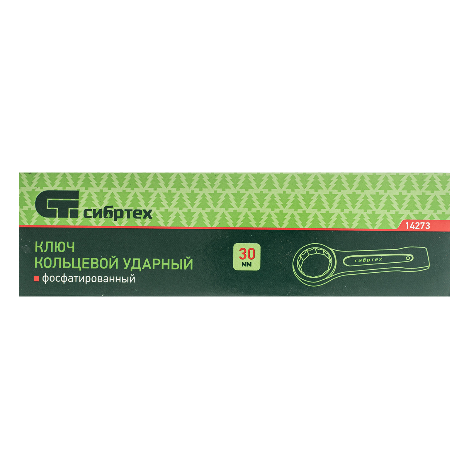 <p>Ключ кольцевой ударный Сибртех 14273 позволяет откручивать и закручивать резьбовые соединения размером 30 мм. Благодаря 12-гранному профилю надежно удерживает головку крепежа. Удобен для работы в ограниченном пространстве — для перестановки его достаточно повернуть на 30°. Инструмент применяется в слесарных мастерских, будет полезен во время ремонта, а также для решения бытовых задач.</p><h2>Преимущества</h2><ul><li>Эффективная работа с туго затянутым крепежом — одна сторона ключа утолщена и предназначена для ударных воздействий.</li><li>Устойчивость к нагрузкам — инструмент изготовлен из прочной углеродистой стали 45.</li><li>Долговечность — при производстве использована технология фосфатирования, обеспечивающая устойчивость к коррозии.</li></ul>