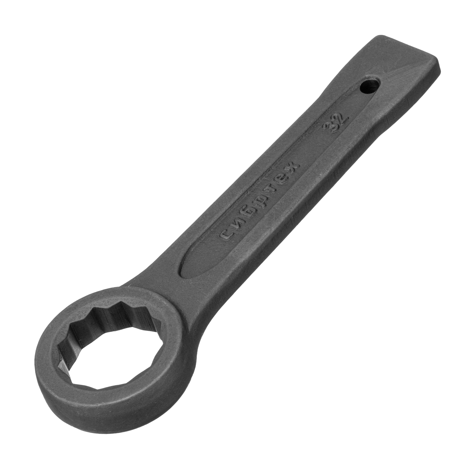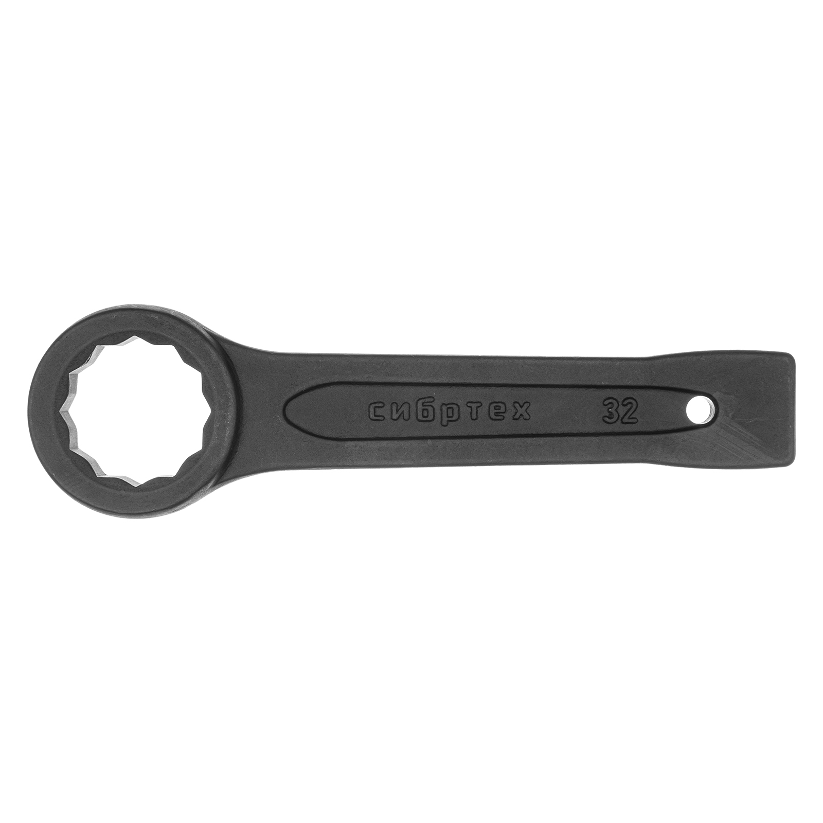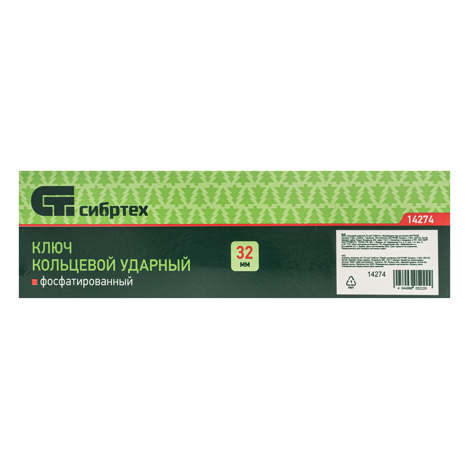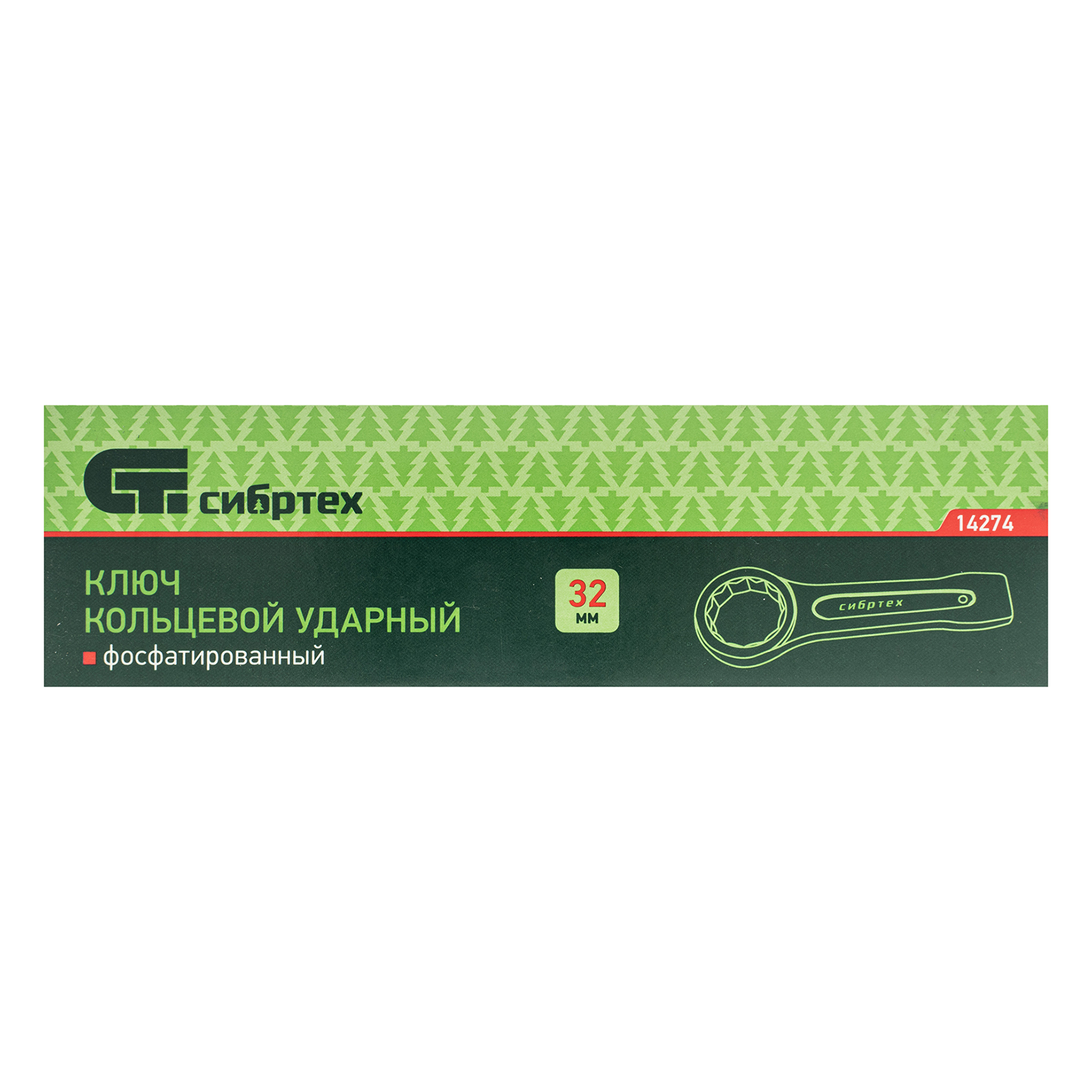 <p>Ключ кольцевой ударный Сибртех 14274 позволяет откручивать и закручивать резьбовые соединения размером 32 мм. Благодаря 12-гранному профилю надежно удерживает головку крепежа. Удобен для работы в ограниченном пространстве — для перестановки его достаточно повернуть на 30°. Инструмент применяется в слесарных мастерских, будет полезен во время ремонта, а также для решения бытовых задач.</p><h2>Преимущества</h2><ul><li>Эффективная работа с туго затянутым крепежом — одна сторона ключа утолщена и предназначена для ударных воздействий.</li><li>Устойчивость к нагрузкам — инструмент изготовлен из прочной углеродистой стали 45.</li><li>Долговечность — при производстве использована технология фосфатирования, обеспечивающая устойчивость к коррозии.</li></ul>