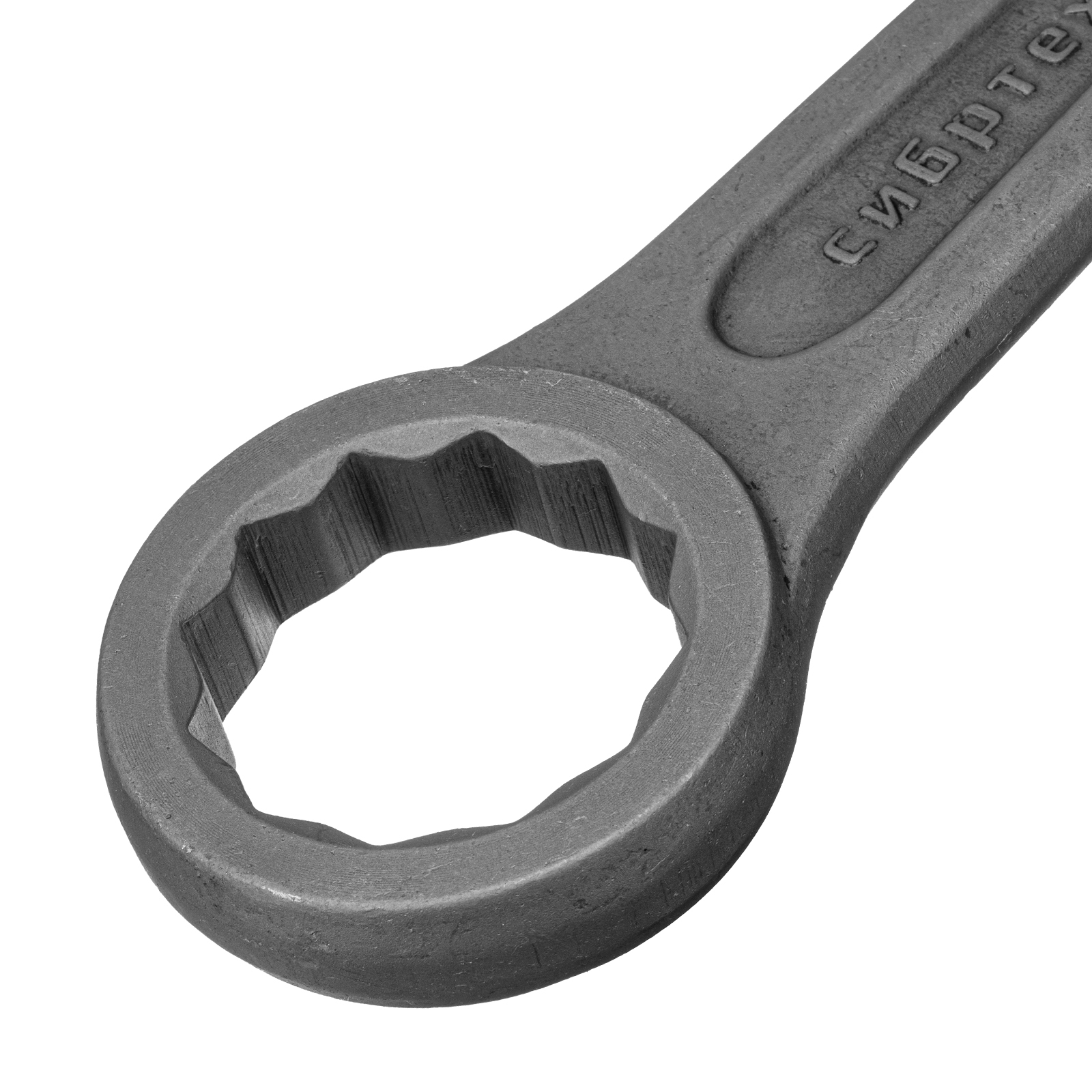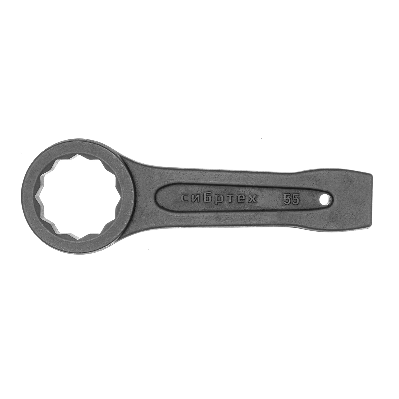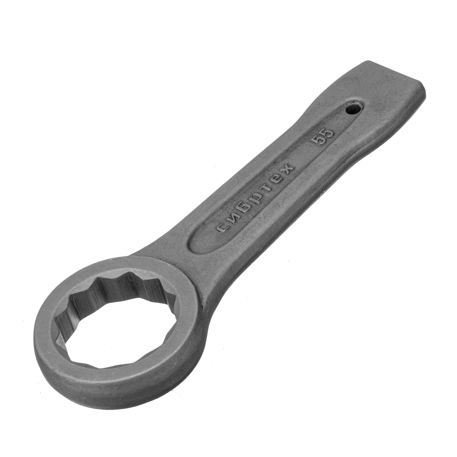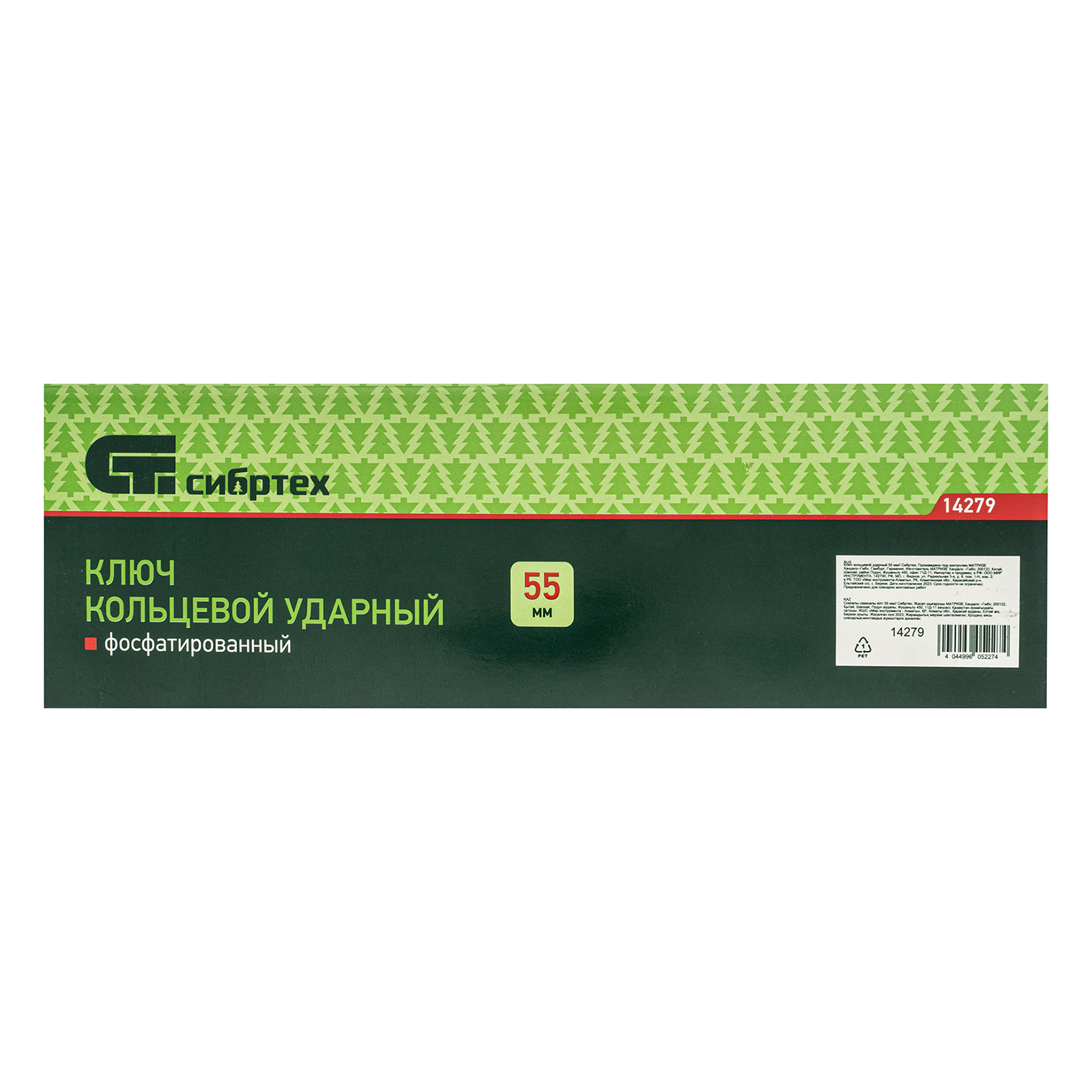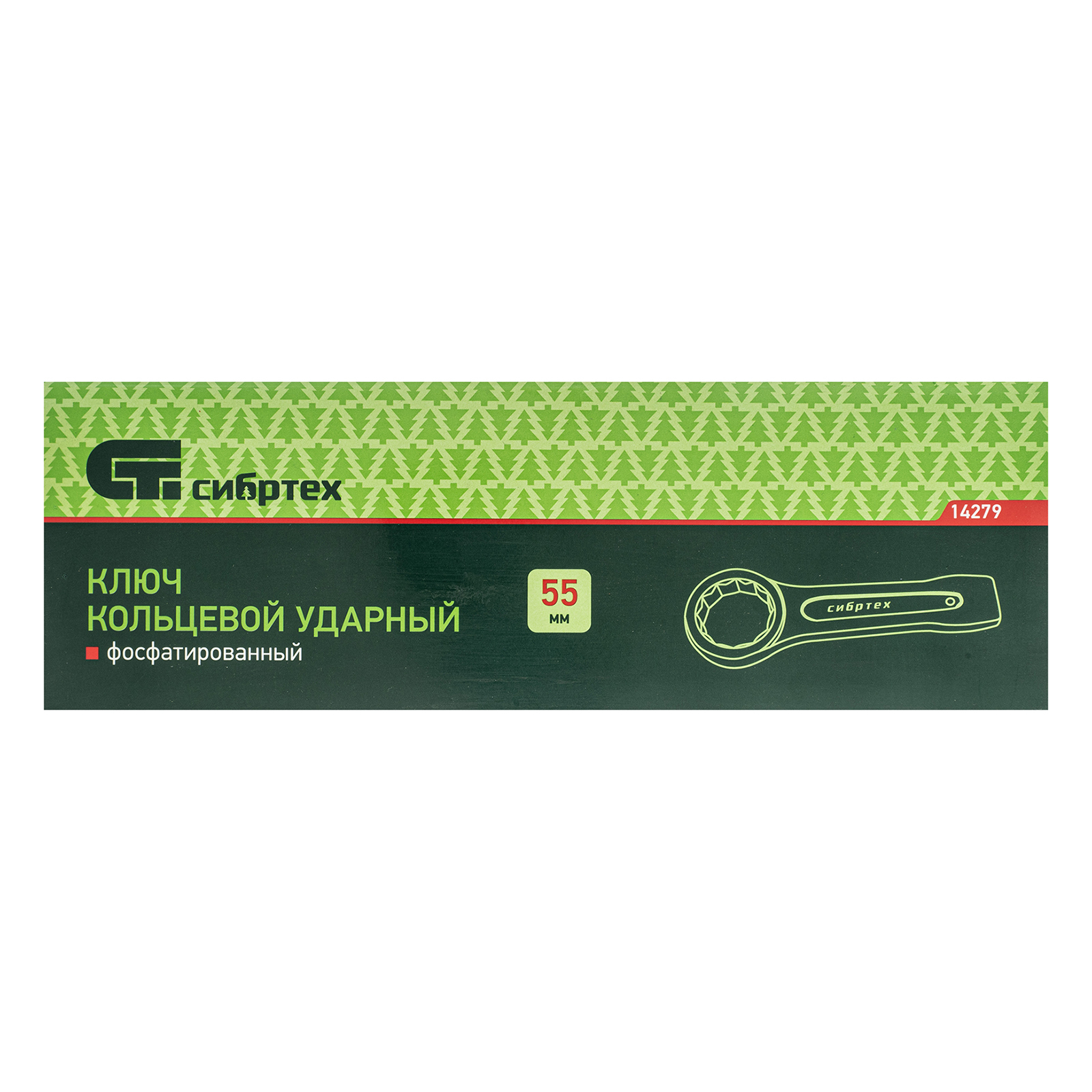 <p>Ключ кольцевой ударный Сибртех 14279 позволяет откручивать и закручивать резьбовые соединения размером 55 мм. Благодаря 12-гранному профилю надежно удерживает головку крепежа. Удобен для работы в ограниченном пространстве — для перестановки его достаточно повернуть на 30°. Инструмент применяется в слесарных мастерских, будет полезен во время ремонта, а также для решения бытовых задач.</p><h2>Преимущества</h2><ul><li>Эффективная работа с туго затянутым крепежом — одна сторона ключа утолщена и предназначена для ударных воздействий.</li><li>Устойчивость к нагрузкам — инструмент изготовлен из прочной углеродистой стали 45.</li><li>Долговечность — при производстве использована технология фосфатирования, обеспечивающая устойчивость к коррозии.</li></ul>