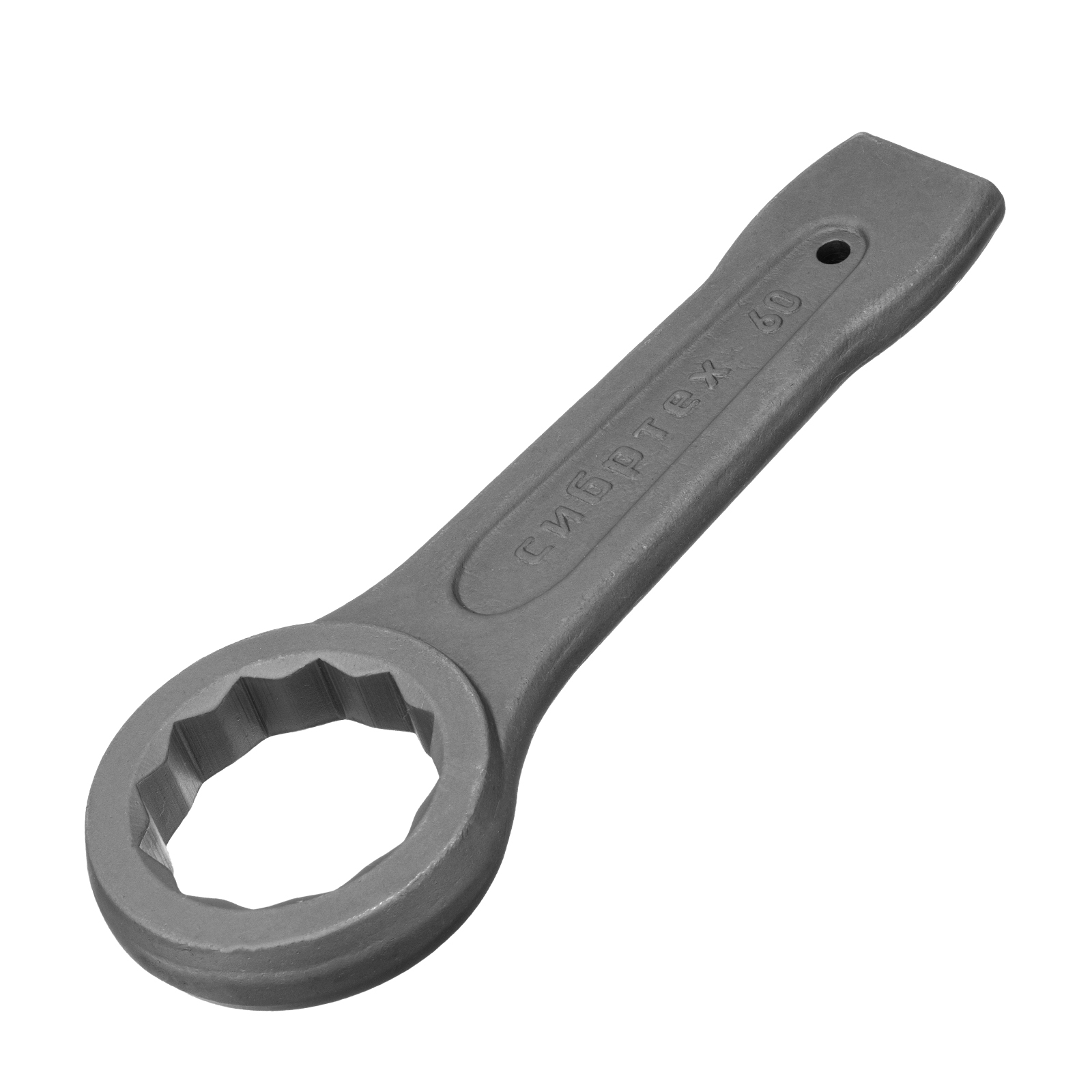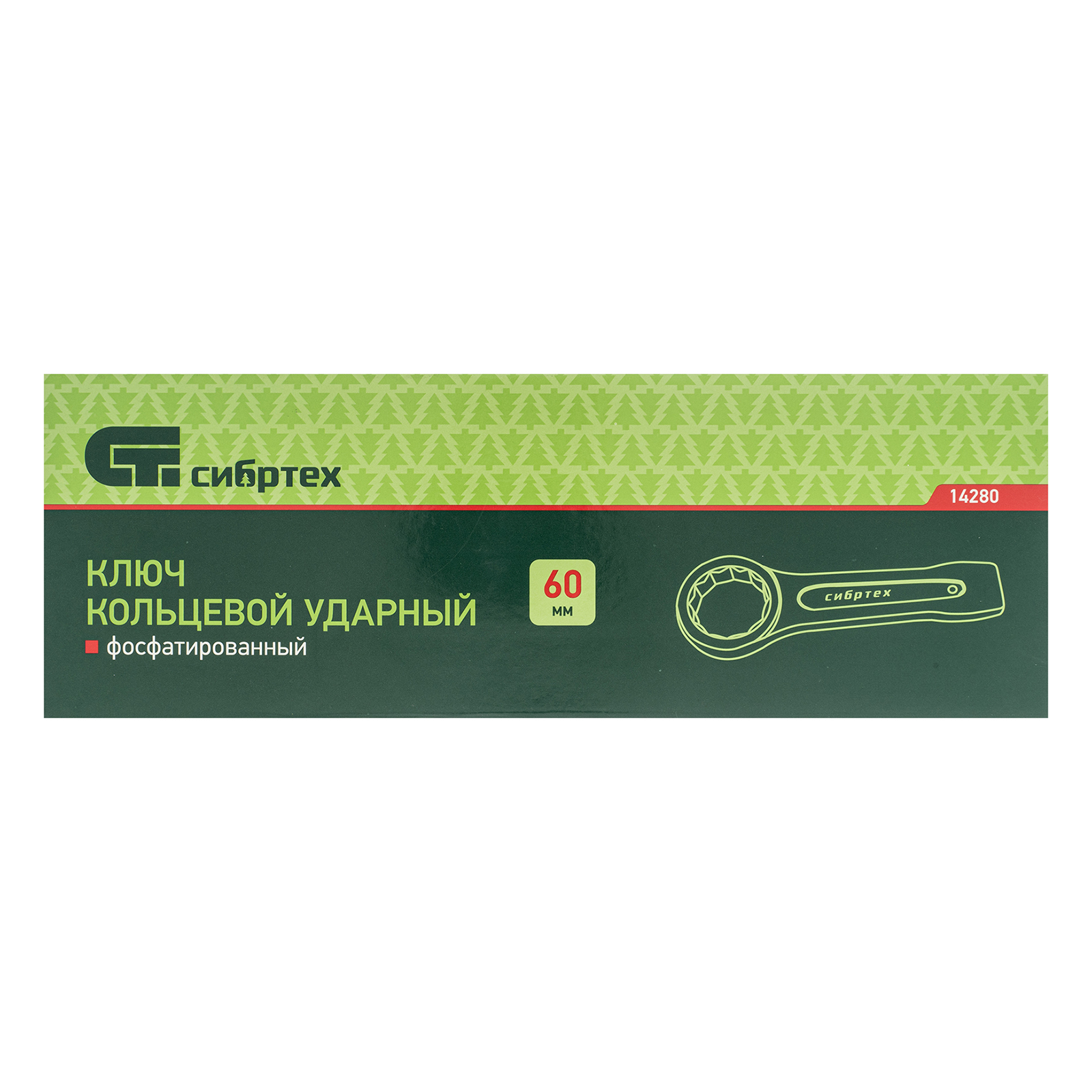 <p>Ключ кольцевой ударный Сибртех 14280 позволяет откручивать и закручивать резьбовые соединения размером 60 мм. Благодаря 12-гранному профилю надежно удерживает головку крепежа. Удобен для работы в ограниченном пространстве — для перестановки его достаточно повернуть на 30°. Инструмент применяется в слесарных мастерских, будет полезен во время ремонта, а также для решения бытовых задач.</p><h2>Преимущества</h2><ul><li>Эффективная работа с туго затянутым крепежом — одна сторона ключа утолщена и предназначена для ударных воздействий.</li><li>Устойчивость к нагрузкам — инструмент изготовлен из прочной углеродистой стали 45.</li><li>Долговечность — при производстве использована технология фосфатирования, обеспечивающая устойчивость к коррозии.</li></ul>