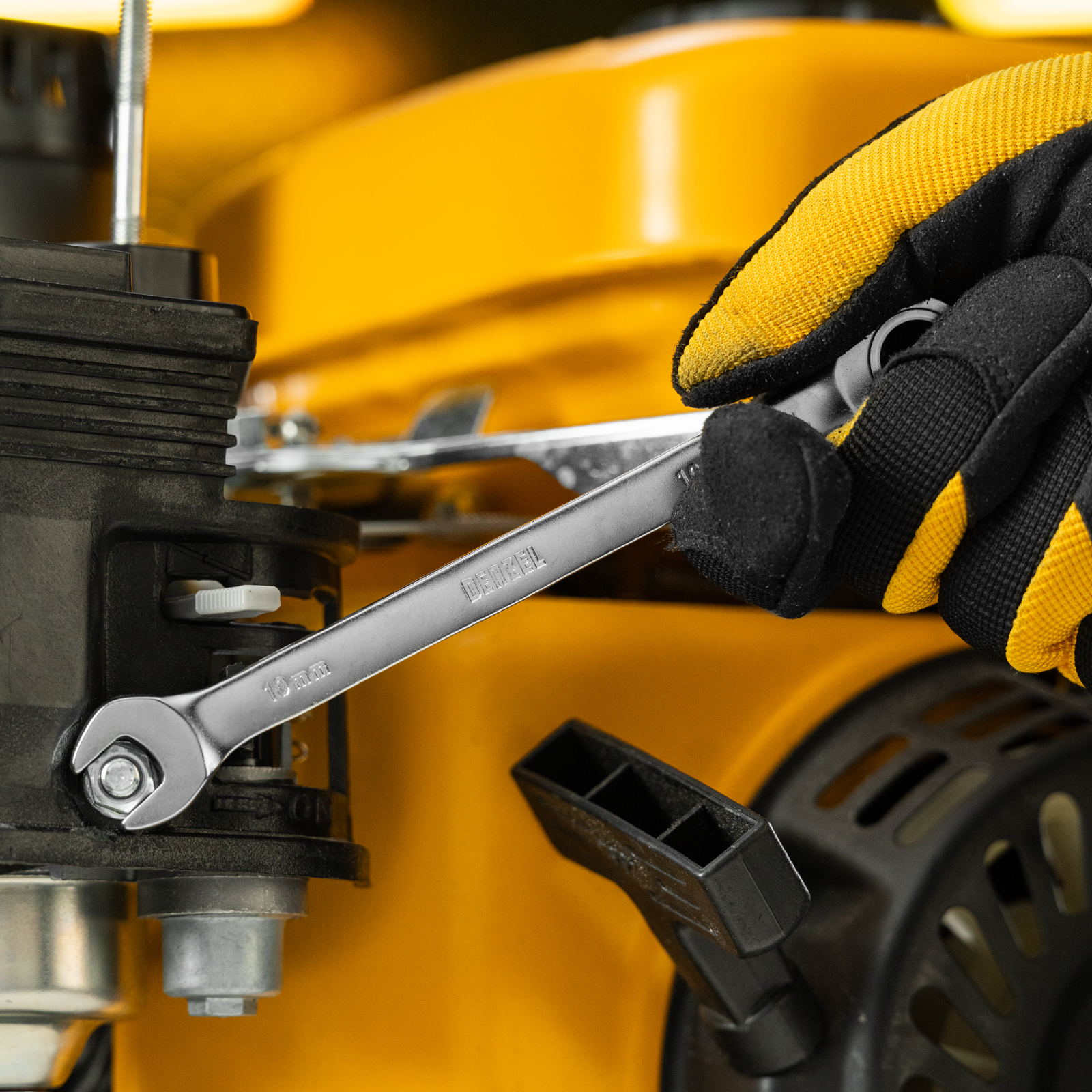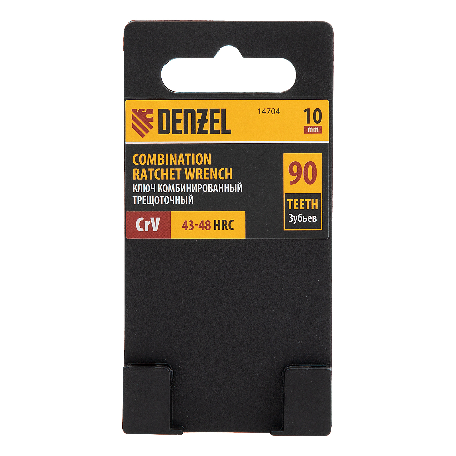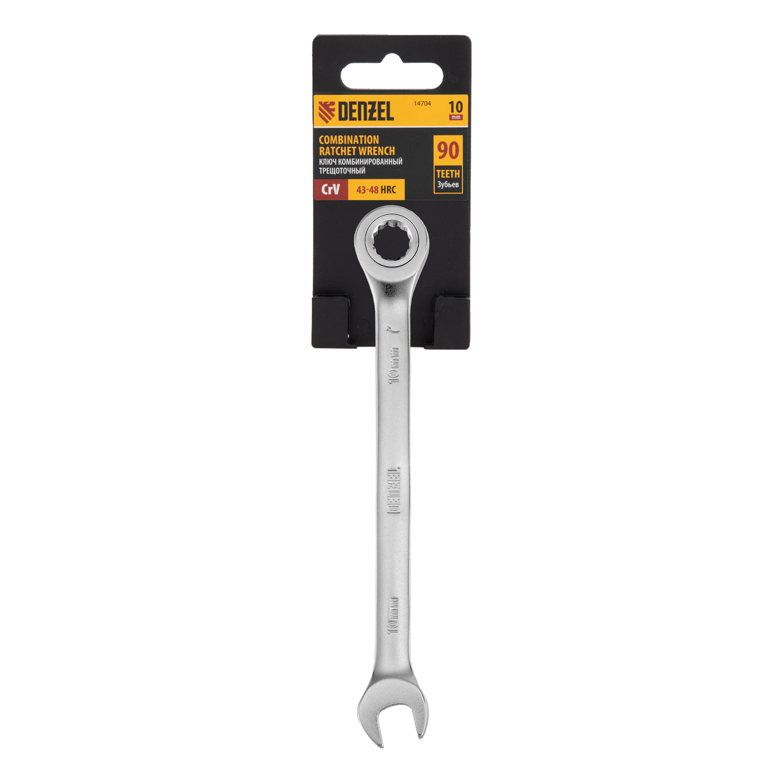 <p>Комбинированный трещоточный ключ Denzel 14704 из стали CrV, с защитным покрытием «матовый хром», предназначен для работы с резьбовым крепежом размером 10 мм. Рожковый профиль упрощает работу в местах, где использование накидной рабочей части невозможно. Хромированное кольцо обеспечивает сохранность и долговечность инструмента. Ключ будет полезен дома, в мастерской и гараже.</p><h2>Преимущества</h2><ul><li>Прочность — инструмент из высококачественной хромованадиевой стали устойчив к механическим воздействиям.</li><li>Деформационная стойкость — рабочие части твердостью 43-48 HRC выдерживают значительные нагрузки.</li><li>Плавное вращение — благодаря храповому механизму с 90 зубьями шаг трещотки составляет всего 4°, инструмент удобен для работы в труднодоступных местах.</li><li>Защита от коррозии — матовое хромовое покрытие предотвращает разрушение и продлевает срок службы инструмента.</li></ul>