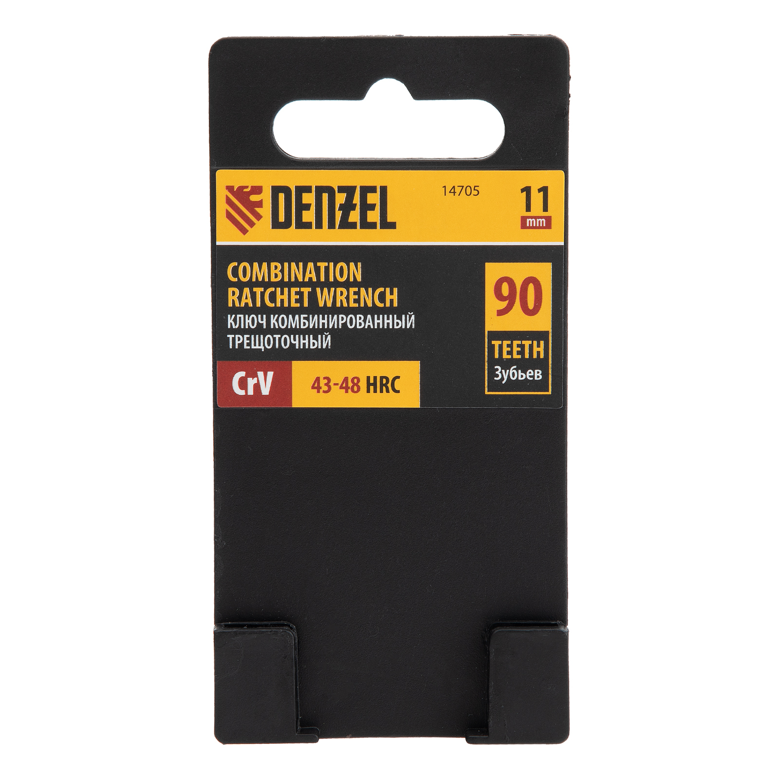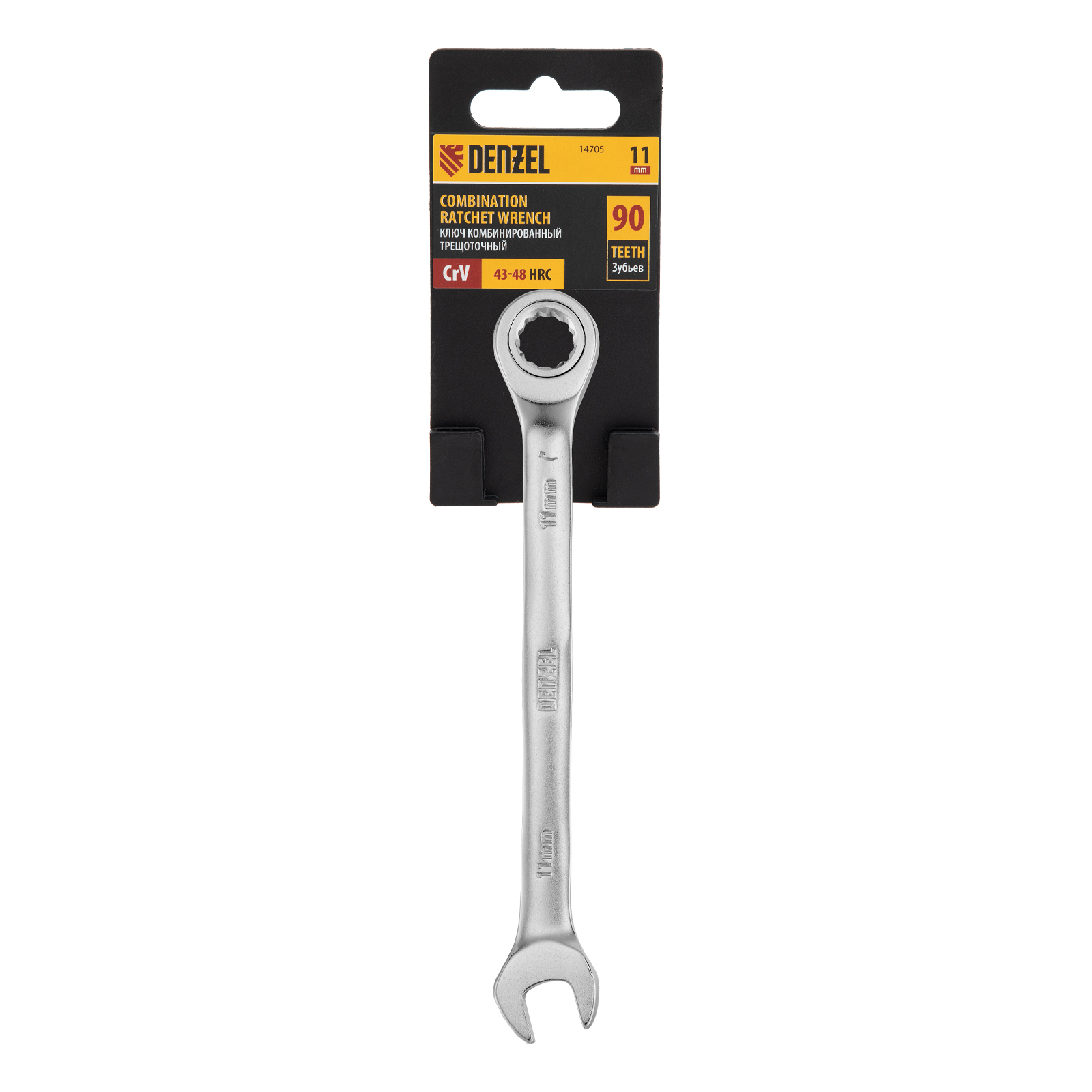 <p>Комбинированный трещоточный ключ Denzel 14705 из стали CrV, с защитным покрытием «матовый хром», предназначен для работы с резьбовым крепежом размером 11 мм. Рожковый профиль упрощает работу в местах, где использование накидной рабочей части невозможно. Хромированное кольцо обеспечивает сохранность и долговечность инструмента. Ключ будет полезен дома, в мастерской и гараже.</p><h2>Преимущества</h2><ul><li>Прочность — инструмент из высококачественной хромованадиевой стали устойчив к механическим воздействиям.</li><li>Деформационная стойкость — рабочие части твердостью 43-48 HRC выдерживают значительные нагрузки.</li><li>Плавное вращение — благодаря храповому механизму с 90 зубьями шаг трещотки составляет всего 4°, инструмент удобен для работы в труднодоступных местах.</li><li>Защита от коррозии — матовое хромовое покрытие предотвращает разрушение и продлевает срок службы инструмента.</li></ul>