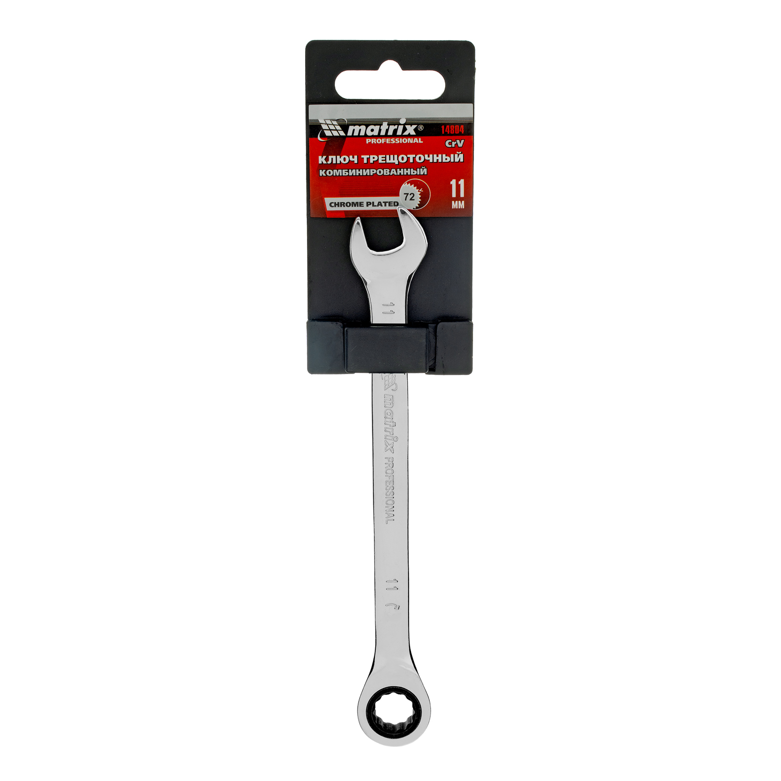 <p>Комбинированный трещоточный ключ Matrix 14804 из стали CrV, с покрытием «зеркальный хром», размером 11 мм, позволяет быстро откручивать и закручивать болты и гайки. Рожковую часть удобно использовать там, где нет возможности полного охвата детали, а трещоточный механизм повышает удобство работы в труднодоступных местах.</p><h2>Преимущества</h2><ul><li>Прочность — ключ из высококачественной стали 40CrV с храповым механизмом твердостью 58 HRC легко выдерживает интенсивные нагрузки.</li><li>Коррозионная стойкость — зеркальное хромоникелевое покрытие защищает инструмент от воздействия влаги.</li><li>Аккуратная работа — накидная часть с 12-гранным профилем полностью охватывает головку крепежа, что снижает риск деформации ее граней.</li></ul>