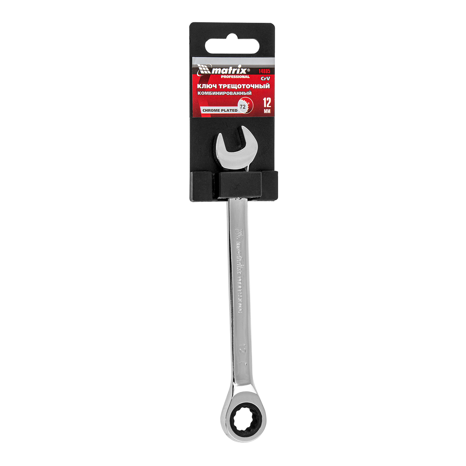 <p>Комбинированный трещоточный ключ Matrix 14805 из стали CrV, с покрытием «зеркальный хром», размером 12 мм, позволяет быстро откручивать и закручивать болты и гайки. Рожковую часть удобно использовать там, где нет возможности полного охвата детали, а трещоточный механизм повышает удобство работы в труднодоступных местах.</p><h2>Преимущества</h2><ul><li>Прочность — ключ из высококачественной стали 40CrV с храповым механизмом твердостью 58 HRC легко выдерживает интенсивные нагрузки.</li><li>Коррозионная стойкость — зеркальное хромоникелевое покрытие защищает инструмент от воздействия влаги.</li><li>Аккуратная работа — накидная часть с 12-гранным профилем полностью охватывает головку крепежа, что снижает риск деформации ее граней.</li></ul>