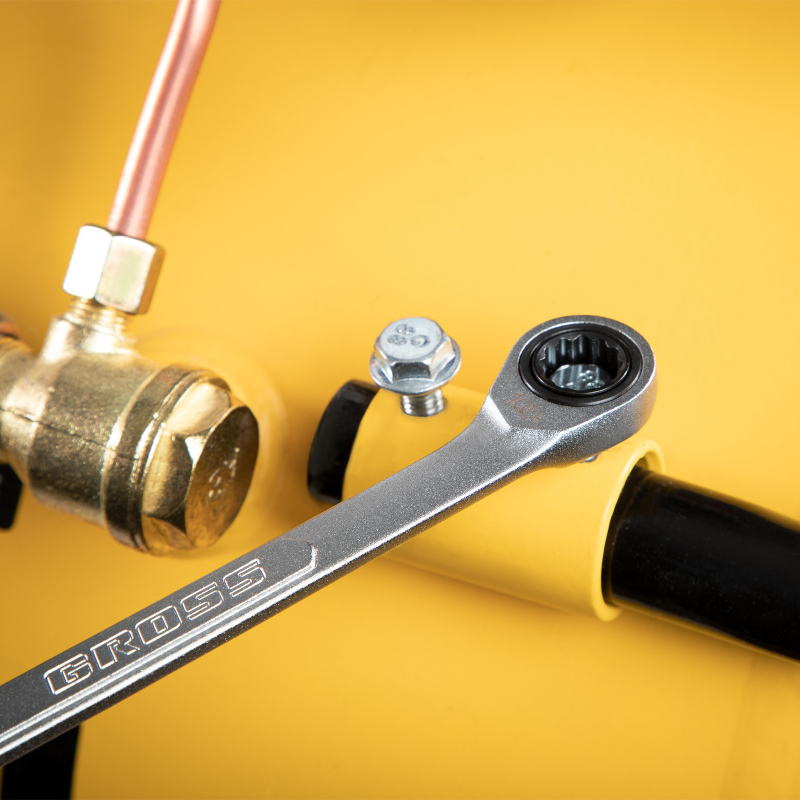 - Храповый механизм оснащен 100 зубцами, что обеспечивает плавность хода инструмента (шаг трещотки всего 3,6 градусов) и делает его удобным для работы в ограниченном пространстве.