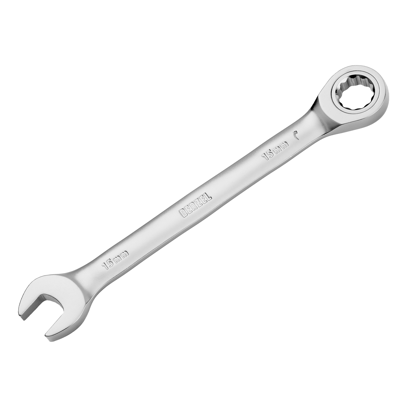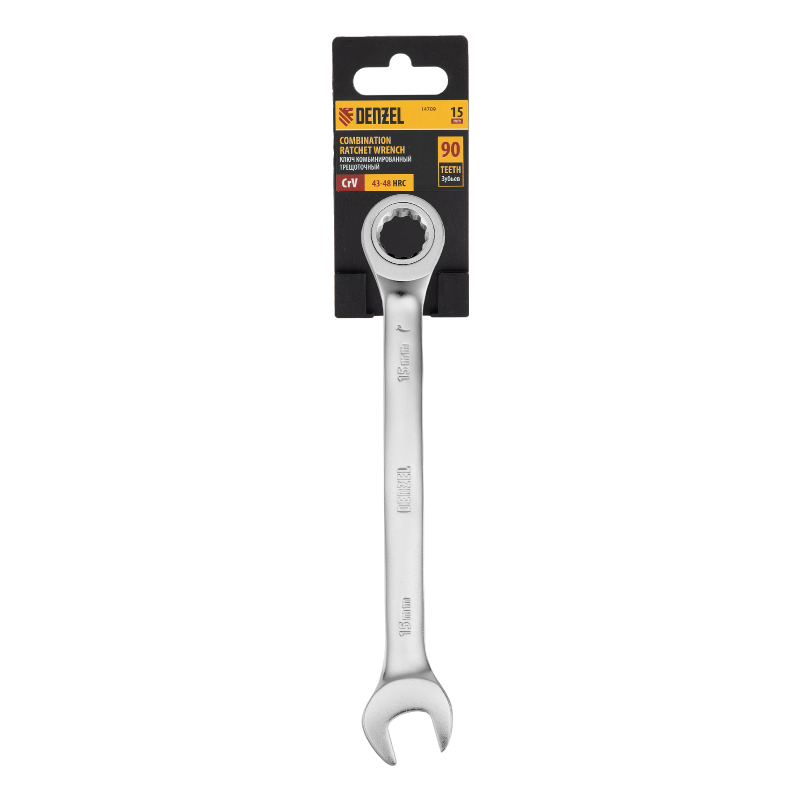 Ключ комбинированный трещоточный, 15 мм, CrV, матовый хром Denzel