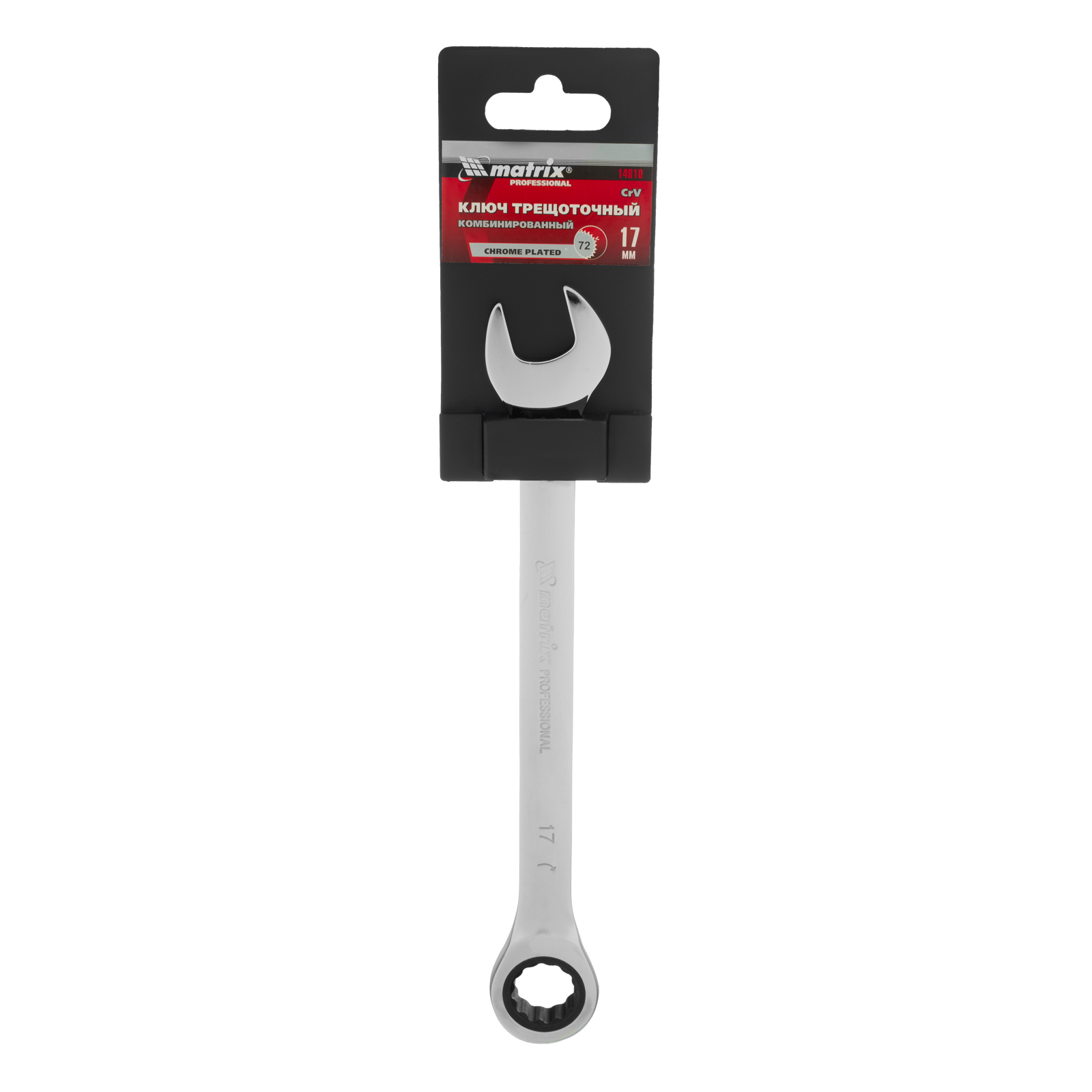 <p>Комбинированный трещоточный ключ Matrix 14810 из стали CrV, с покрытием «зеркальный хром», размером 17 мм, позволяет быстро откручивать и закручивать болты и гайки. Рожковую часть удобно использовать там, где нет возможности полного охвата детали, а трещоточный механизм повышает удобство работы в труднодоступных местах.</p><h2>Преимущества</h2><ul><li>Прочность — ключ из высококачественной стали 40CrV с храповым механизмом твердостью 58 HRC легко выдерживает интенсивные нагрузки.</li><li>Коррозионная стойкость — зеркальное хромоникелевое покрытие защищает инструмент от воздействия влаги.</li><li>Аккуратная работа — накидная часть с 12-гранным профилем полностью охватывает головку крепежа, что снижает риск деформации ее граней.</li></ul>