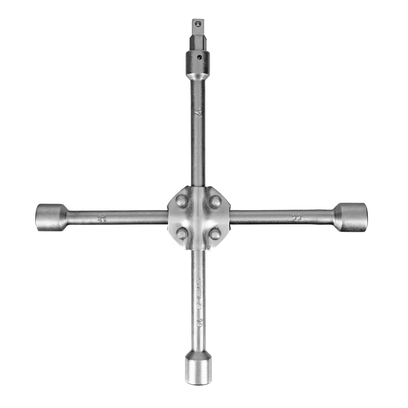 Ключ-крест баллонный, 17 х 19 х 21 х 22 мм, под квадрат 1/2, усиленный, с переходником на 1/2 Stels