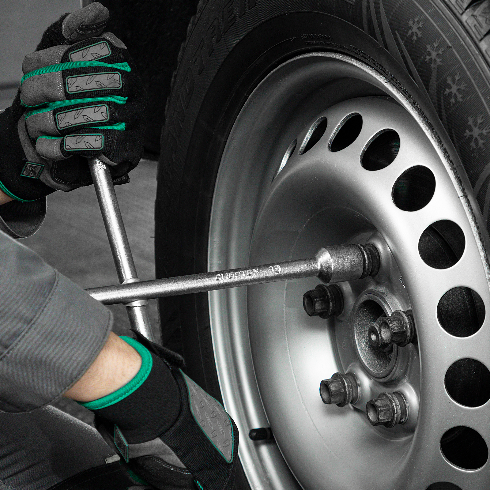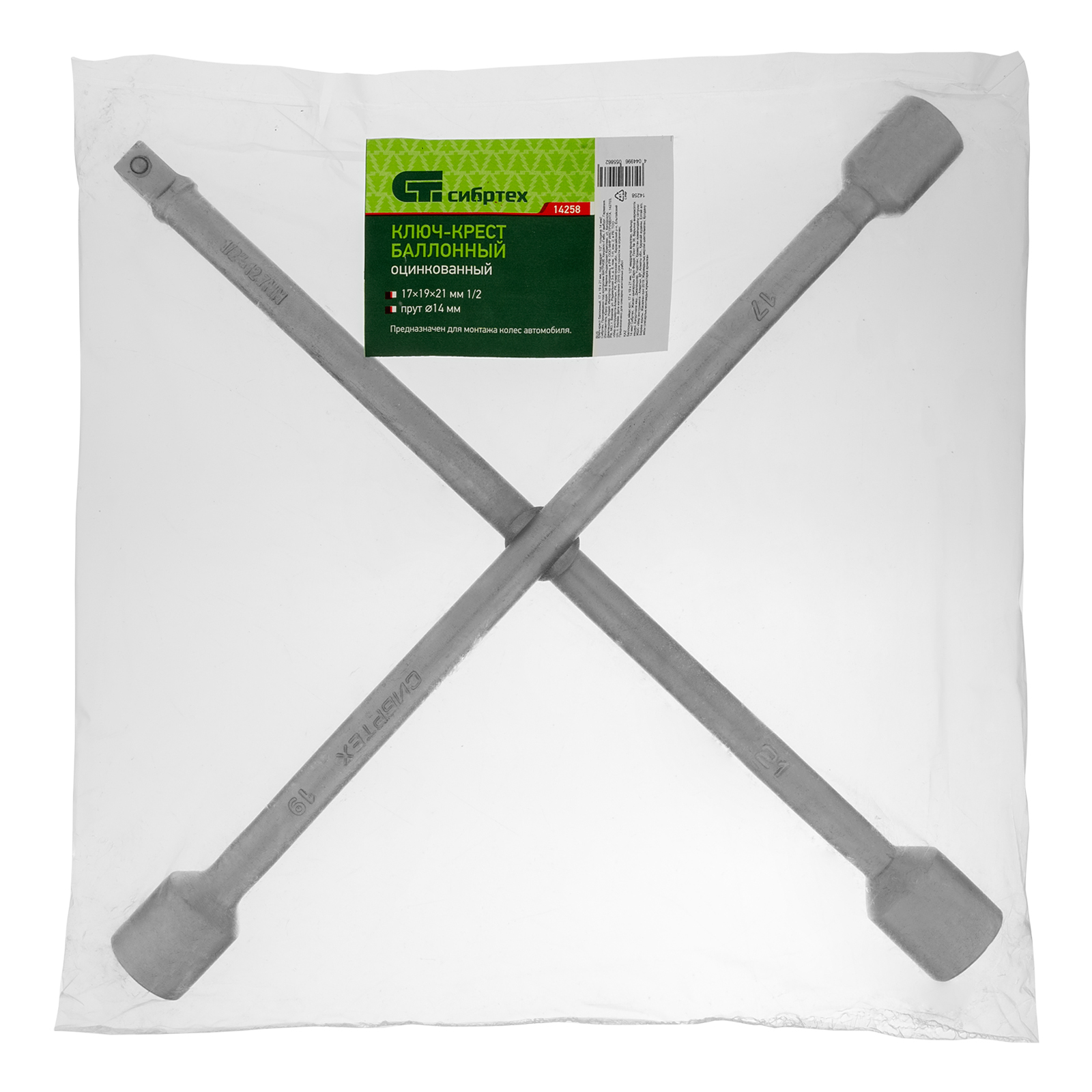 <p>Баллонный ключ-крест Сибртех 14258 под квадрат 1/2", с толщиной прутьев 14 мм и размерами головок 17, 19, 21 мм используется для снятия и монтажа автомобильных колес. 3 несъемные шестигранные торцевые головки подходят для колесных гаек и болтов наиболее распространенных размеров. Инструмент будет полезен работникам станций шиномонтажа и автосервисов, а также пригодится автовладельцам.</p><h2>Преимущества</h2><ul><li>Устойчивость к высоким нагрузкам — прутья толщиной 14 мм сварены под прямым углом.</li><li>Прочность и высокий ресурс — ключ изготовлен из углеродистой стали 40, твердость рабочих частей составляет 41 HRC.</li><li>Антикоррозионная защита — поверхность инструмента хромирована.</li><li>Дополнительные возможности — присоединительный квадрат 1/2" позволяет использовать ключ с любыми торцевыми головками, имеющими посадочное гнездо соответствующего размера.</li></ul>