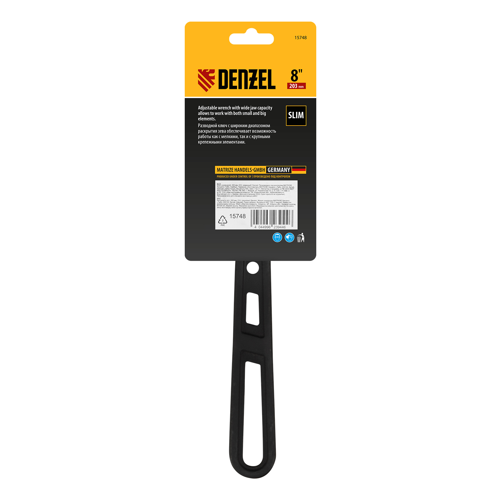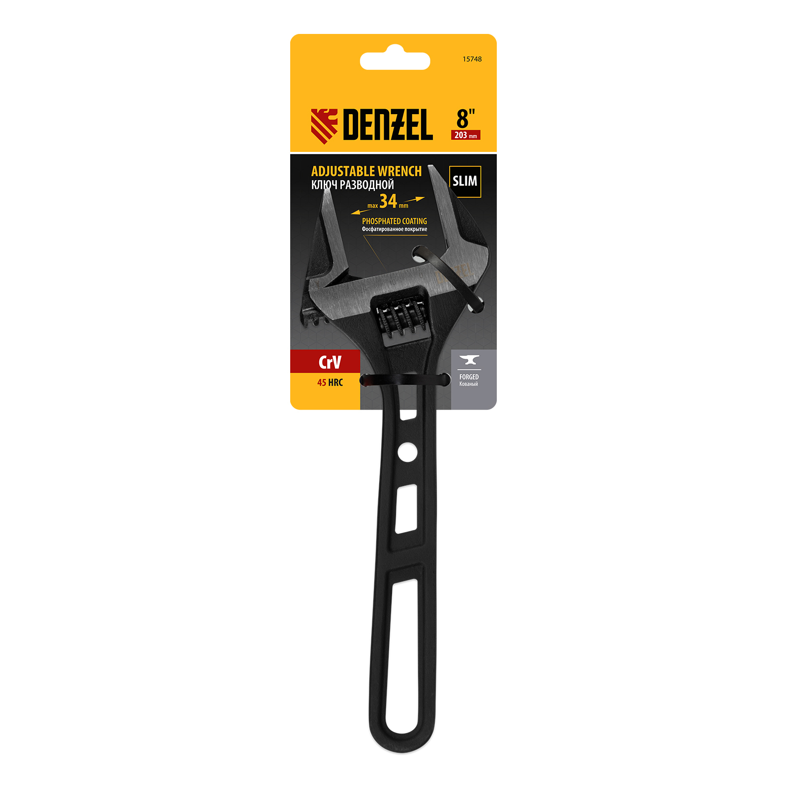 <p>Ключ разводной кованый Denzel 15748 длиной 200 мм, из стали CrV, используется для монтажа и демонтажа крепежных элементов диаметром до 34 мм. Благодаря тонким губкам удобен для работы в труднодоступных местах. Имеет широкую область применения: сантехнические работы, мелкий бытовой ремонт, полупрофессиональная сфера и т. д.</p><h2>Преимущества</h2><ul><li>Прочность и долговечность — ключ изготовлен из закаленной хромованадиевой стали методом ковки.</li><li>Увеличенный ресурс — кованая конструкция усилена дополнительными ребрами жесткости на рукоятке. </li><li>Защита от разрушения — фосфатированная поверхность инструмента не подвержена коррозии.</li><li>Удобная эксплуатация — метрическая линейка на ключе помогает выставить нужный размах зева.</li><li>Возможность подвесного хранения — в рукоятке предусмотрено специальное отверстие.</li></ul>