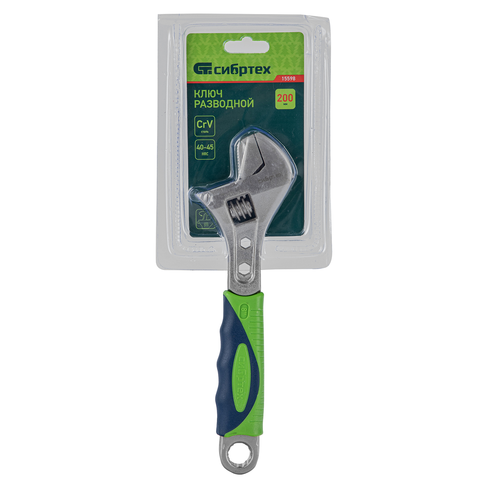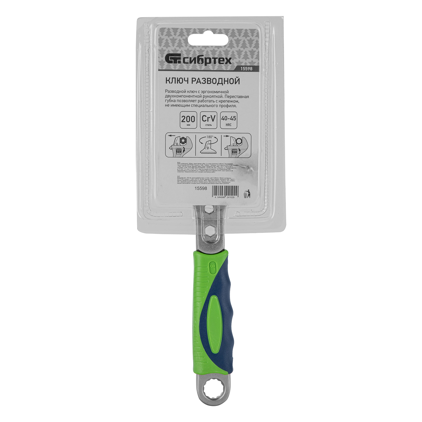 <p>Разводной ключ Сибртех 15598 длиной 200 мм, с переставной губкой и двухкомпонентной рукояткой, предназначен для выполнения монтажных работ. Позволяет справляться с болтами разного размера и способен заменить целый арсенал гаечных ключей. Переставная губка с зазубринами позволяет использовать ключ для работы предметами без специального профиля, например, трубами.</p><h2>Преимущества</h2><ul><li>Прочность и долговечность — ключ изготовлен из закаленной легированной стали, для надежной защиты от коррозии на инструмент нанесено никелевое покрытие.</li><li>Функциональность — миллиметровая шкала и точечная риска позволяют разводить губки на точно заданное расстояние.</li><li>Комфортная работа — двухкомпонентная рукоятка с рифлением и подпальцевыми выемками не выскальзывает из ладони.</li><li>Малый вес 0,32 кг — нагрузка на руку снижена, что позволяет долго работать без усталости.</li></ul>