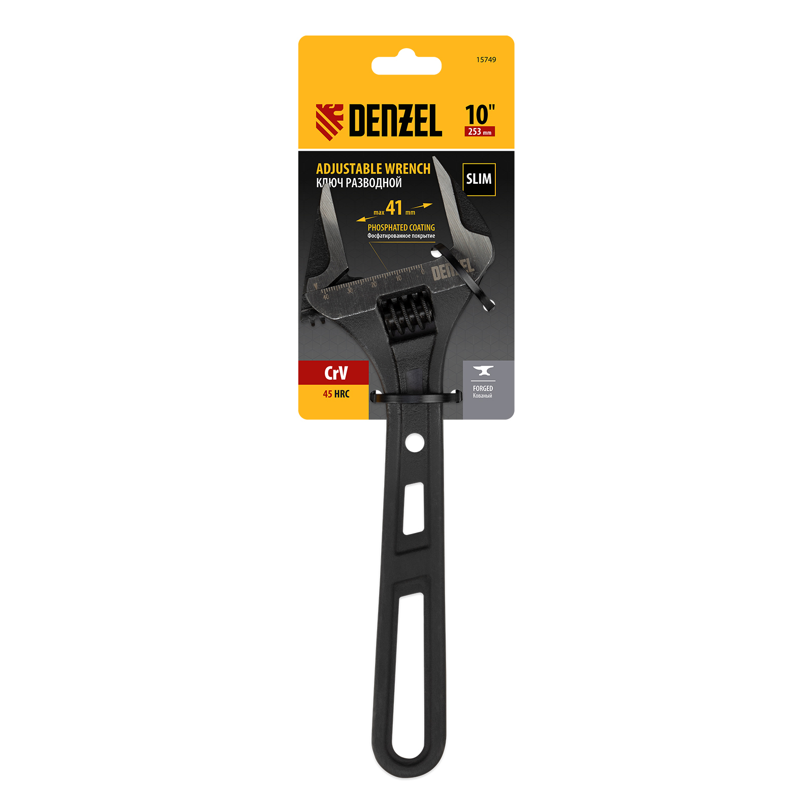 <p>Ключ разводной кованый Denzel 15749 длиной 250 мм, из стали CrV, используется для монтажа и демонтажа крепежных элементов диаметром до 41 мм. Благодаря тонким губкам удобен для работы в труднодоступных местах. Имеет широкую область применения: сантехнические работы, мелкий бытовой ремонт, полупрофессиональная сфера и т. д.</p><h2>Преимущества</h2><ul><li>Прочность и долговечность — ключ изготовлен из закаленной хромованадиевой стали методом ковки.</li><li>Увеличенный ресурс — кованая конструкция усилена дополнительными ребрами жесткости на рукоятке. </li><li>Защита от разрушения — фосфатированная поверхность инструмента не подвержена коррозии.</li><li>Удобная эксплуатация — метрическая линейка на ключе помогает выставить нужный размах зева.</li><li>Возможность подвесного хранения — в рукоятке предусмотрено специальное отверстие.</li></ul>