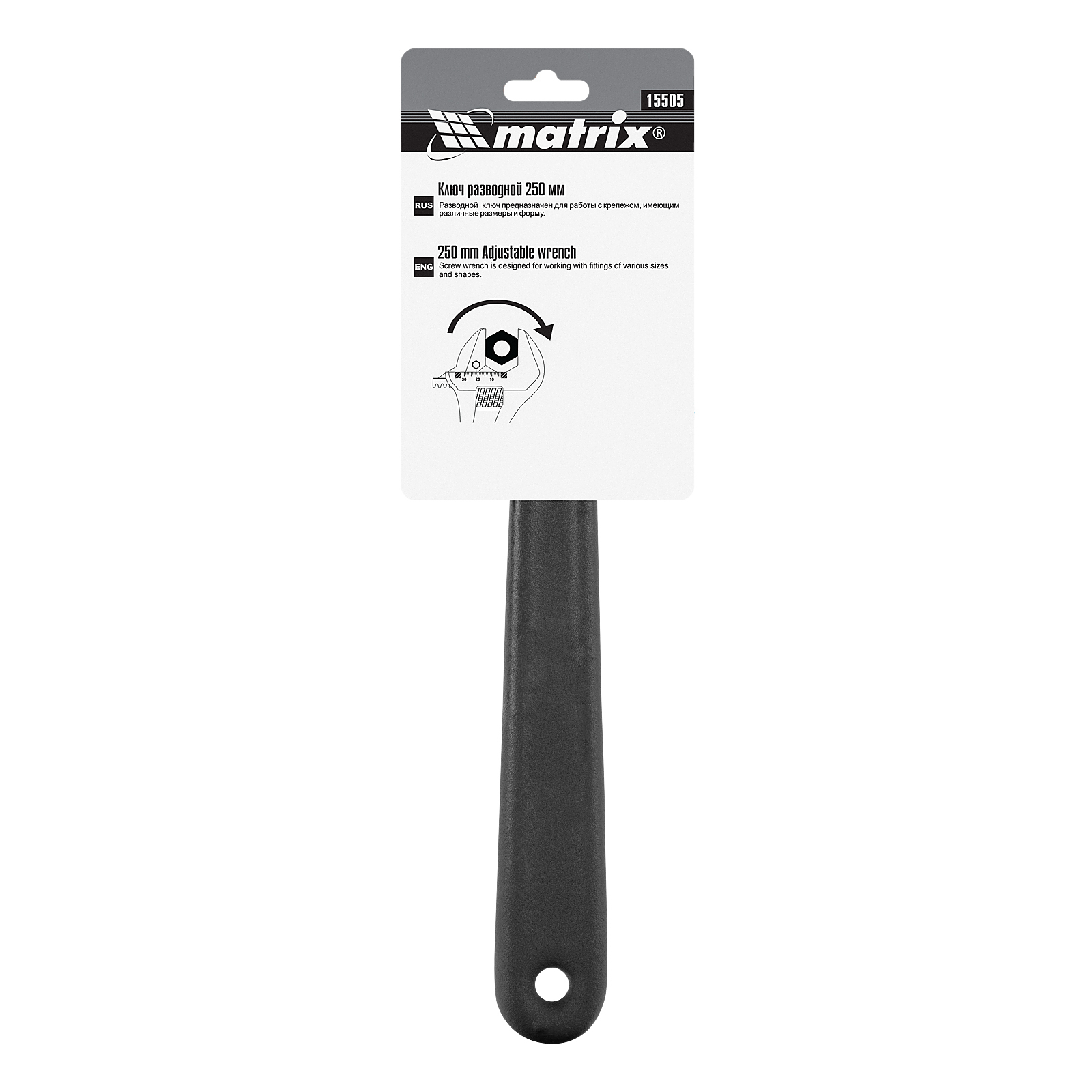 <p>Разводной ключ Matrix 15505 длиной 250 мм используется для монтажа и демонтажа крепежных элементов. Заменяет собой целый комплект обычных гаечных ключей. Губки можно разводить на точно заданное расстояние, что позволяет захватывать детали различного размера. Разводной ключ пригодится для проведения слесарных, сантехнических, ремонтных работ.</p><h2>Преимущества</h2><ul><li>Прочность — ключ изготовлен из высококачественной углеродистой стали 45 и прошел селективную закалку.</li><li>Коррозионная стойкость — фосфатное покрытие защищает червячный винтовой механизм от воздействия влаги.</li><li>Точность выполняемых работ — на губках имеется градуировка и точечная риска.</li><li>Эргономичность — обливная рукоятка удобно ложится в руку и имеет отверстие для подвесного хранения.</li></ul>