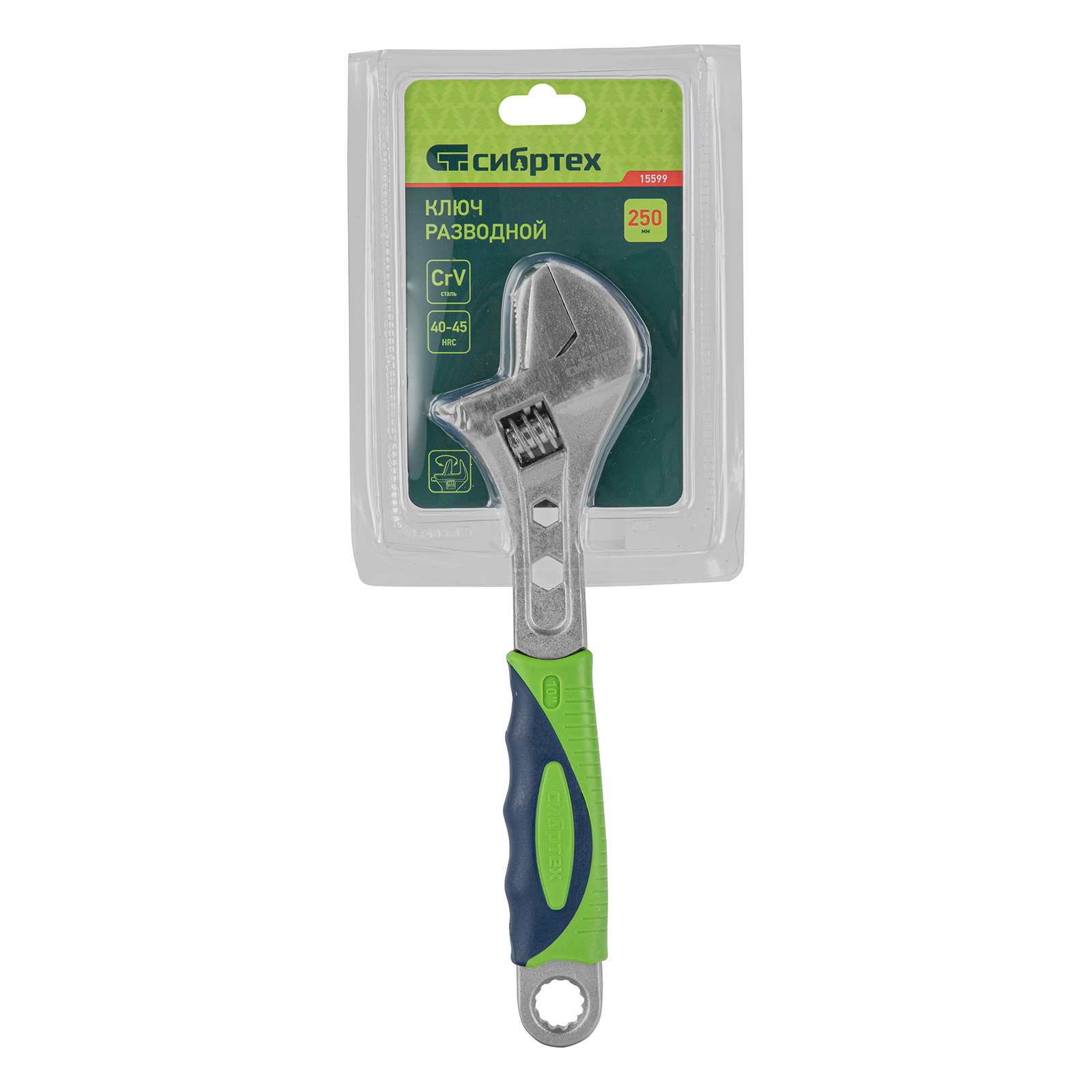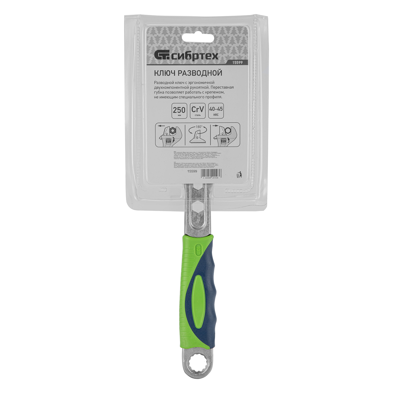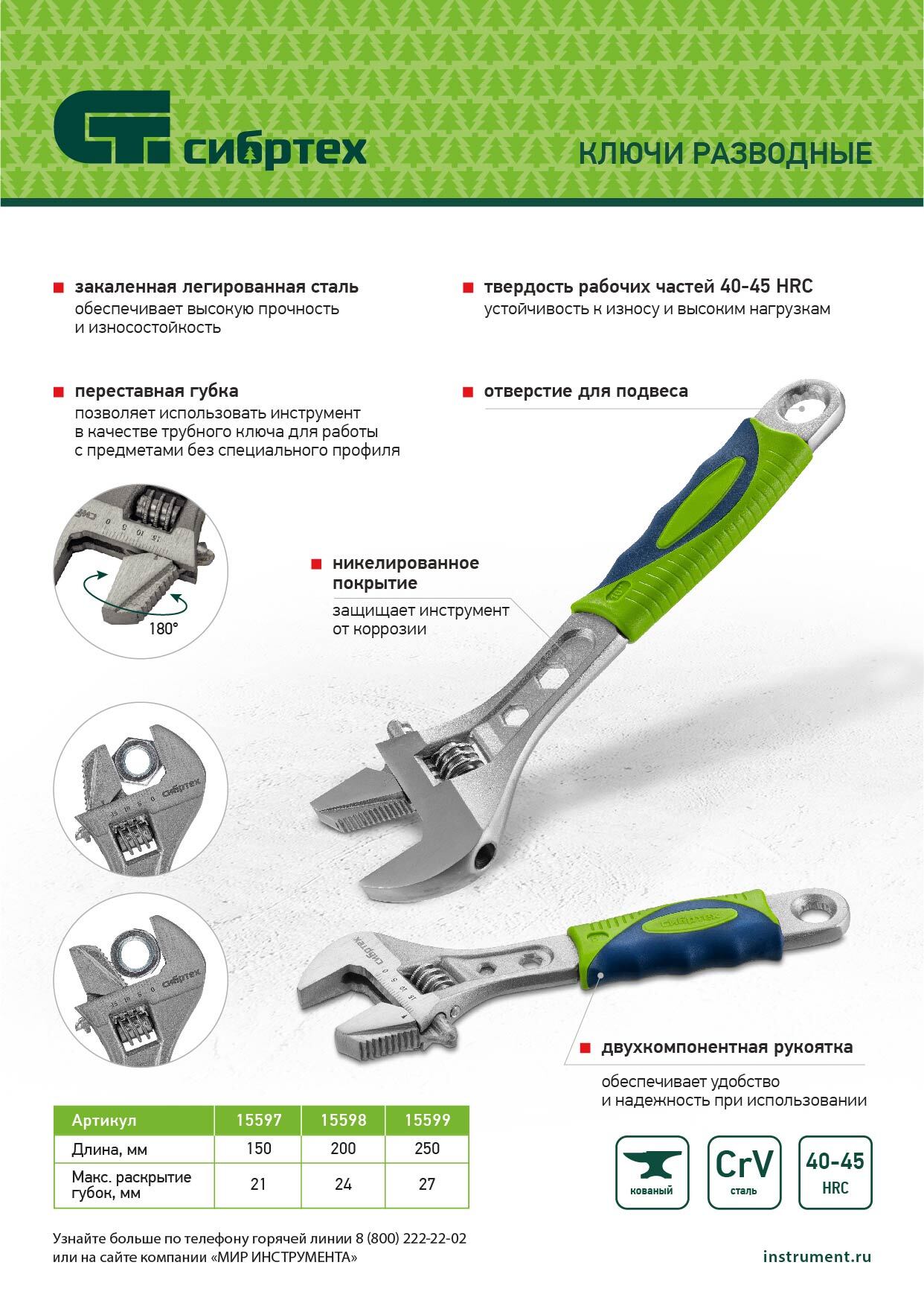 <p>Разводной ключ Сибртех 15599 длиной 250 мм, с переставной губкой и двухкомпонентной рукояткой, предназначен для выполнения монтажных работ. Позволяет справляться с болтами разного размера и способен заменить целый арсенал гаечных ключей. Переставная губка с зазубринами позволяет использовать ключ для работы предметами без специального профиля, например, трубами.</p><h2>Преимущества</h2><ul><li>Прочность и долговечность — ключ изготовлен из закаленной легированной стали, для надежной защиты от коррозии на инструмент нанесено никелевое покрытие.</li><li>Функциональность — миллиметровая шкала и точечная риска позволяют разводить губки на точно заданное расстояние.</li><li>Комфортная работа — двухкомпонентная рукоятка с рифлением и подпальцевыми выемками не выскальзывает из ладони.</li></ul>