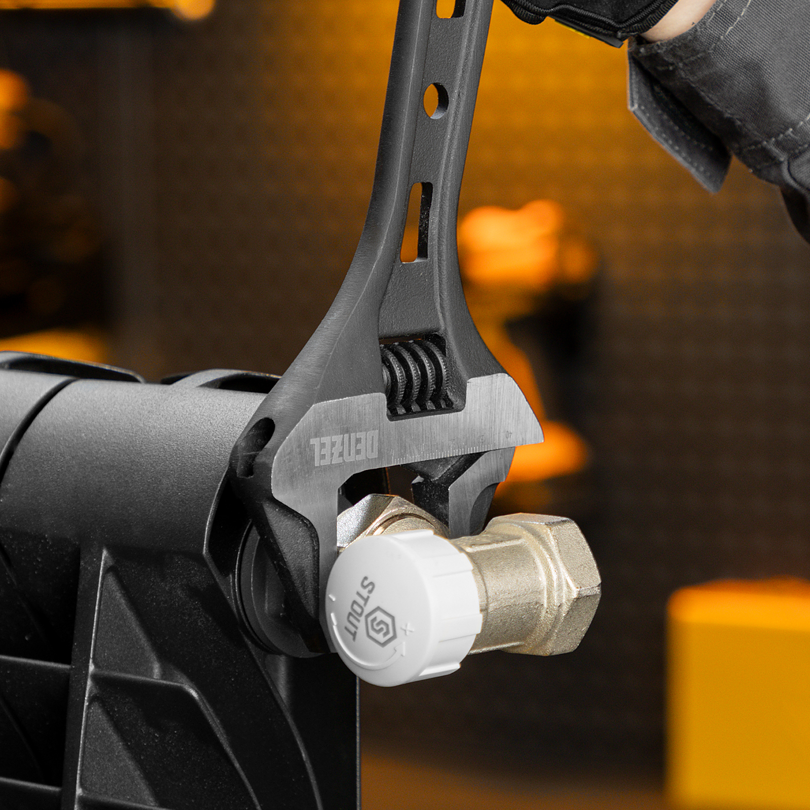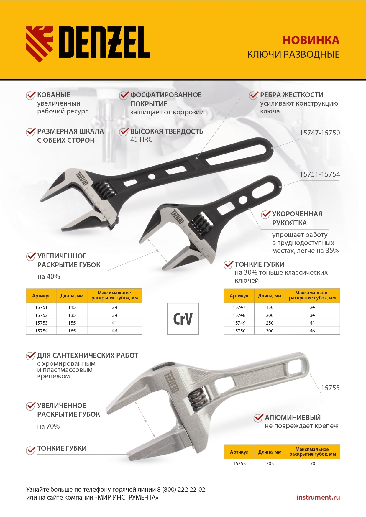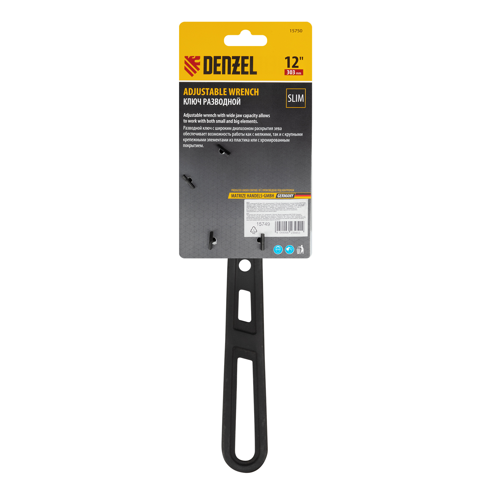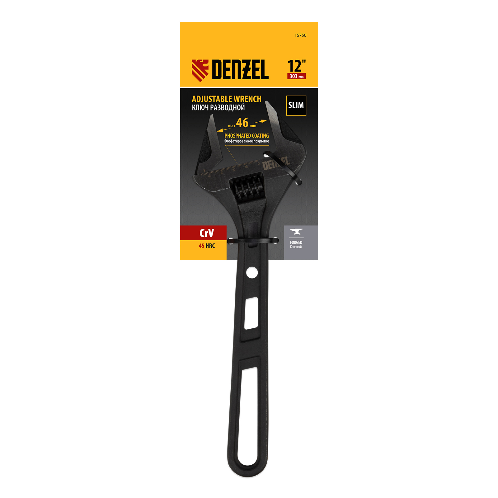 <p>Ключ разводной кованый Denzel 15750 длиной 300 мм, из стали CrV, используется для монтажа и демонтажа крепежных элементов диаметром до 46 мм. Благодаря тонким губкам удобен для работы в труднодоступных местах. Имеет широкую область применения: сантехнические работы, мелкий бытовой ремонт, полупрофессиональная сфера и т. д.</p><h2>Преимущества</h2><ul><li>Прочность и долговечность — ключ изготовлен из закаленной хромованадиевой стали методом ковки.</li><li>Увеличенный ресурс — кованая конструкция усилена дополнительными ребрами жесткости на рукоятке. </li><li>Защита от разрушения — фосфатированная поверхность инструмента не подвержена коррозии.</li><li>Удобная эксплуатация — метрическая линейка на ключе помогает выставить нужный размах зева.</li><li>Возможность подвесного хранения — в рукоятке предусмотрено специальное отверстие.</li></ul>